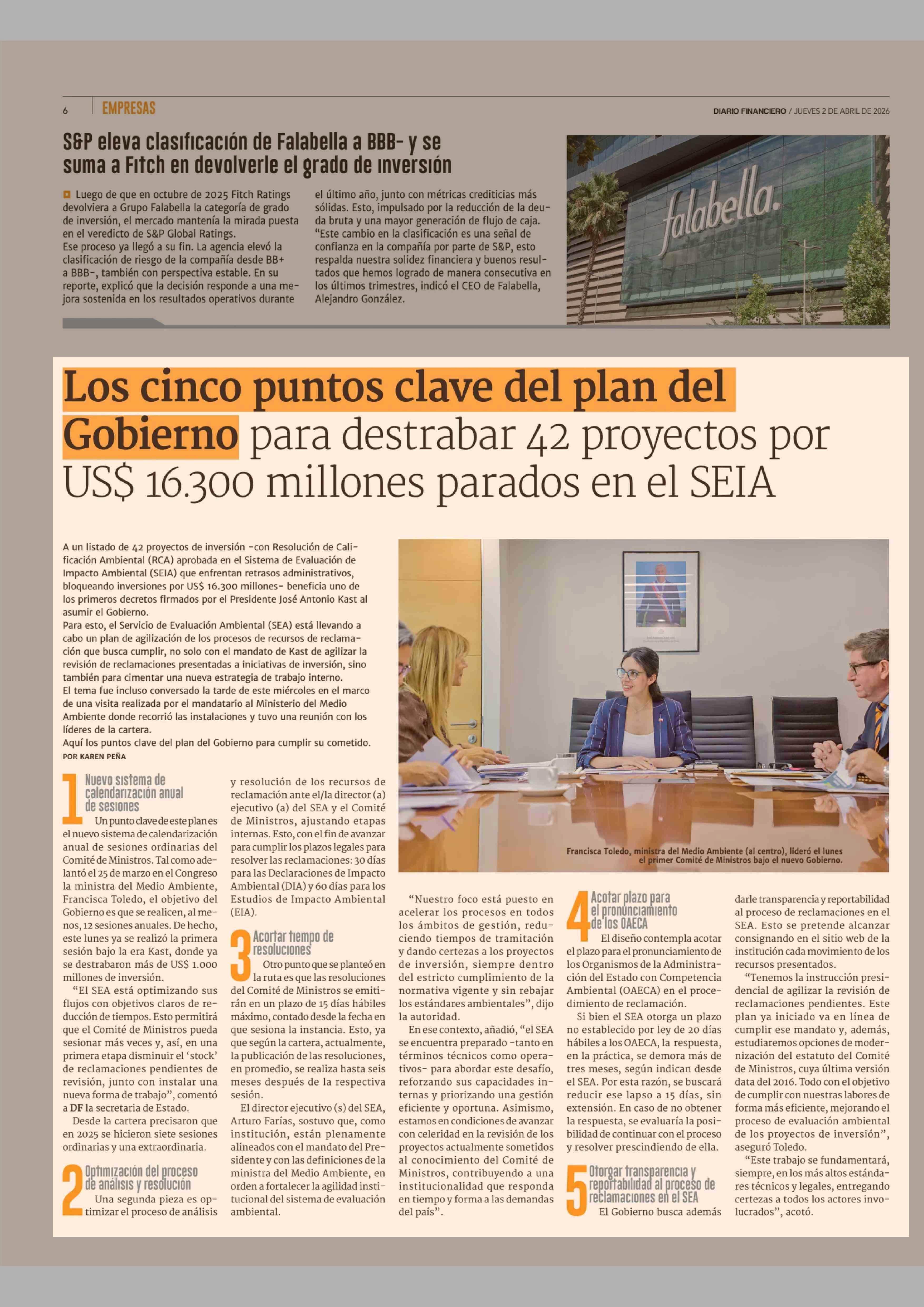 Los cinco puntos clave del plan del Gobierno para destrabar 42 proyectos por US$ 16.300 millones parados en el SEIA 02-04-2026 Diario Financiero |