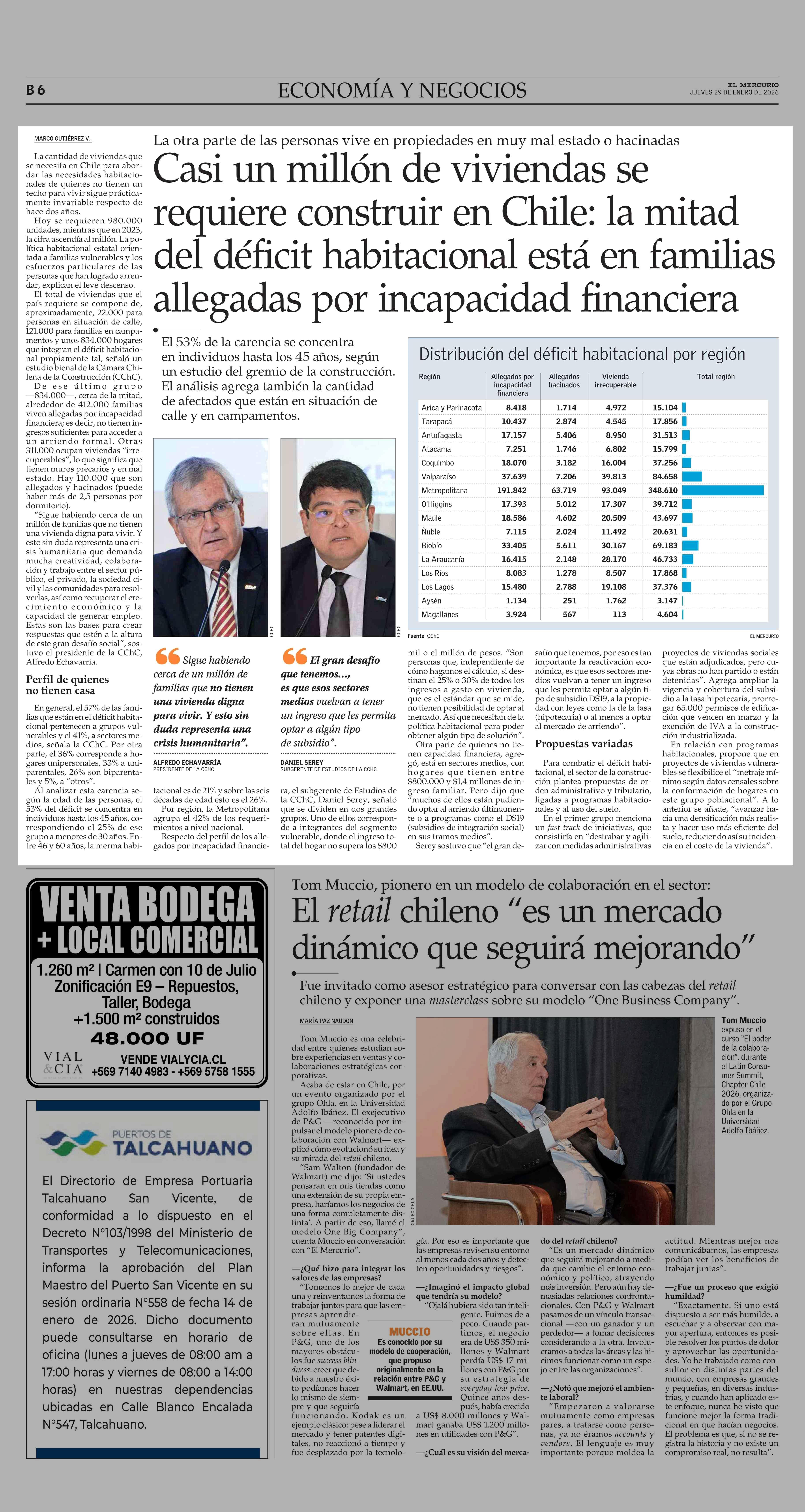 Casi un millón de viviendas se requiere construir en Chile: la mitad del déficit habitacional está en familias allegadas por incapacidad financiera 29-01-2026 El Mercurio |