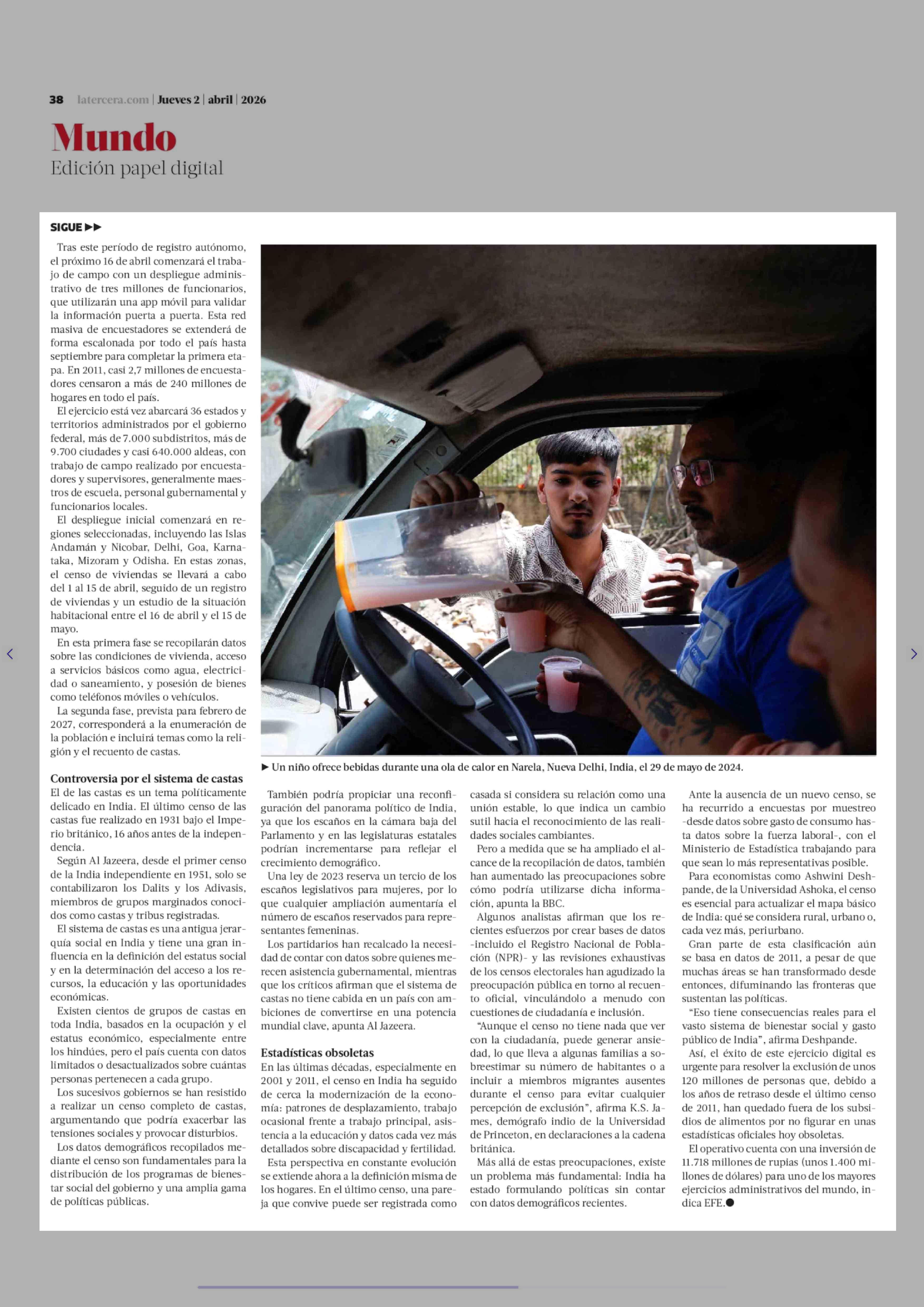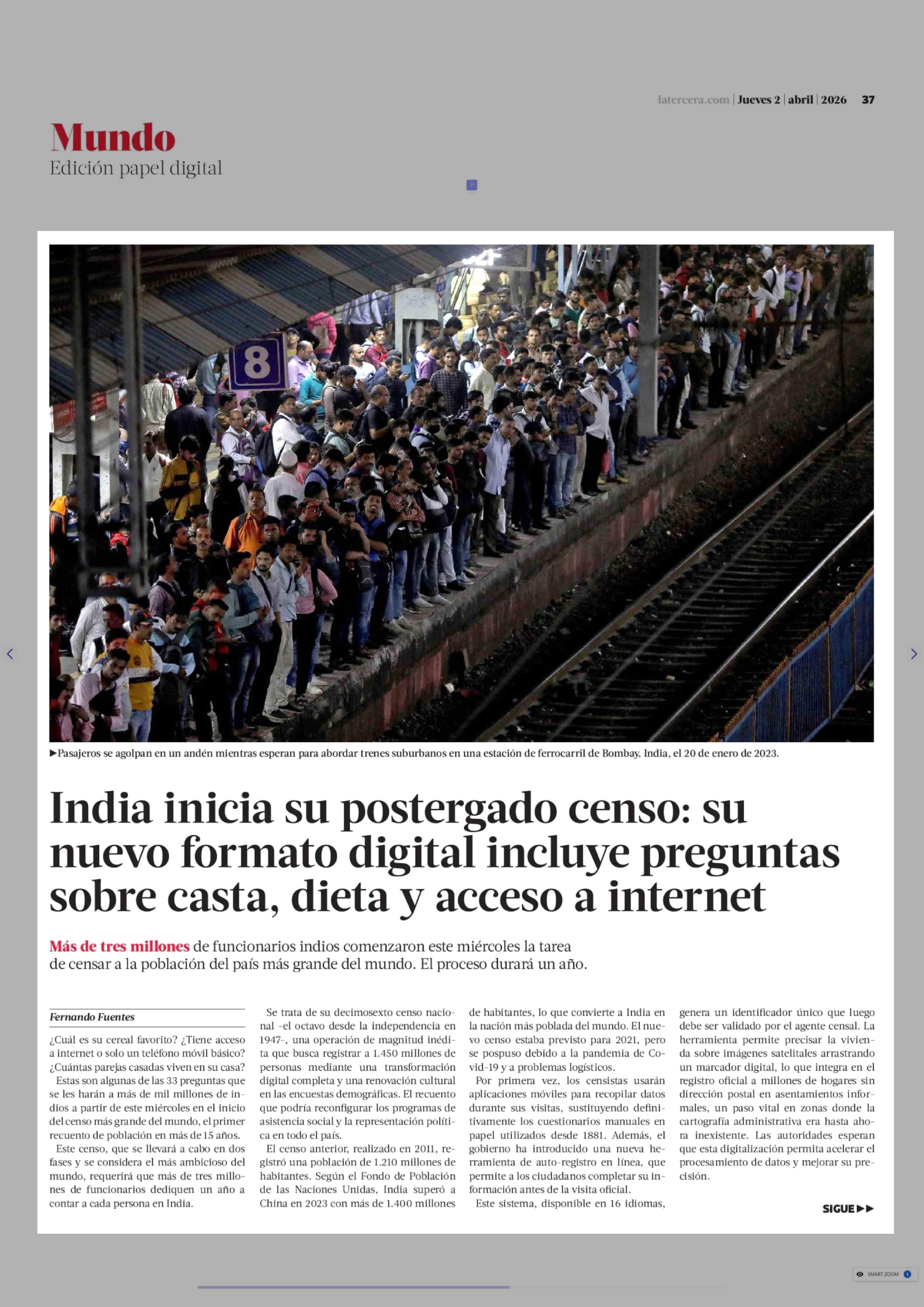 Título: India inicia su postergado censo: su nuevo formato digital incluye preguntas sobre casta, dieta y acceso a internet