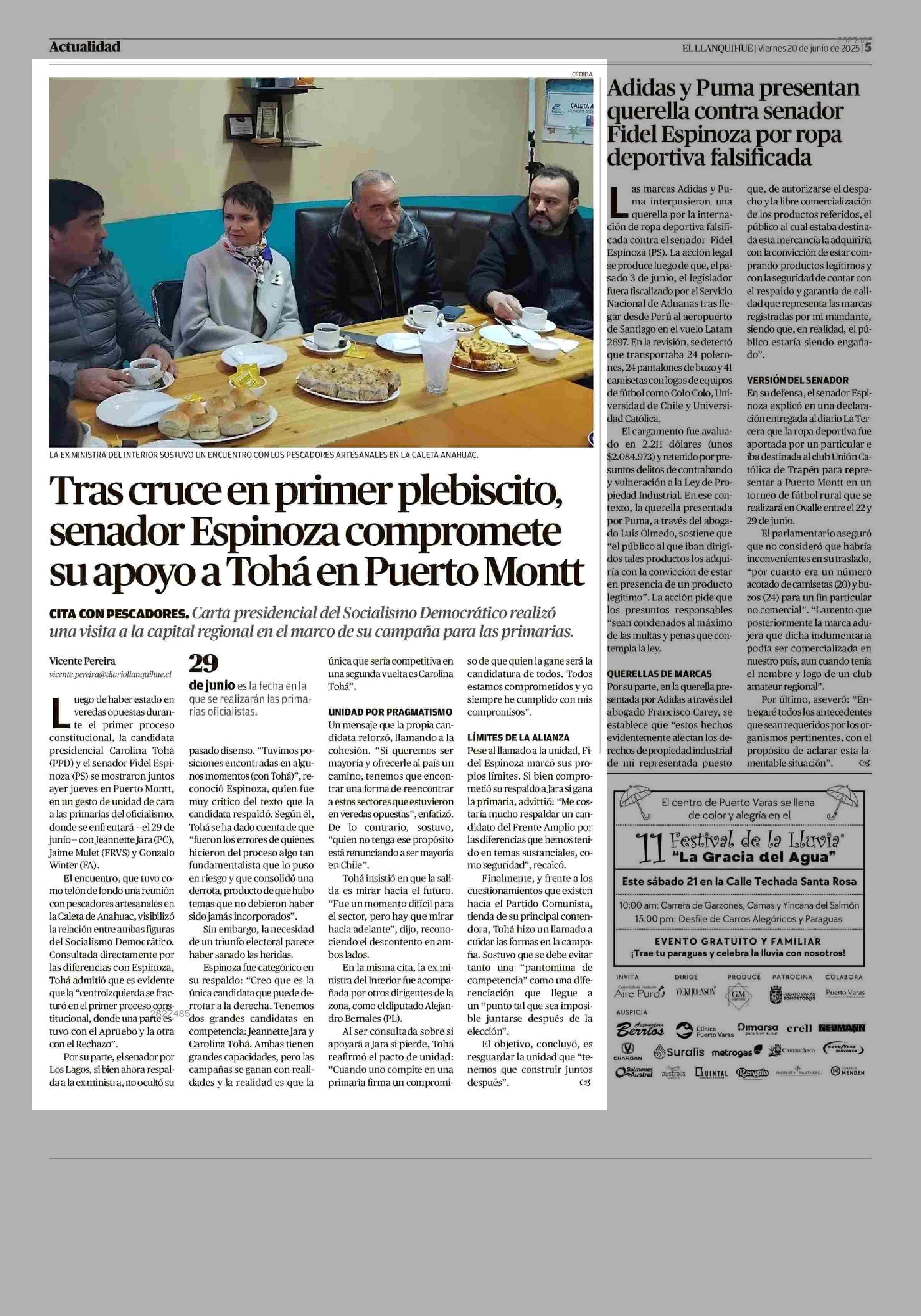 Tras cruce en primer plebiscito, senador Espinoza compromete su apoyo a Tohá en Puerto Montt 20-06-2025 El Llanquihue |