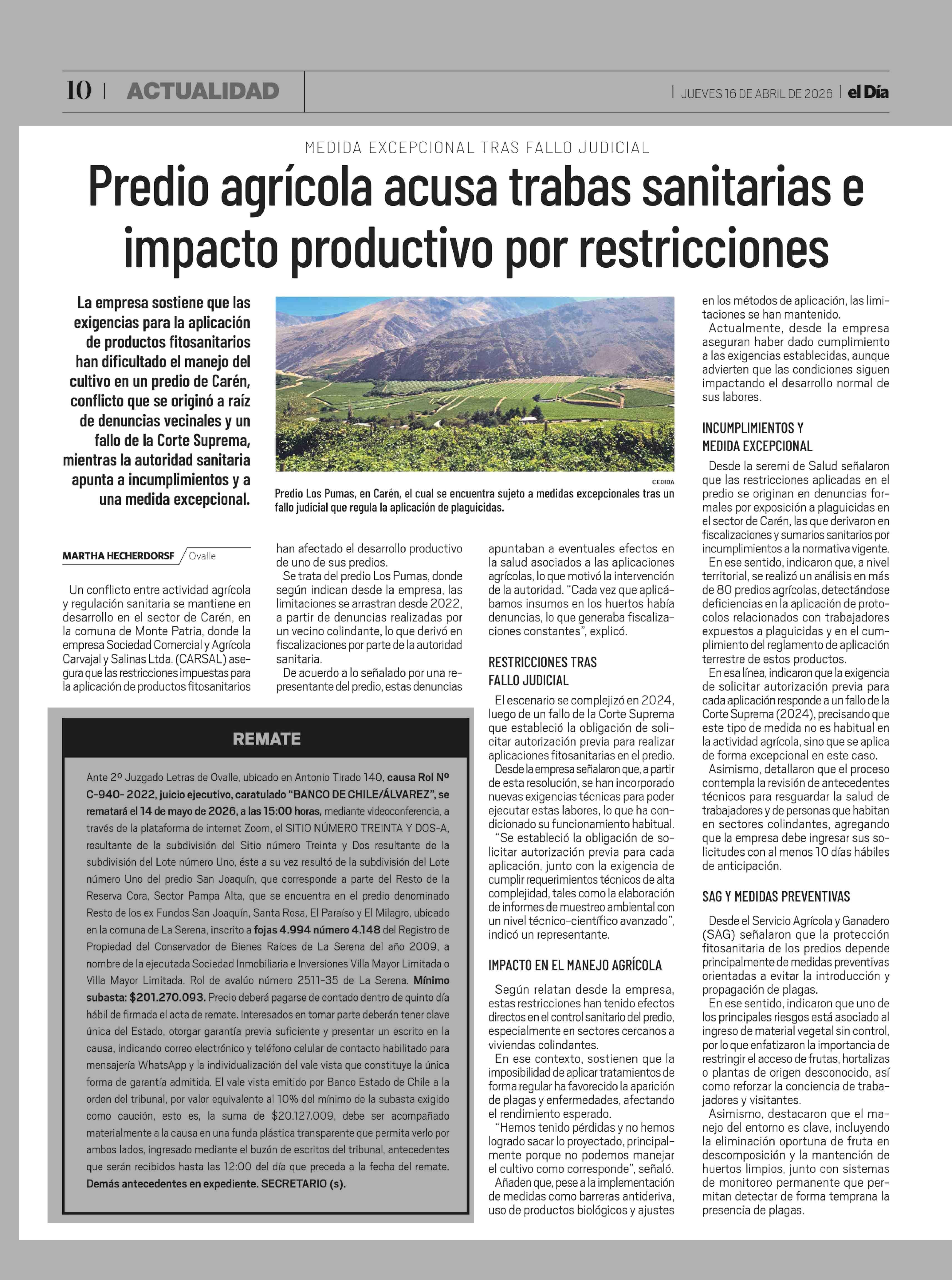 Título: Predio agrícola acusa trabas sanitarias e impacto productivo por restricciones