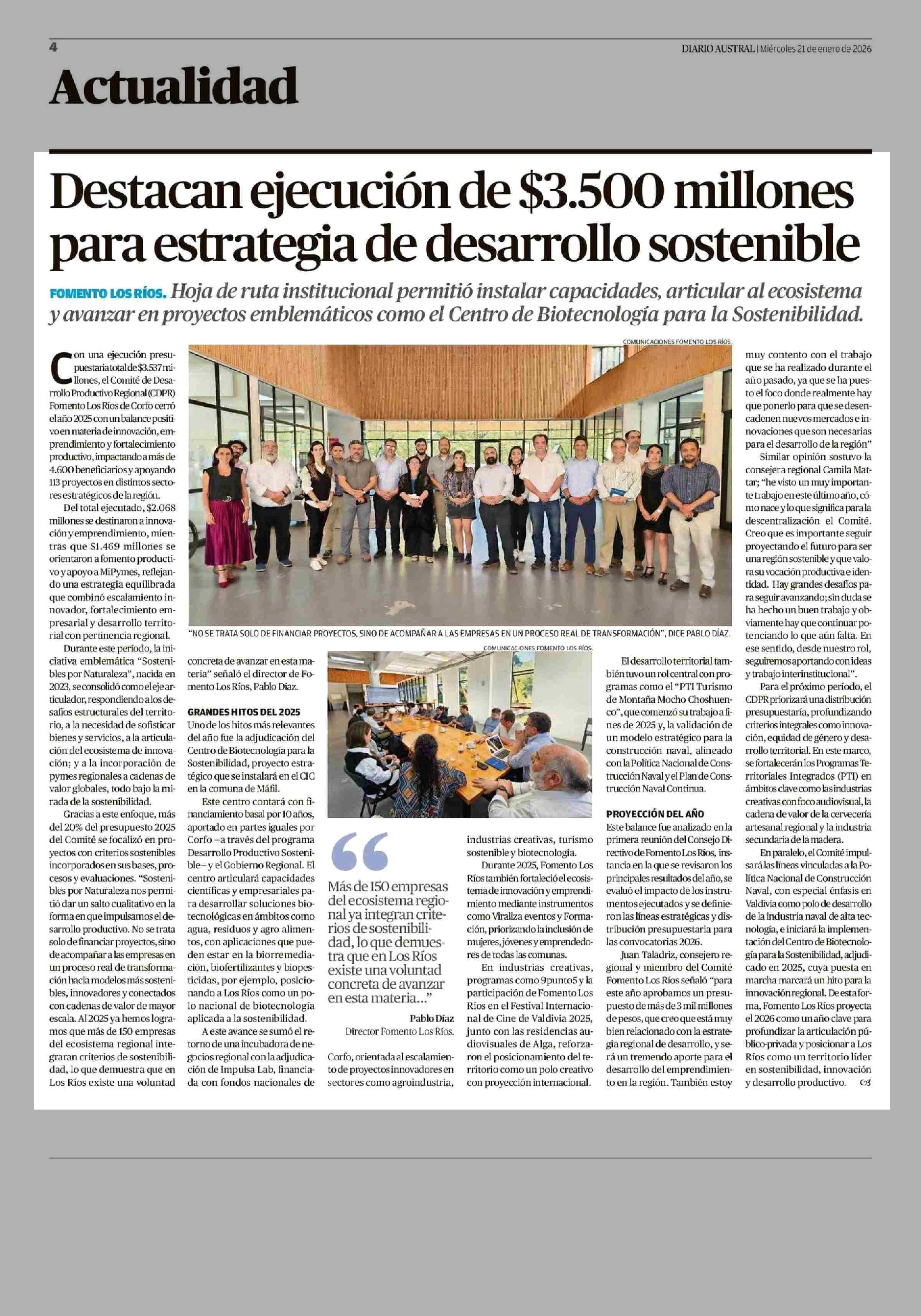 Destacan ejecución de $3.500 millones para estrategia de desarrollo sostenible 21-01-2026 Diario Austral Región de Los Ríos |