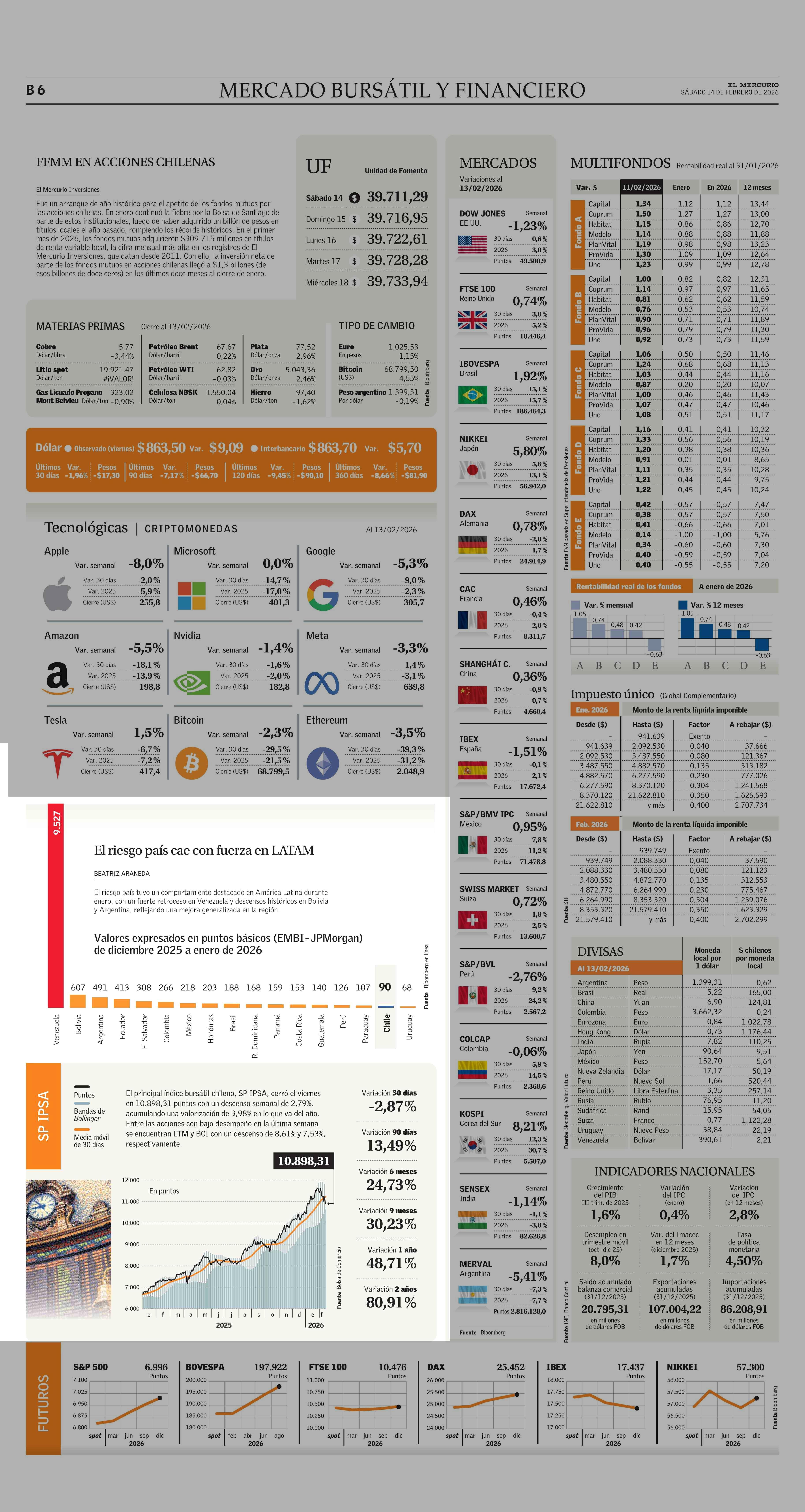 El riesgo país cae con fuerza en LATAM 14-02-2026 El Mercurio |