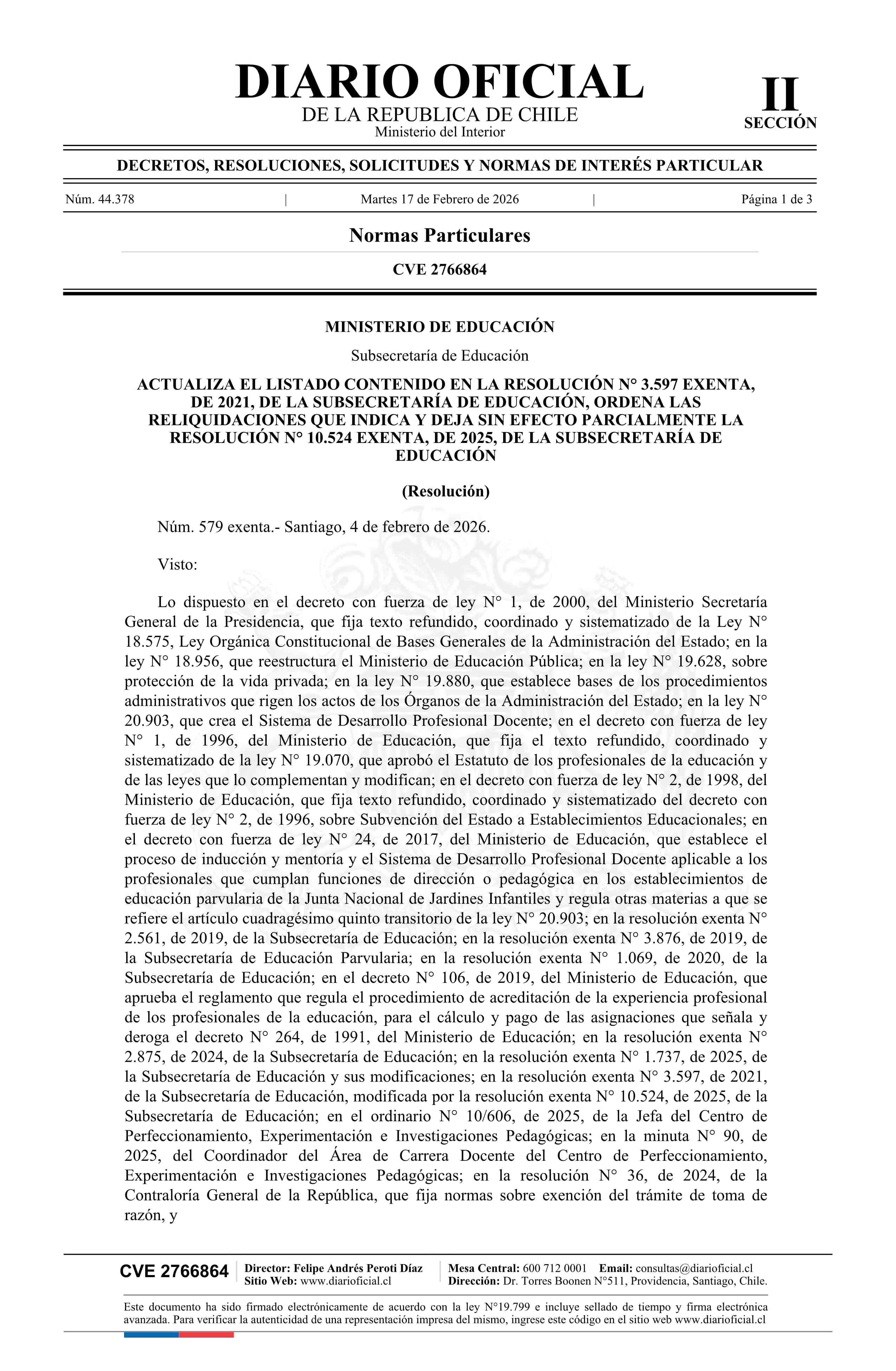 Título: Resolución exenta número 579, de 2026.- Actualiza el listado contenido en la resolución N° 3.597 exenta, de 2021, ordena las reliquidaciones que indica y deja sin efecto parcialmente la resolución N° 10.524 exenta, de 2025