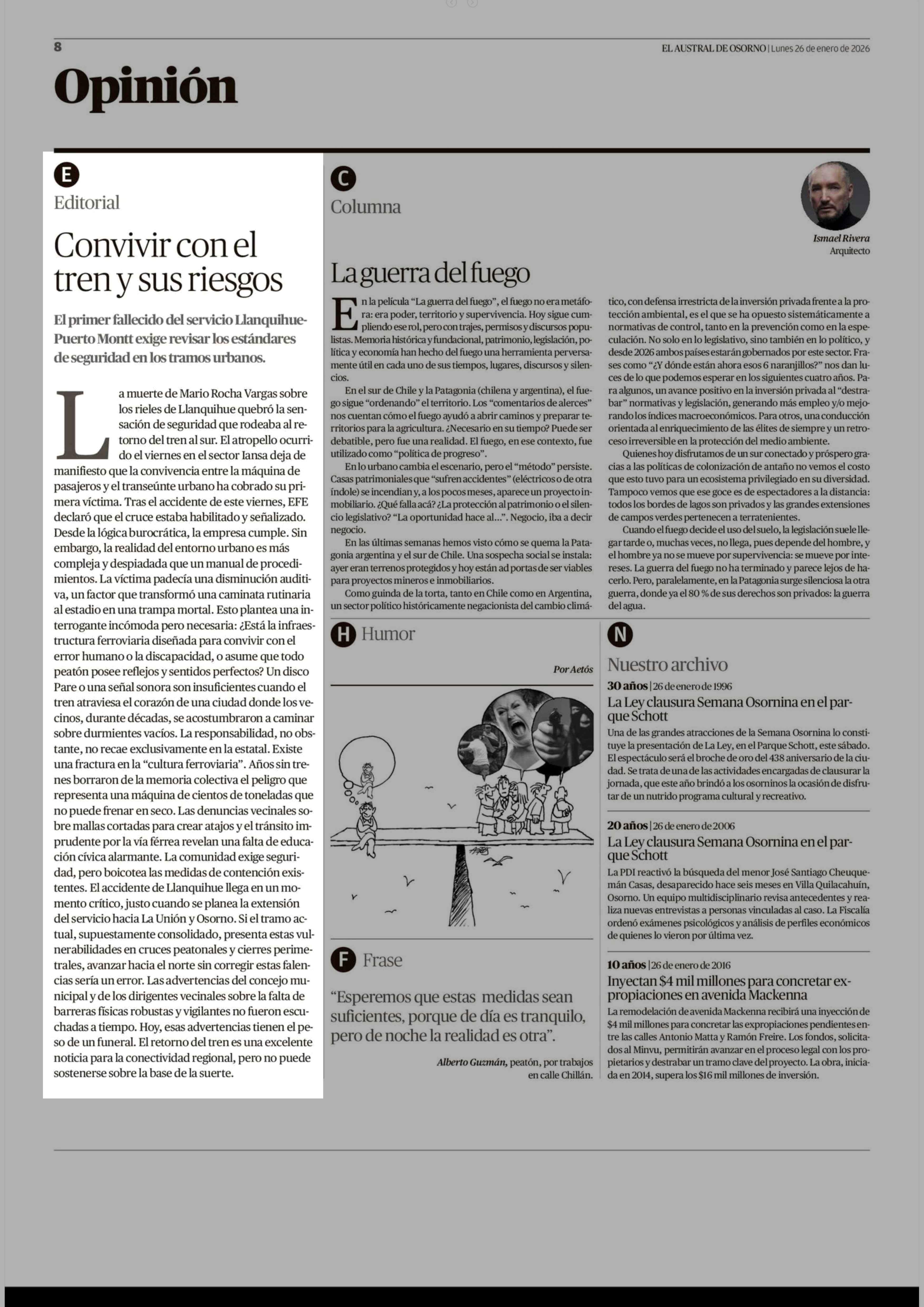 Editorial: Convivir con el tren y sus riesgos 26-01-2026 El Austral de Osorno |