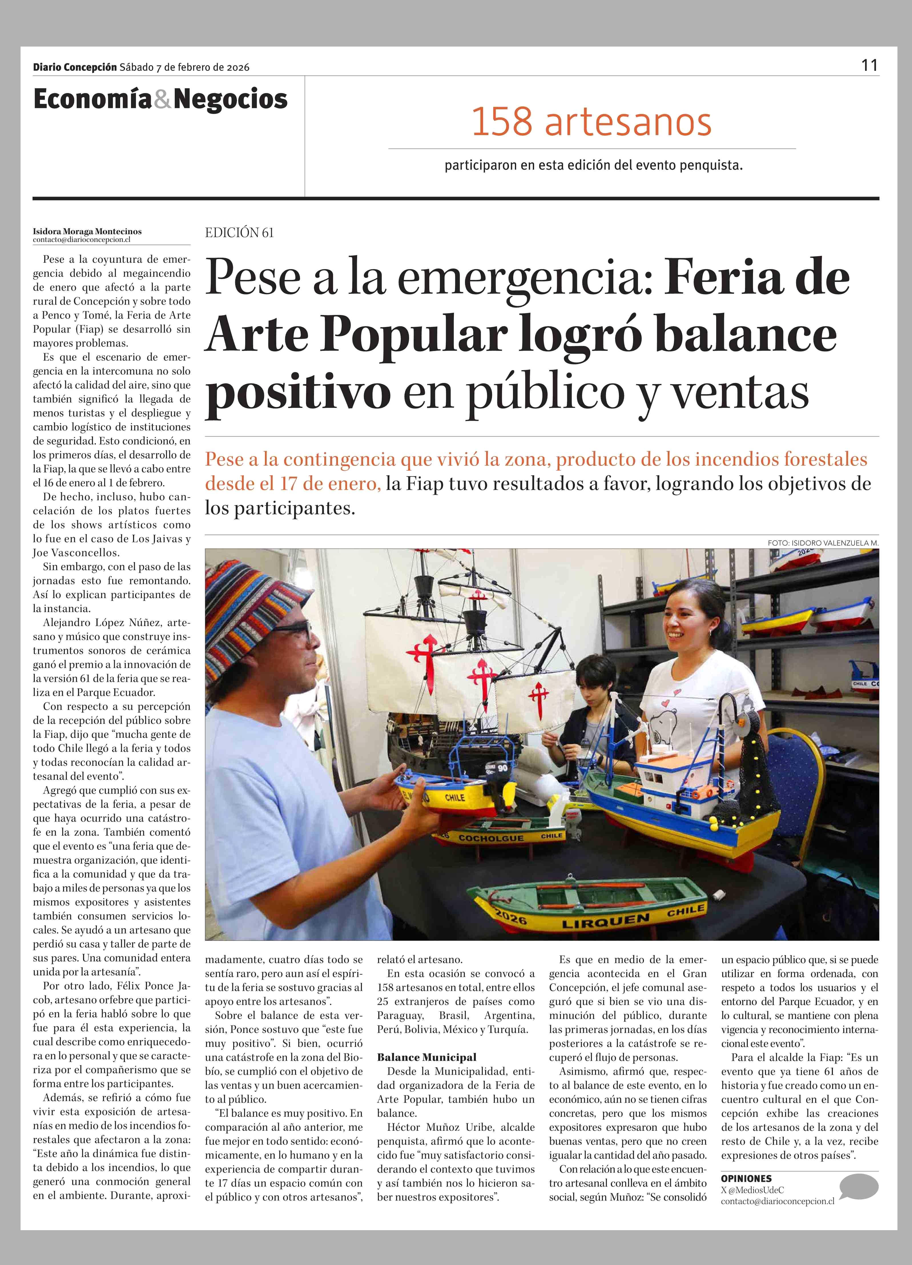 Pese a la emergencia: Feria de Arte Popular logró balance positivo en público y ventas 07-02-2026 Diario Concepción |