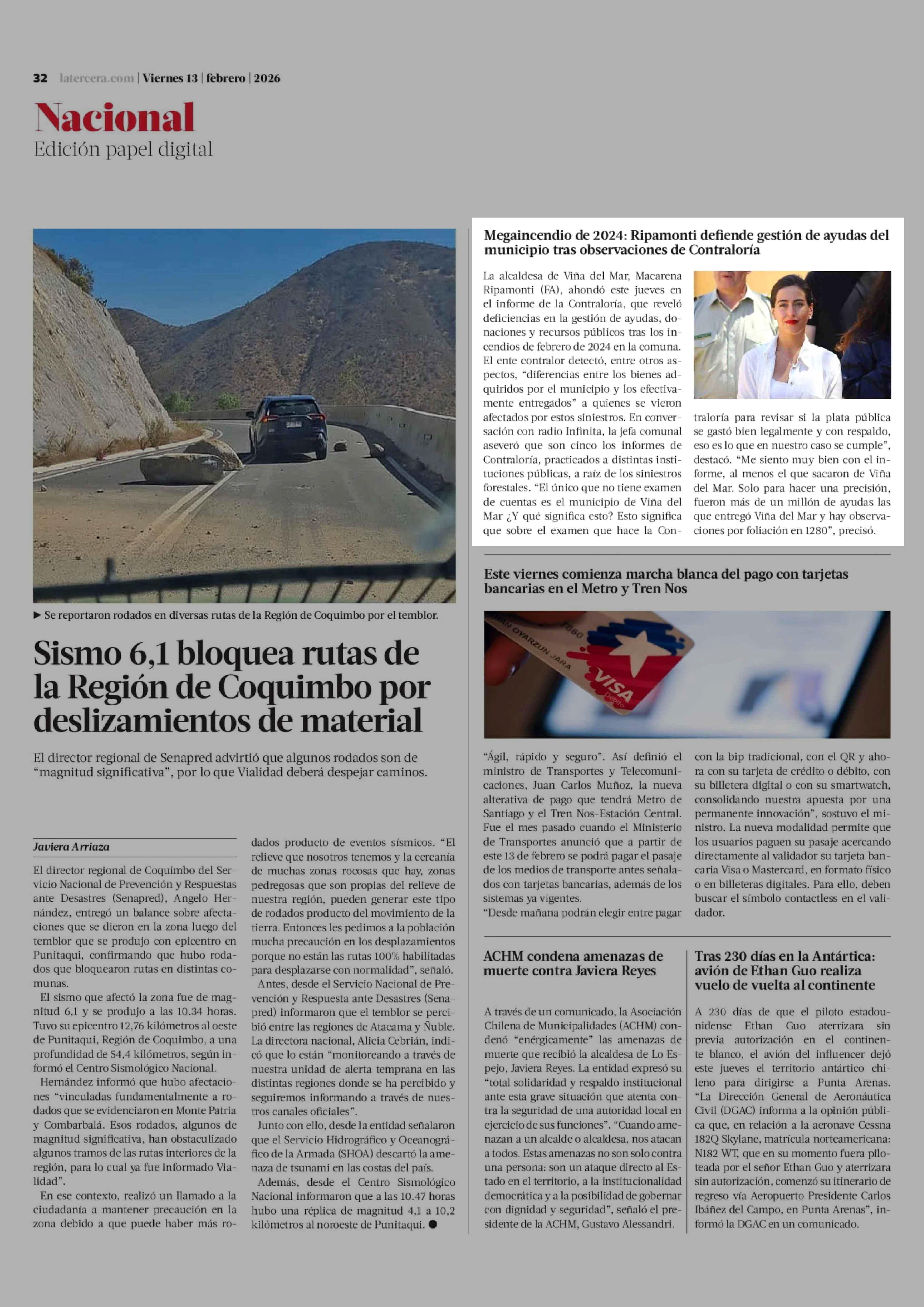 Megaincendio de 2024: Ripamonti defiende gestión de ayudas del municipio tras observaciones de Contraloría 13-02-2026 La Tercera |