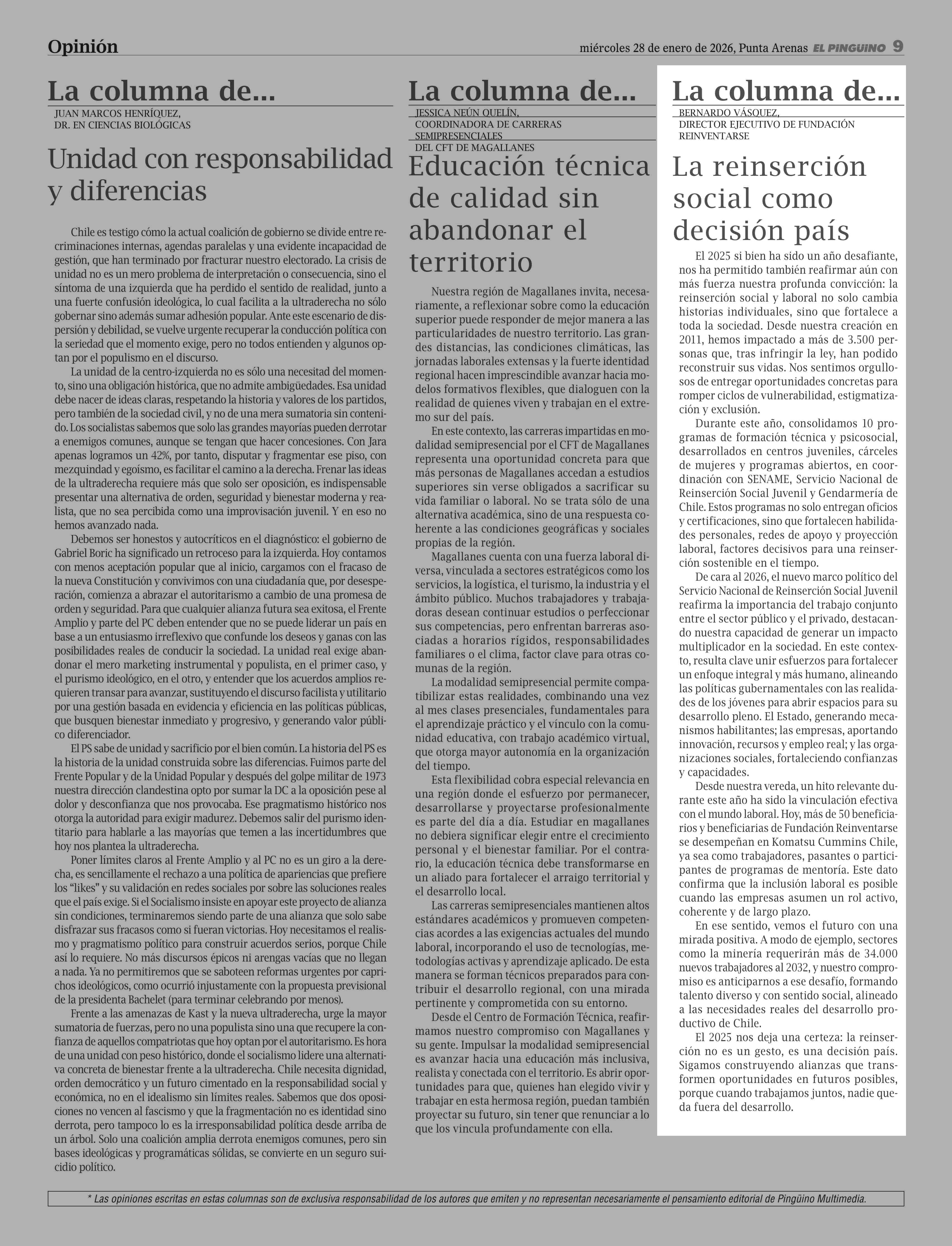 Columnas de Opinión: La reinserción social como decisión país 28-01-2026 El Pingüino |