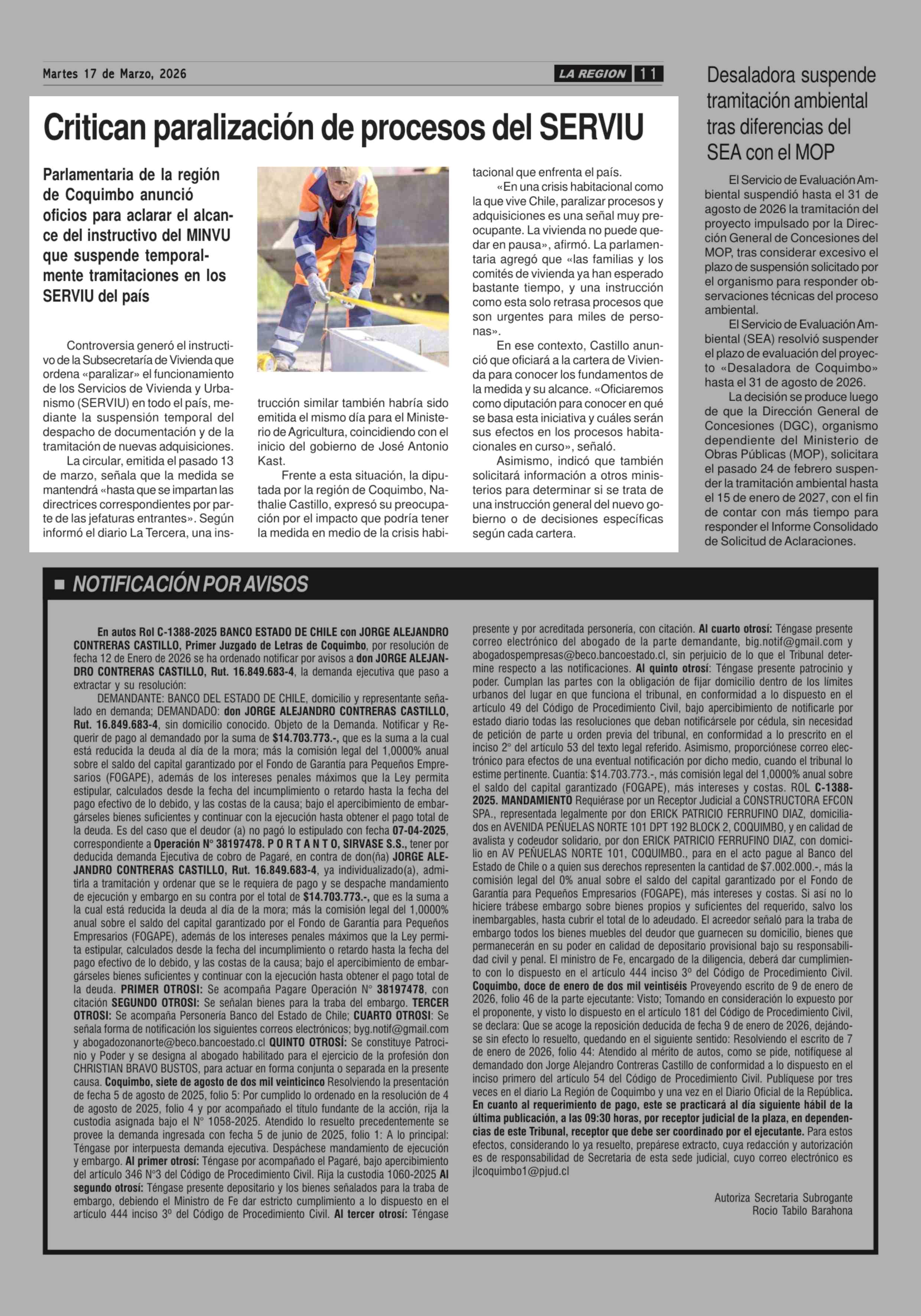 Critican paralización de procesos del SERVIU 17-03-2026 Diario la Región |