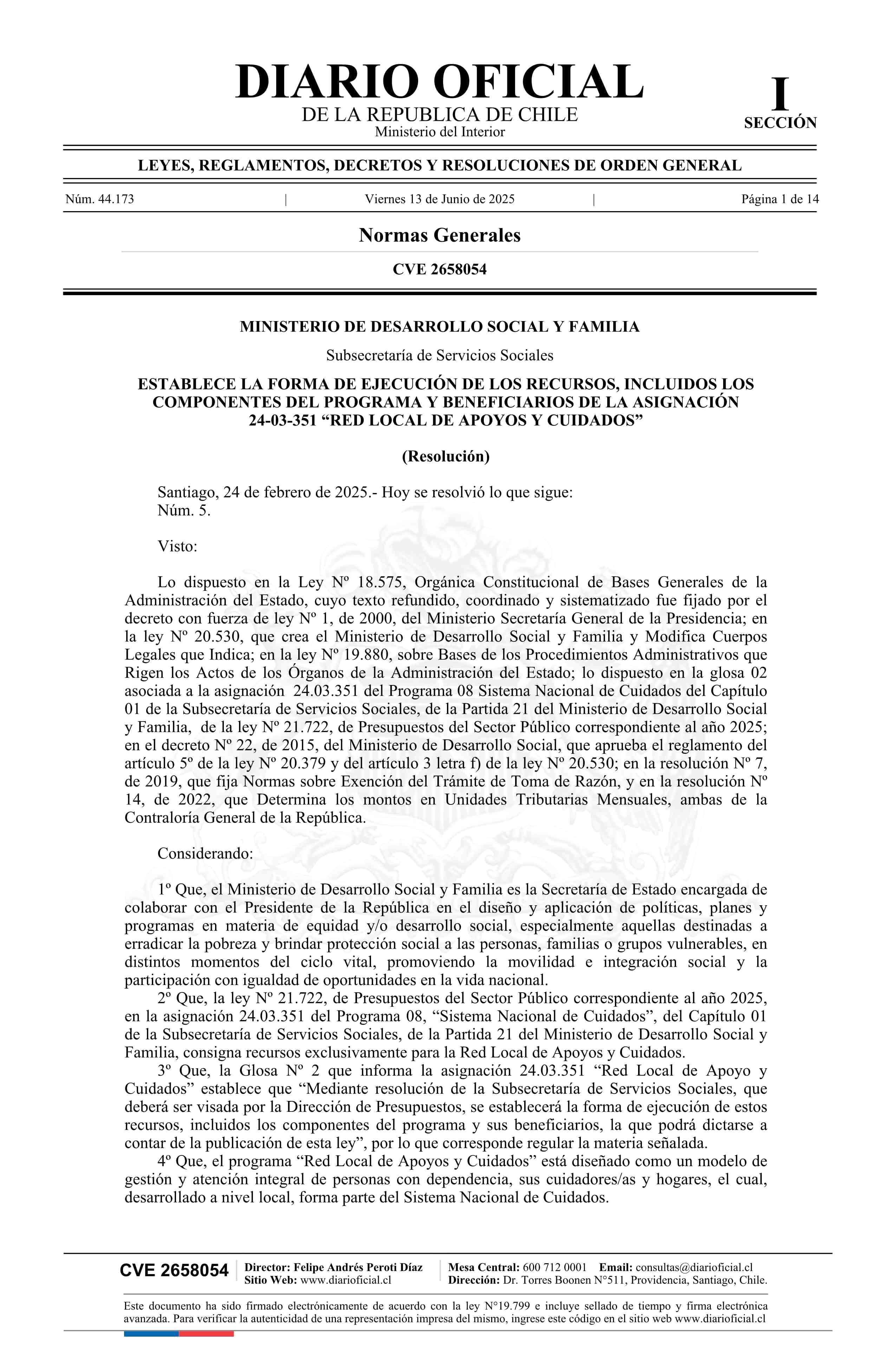 Resolución número 5, de 2025.- Establece la forma de ejecución de los recursos, incluidos los componentes del programa y beneficiarios de la Asignación 24-03-351 Red Local de Apoyos y Cuidados 13-06-2025 DIARIO OFICIAL CHILE - BOLETÍN OFICIAL DE MINERÍA |