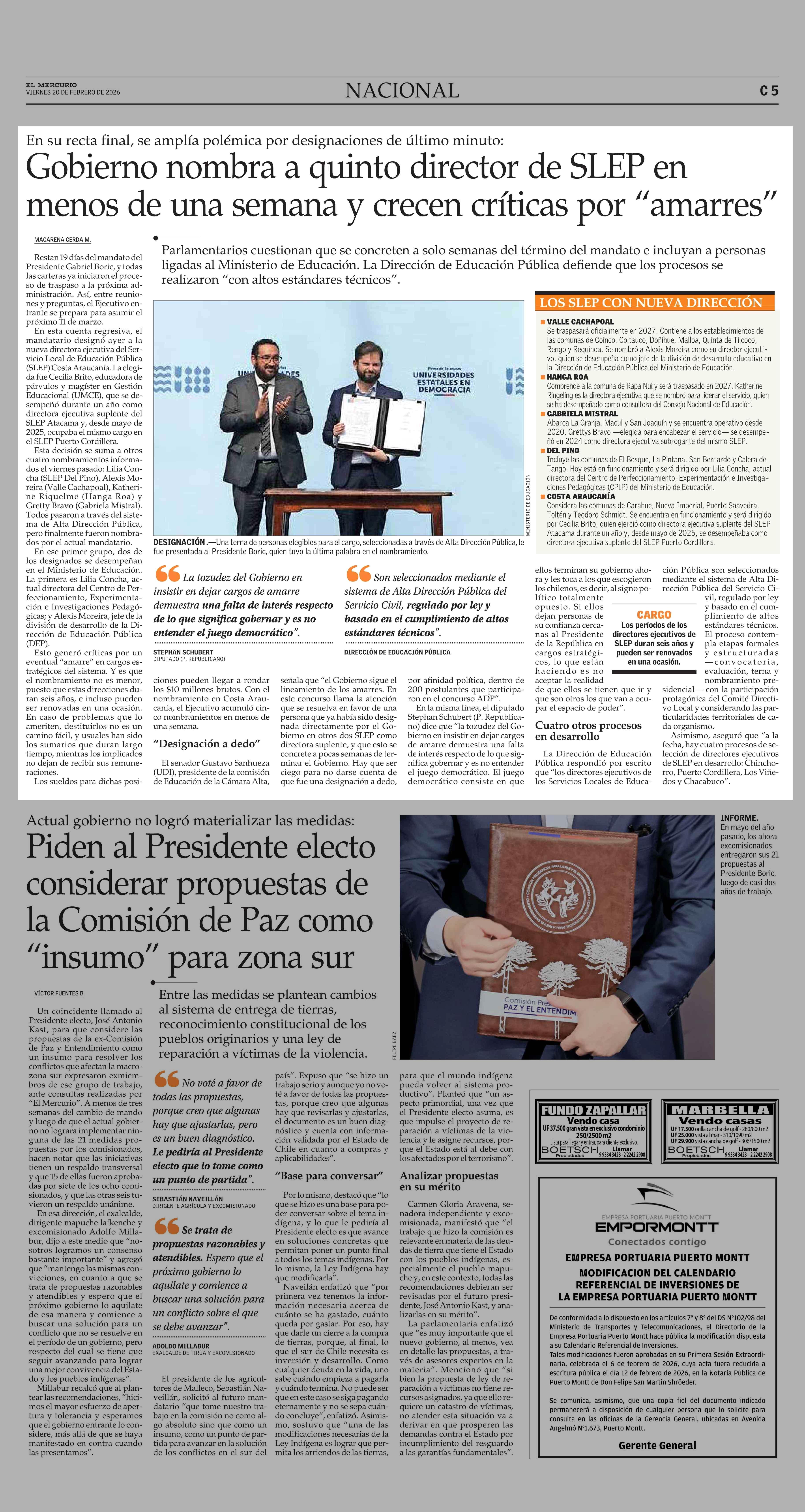 Gobierno nombra a quinto director de SLEP en menos de una semana y crecen críticas por “amarres” 20-02-2026 El Mercurio |