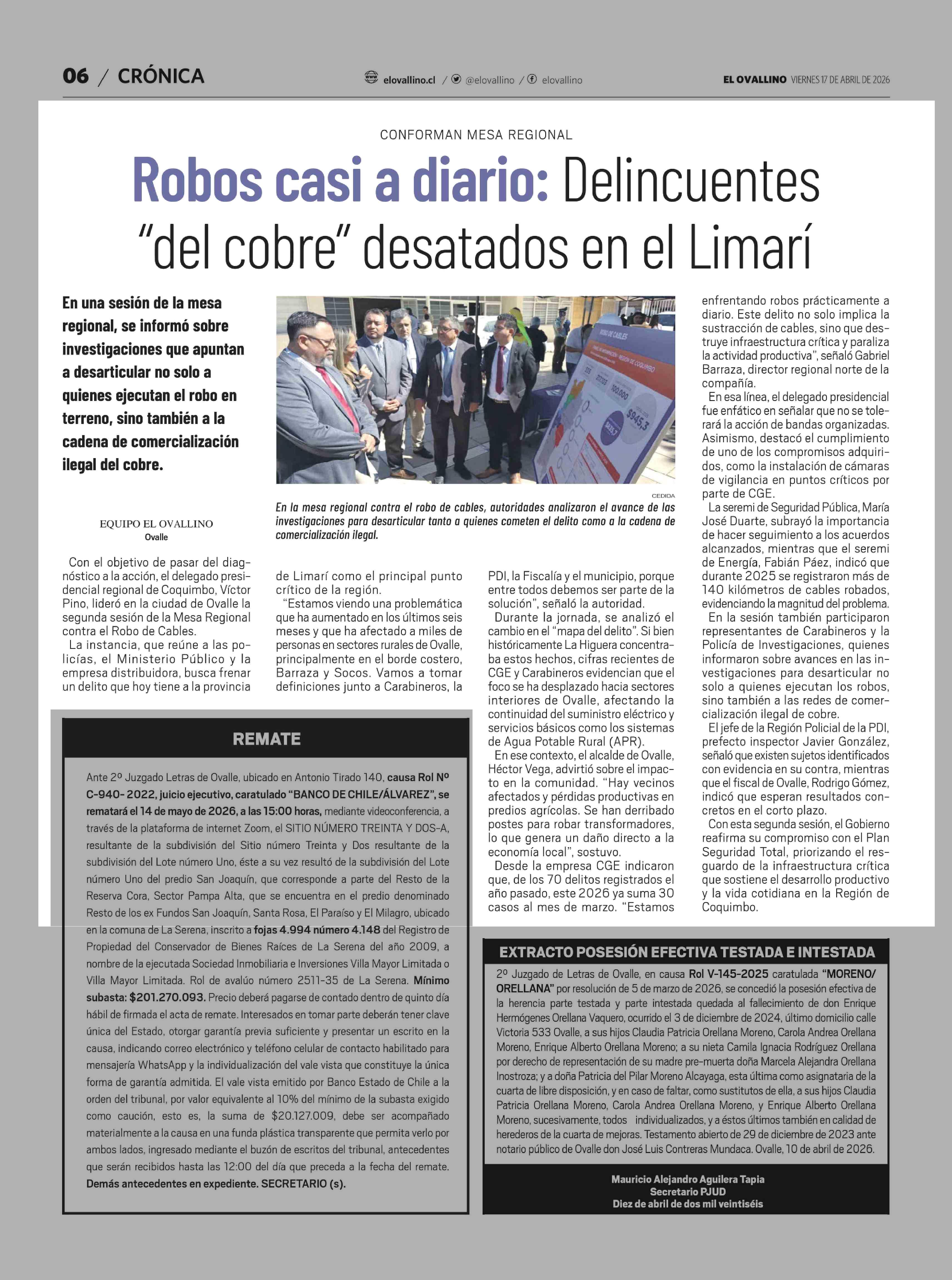 Robos casi a diario: Delincuentes "del cobre” desatados en el Limari 17-04-2026 El Ovallino |