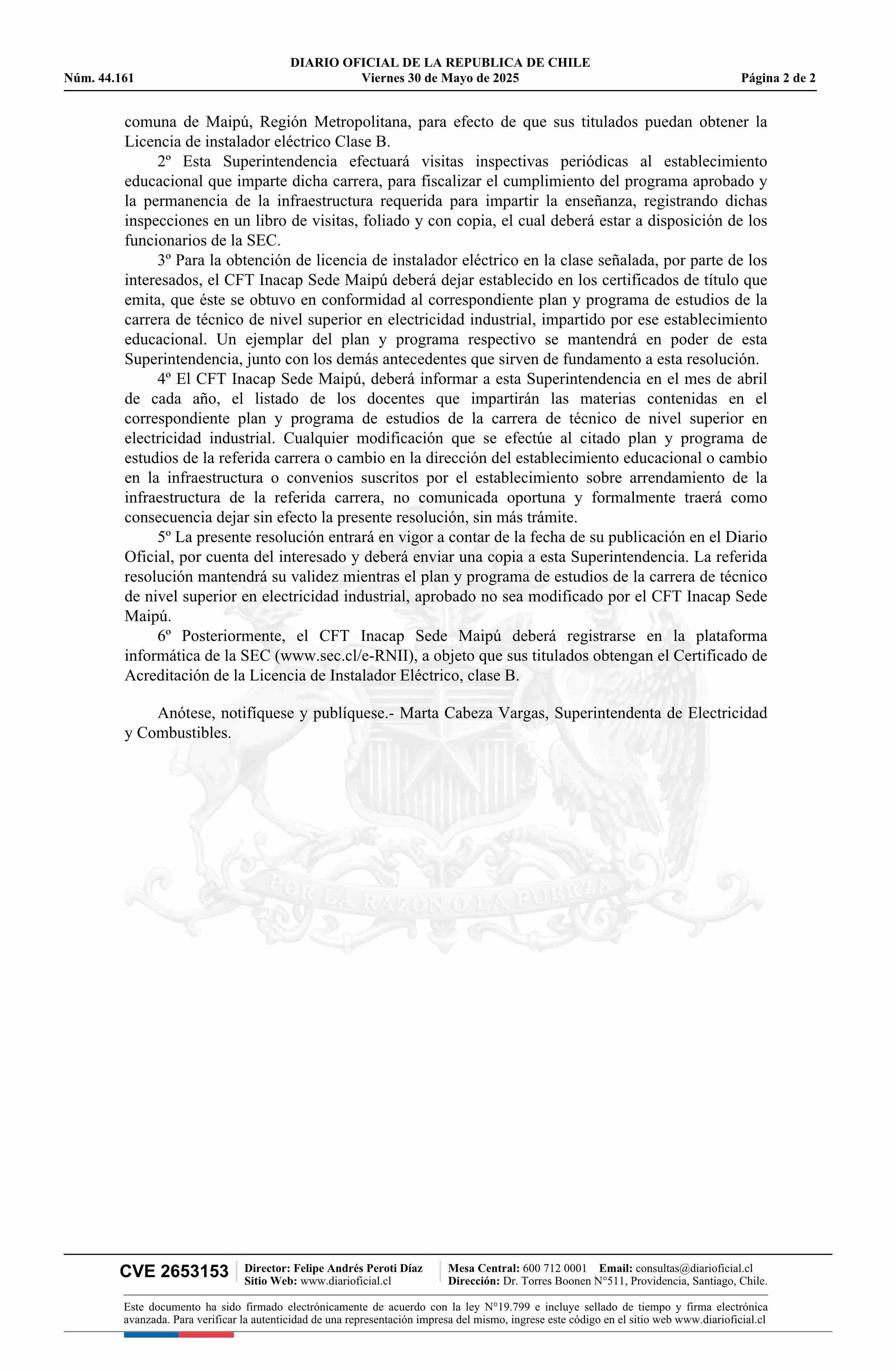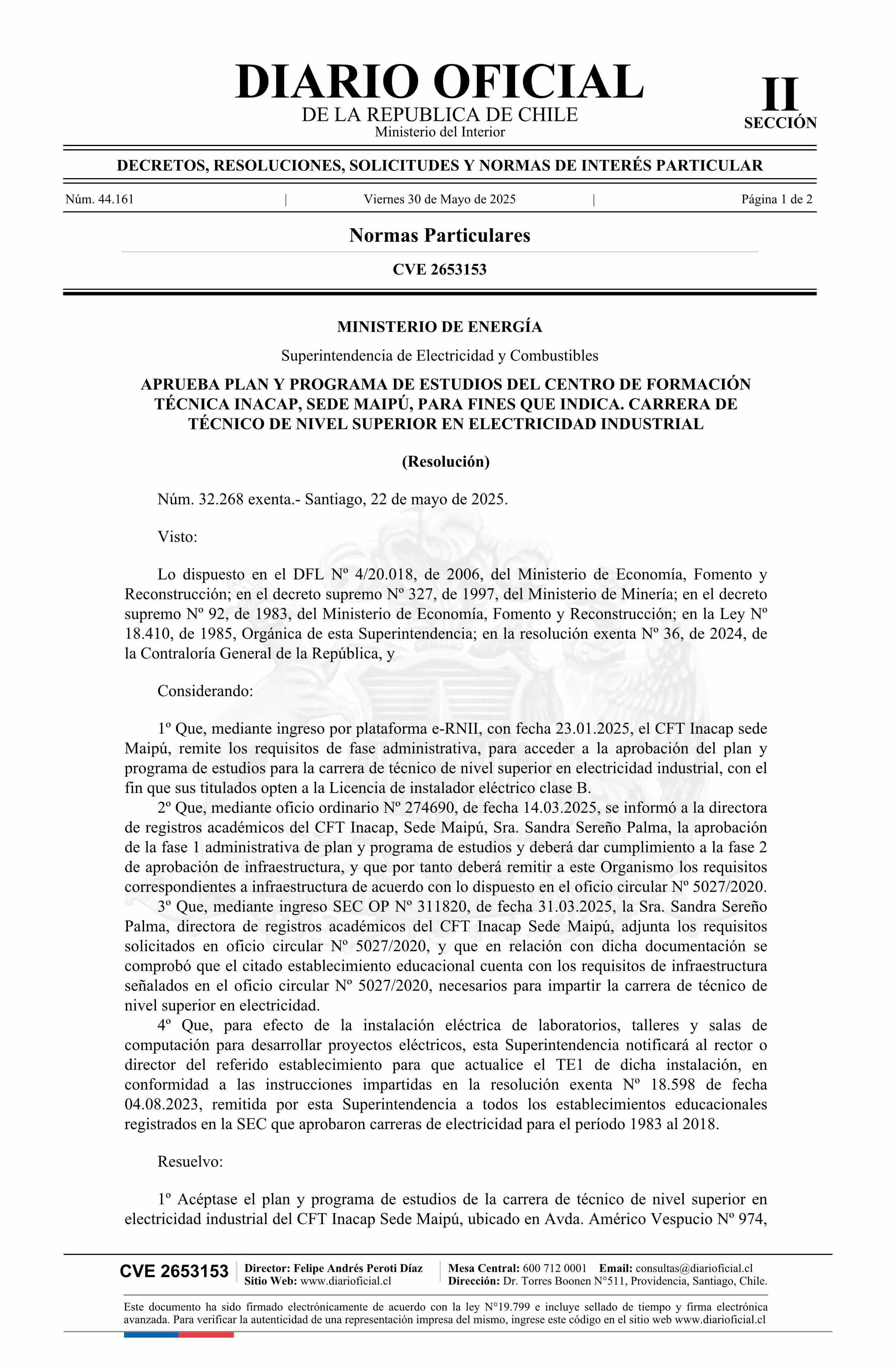 | Título: | Resolución exenta número 32.268, de 2025.- Aprueba plan y programa de estudios de la carrera de Técnico de Nivel Superior en Electricidad Industrial del Centro de Formación Técnica Inacap, sede Maipú |