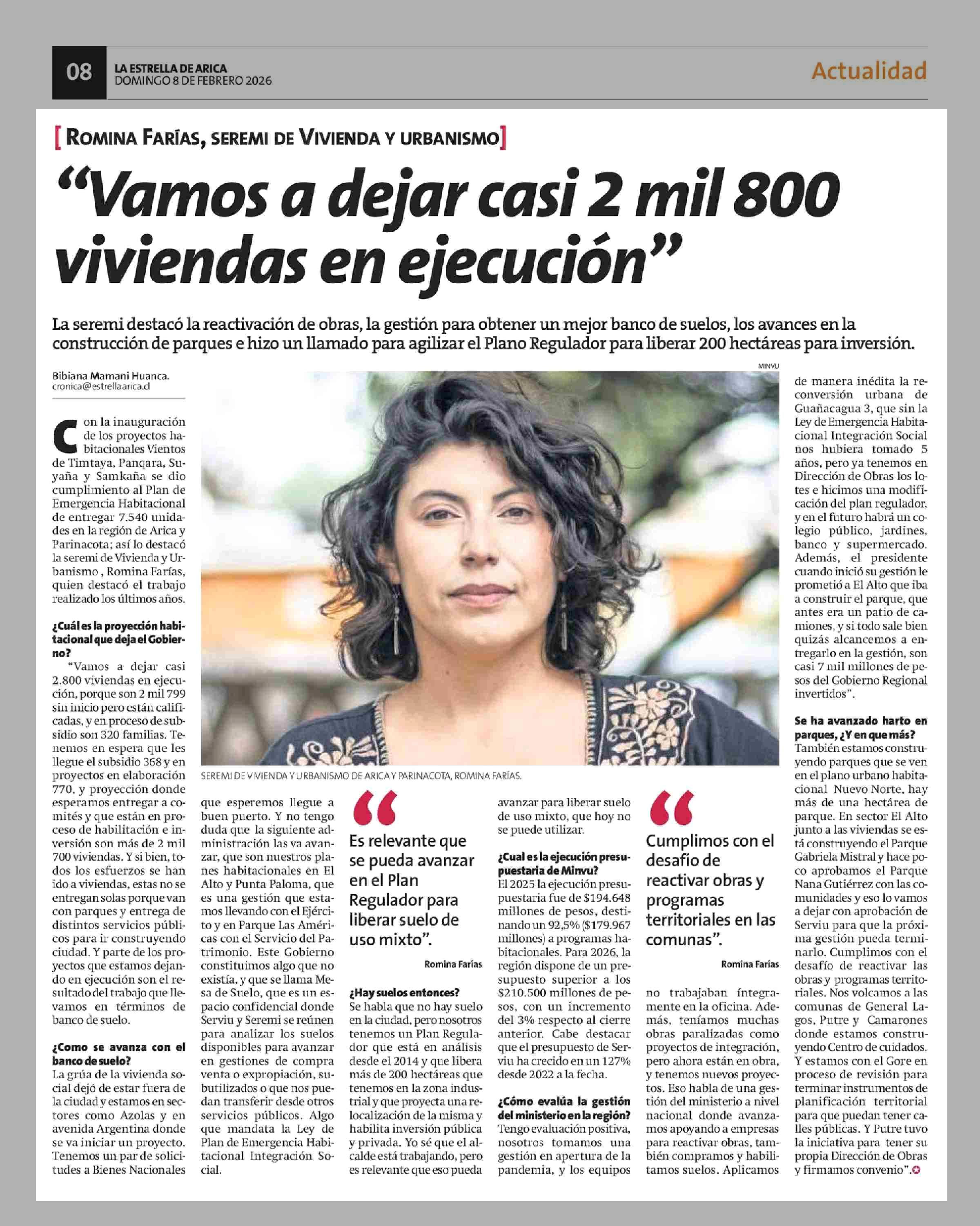 "Vamos a dejar casi 2 mil 800 viviendas en ejecución" 08-02-2026 La Estrella de Arica |