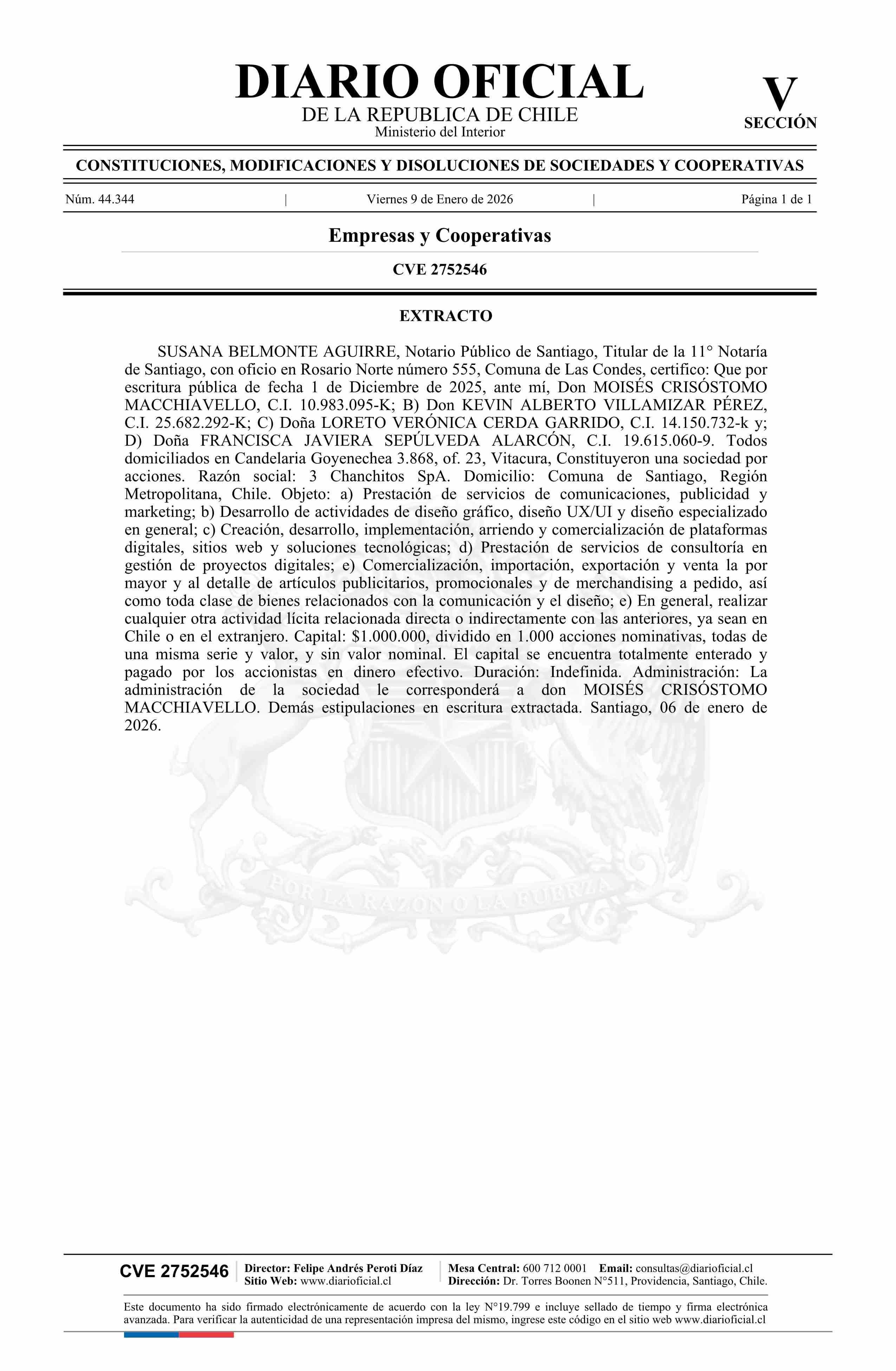 3 Chanchitos SpA 09-01-2026 Diario Oficial Edición Electrónica |