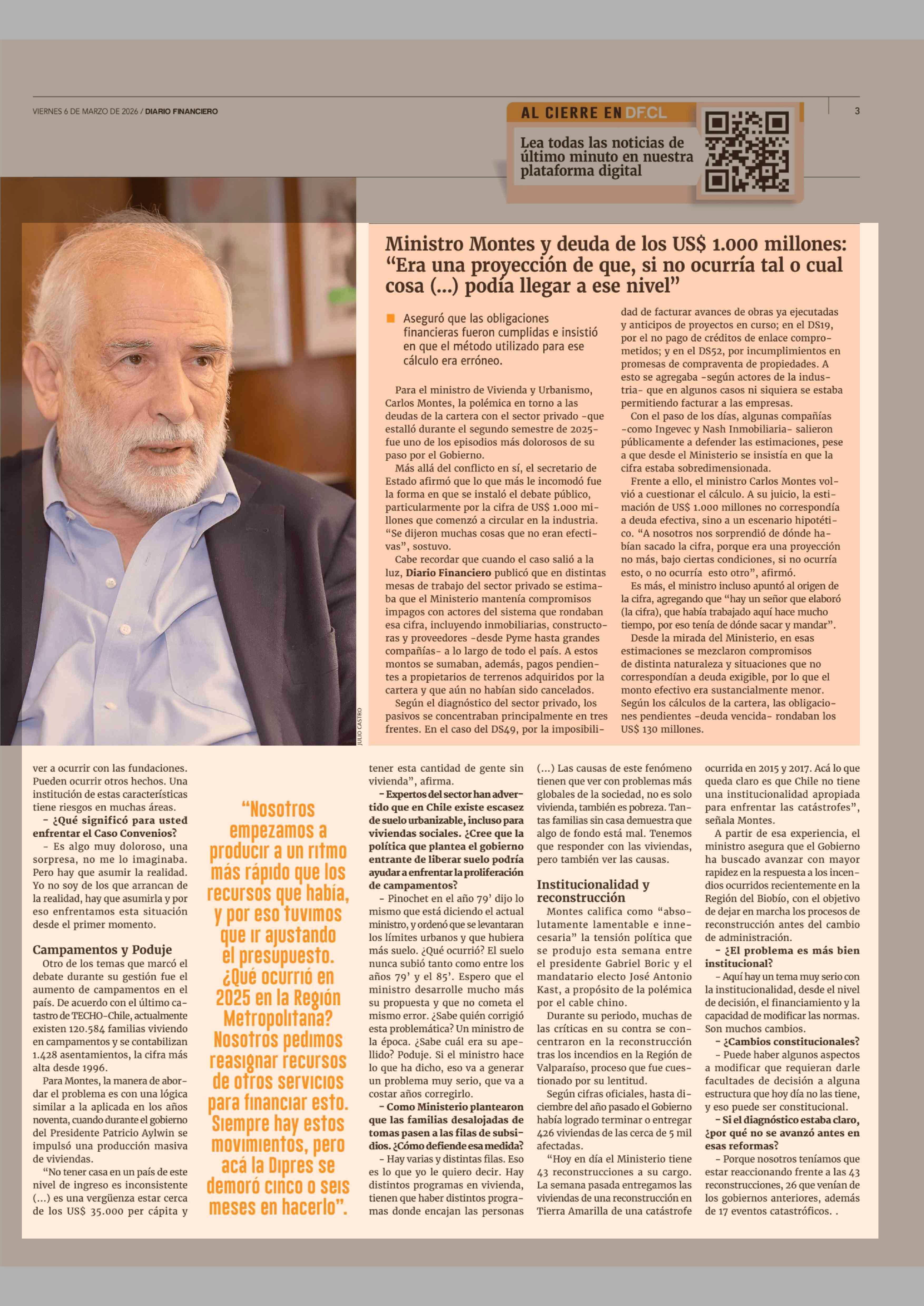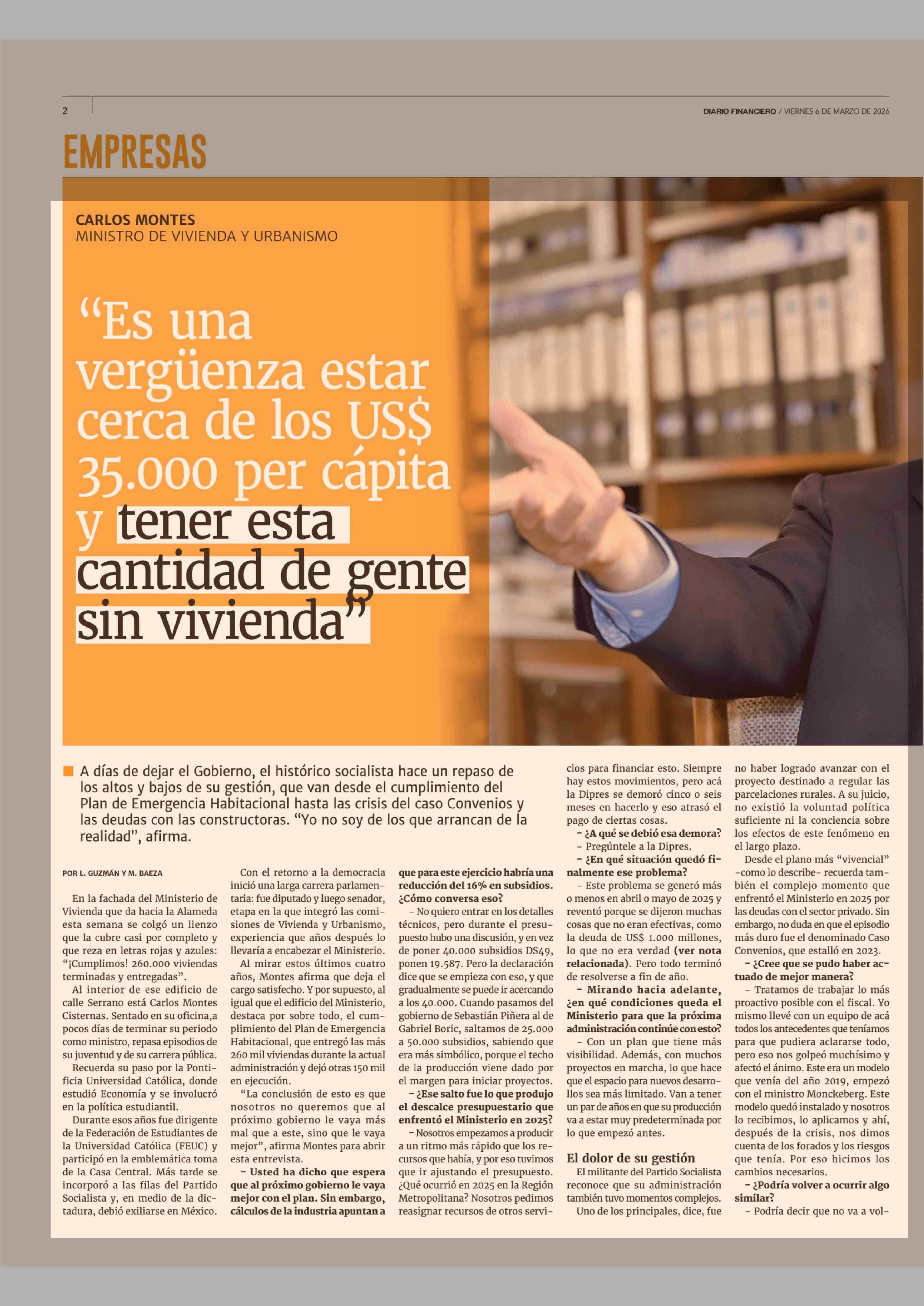 "Es una vergüenza estar cerca de los USS 35.000 per cápita y tener esta cantidad de gente sin vivienda 06-03-2026 Diario Financiero |