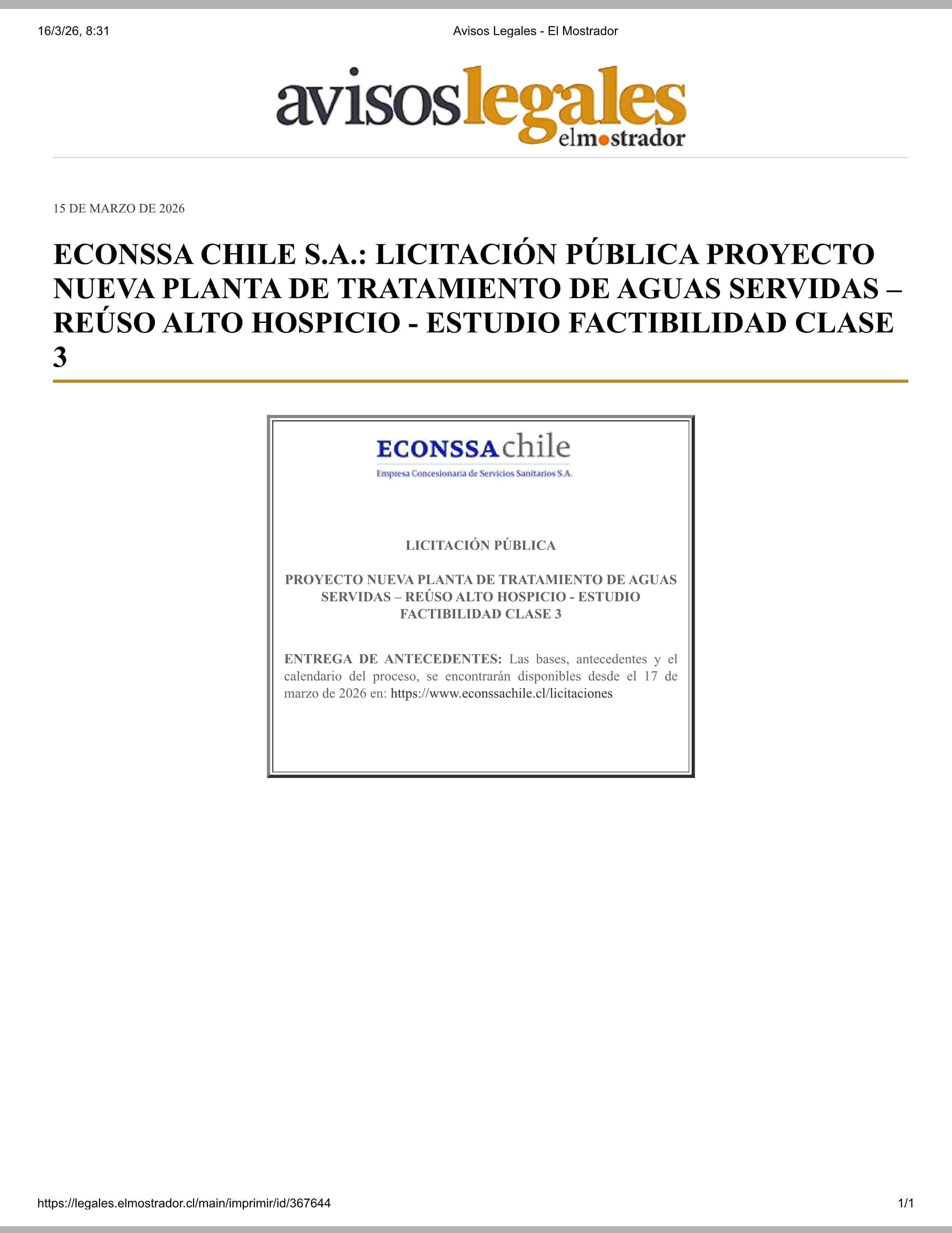 Título: AVISO LICITACIONES: ECONSSA CHILE S.A. LICITACIÓN PÚBLICA PROYECTO NUEVA PLANTA DE TRATAMIENTO DE AGUAS SERVIDAS — REÚSO ALTO HOSPICIO - ESTUDIO FACTIBILIDAD CLASE 3