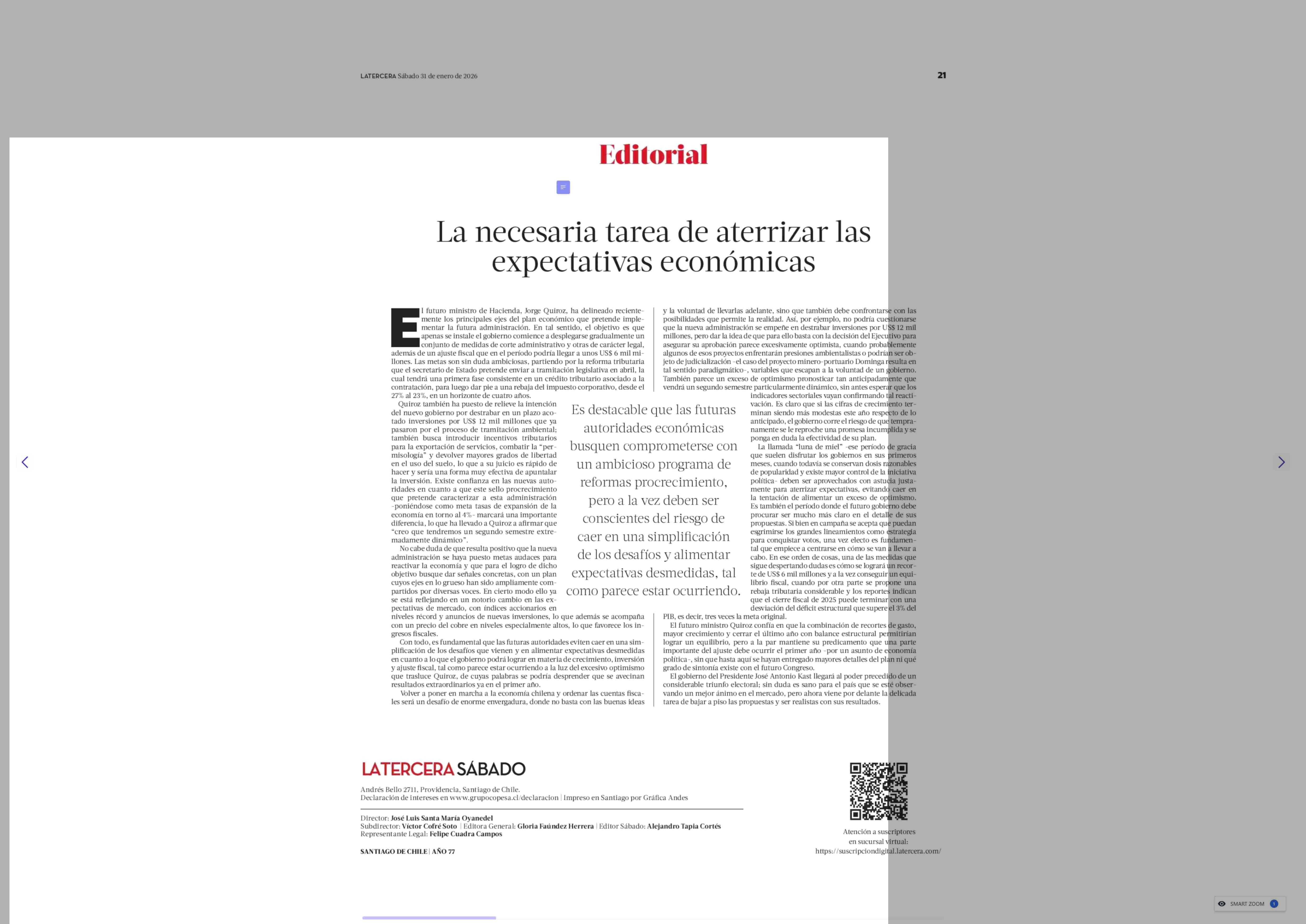 EDITORIAL: La necesaria tarea de aterrizar las expectativas económicas 31-01-2026 La Tercera |