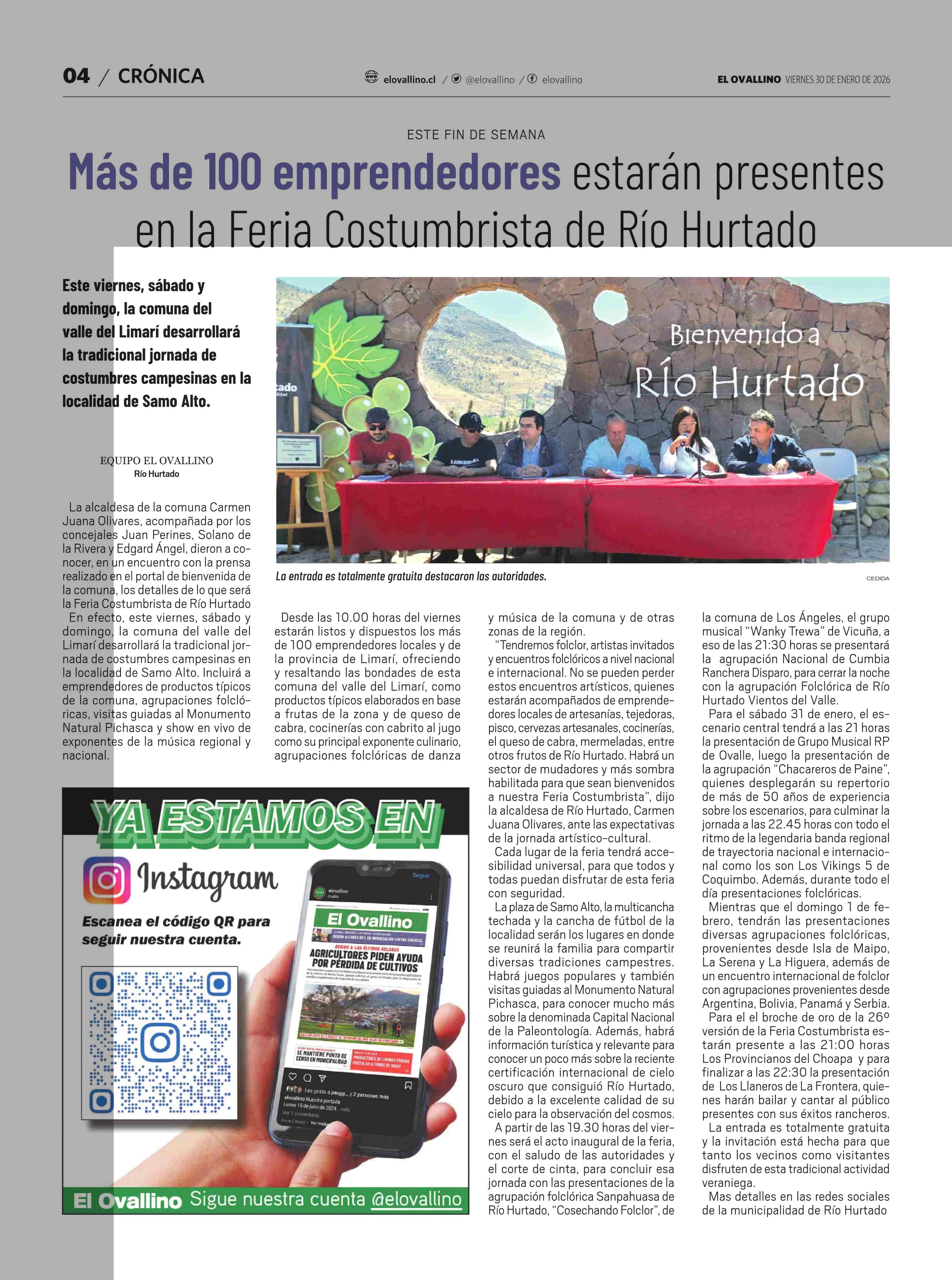 Más de 100 emprendedores estarán presentes en la Feria Costumbrista de Río Hurtado 30-01-2026 El Ovallino |