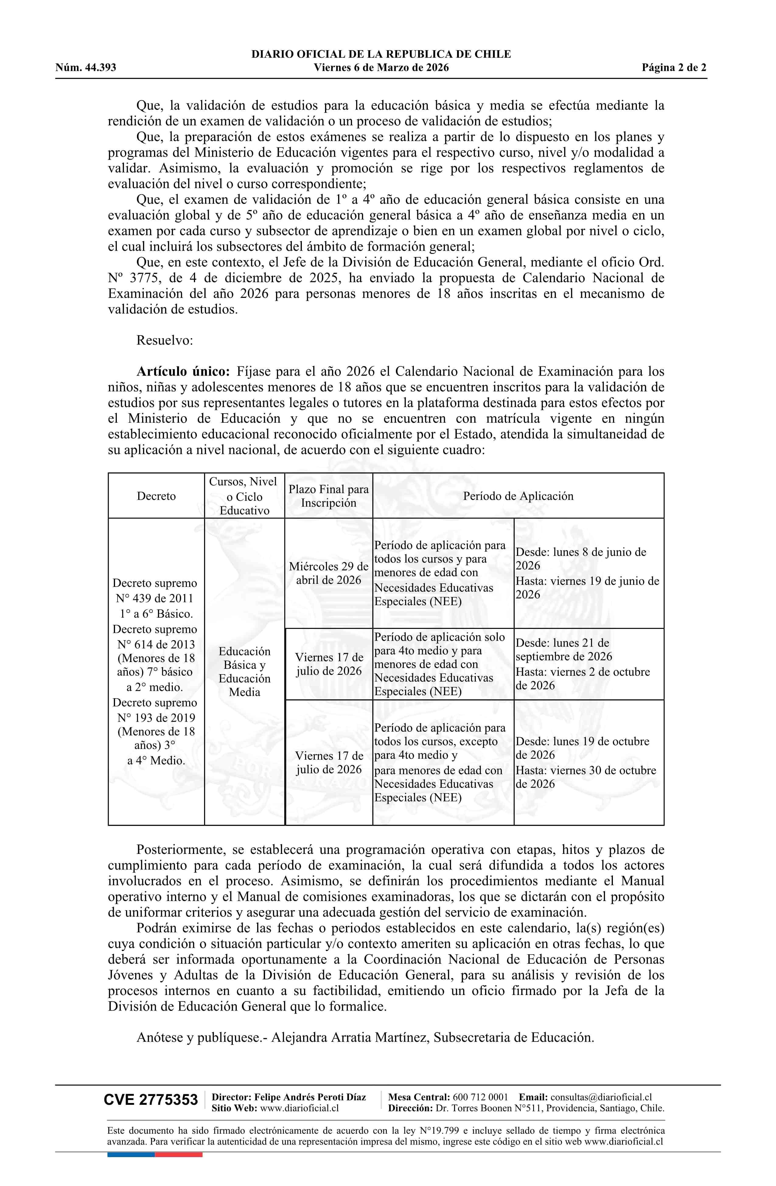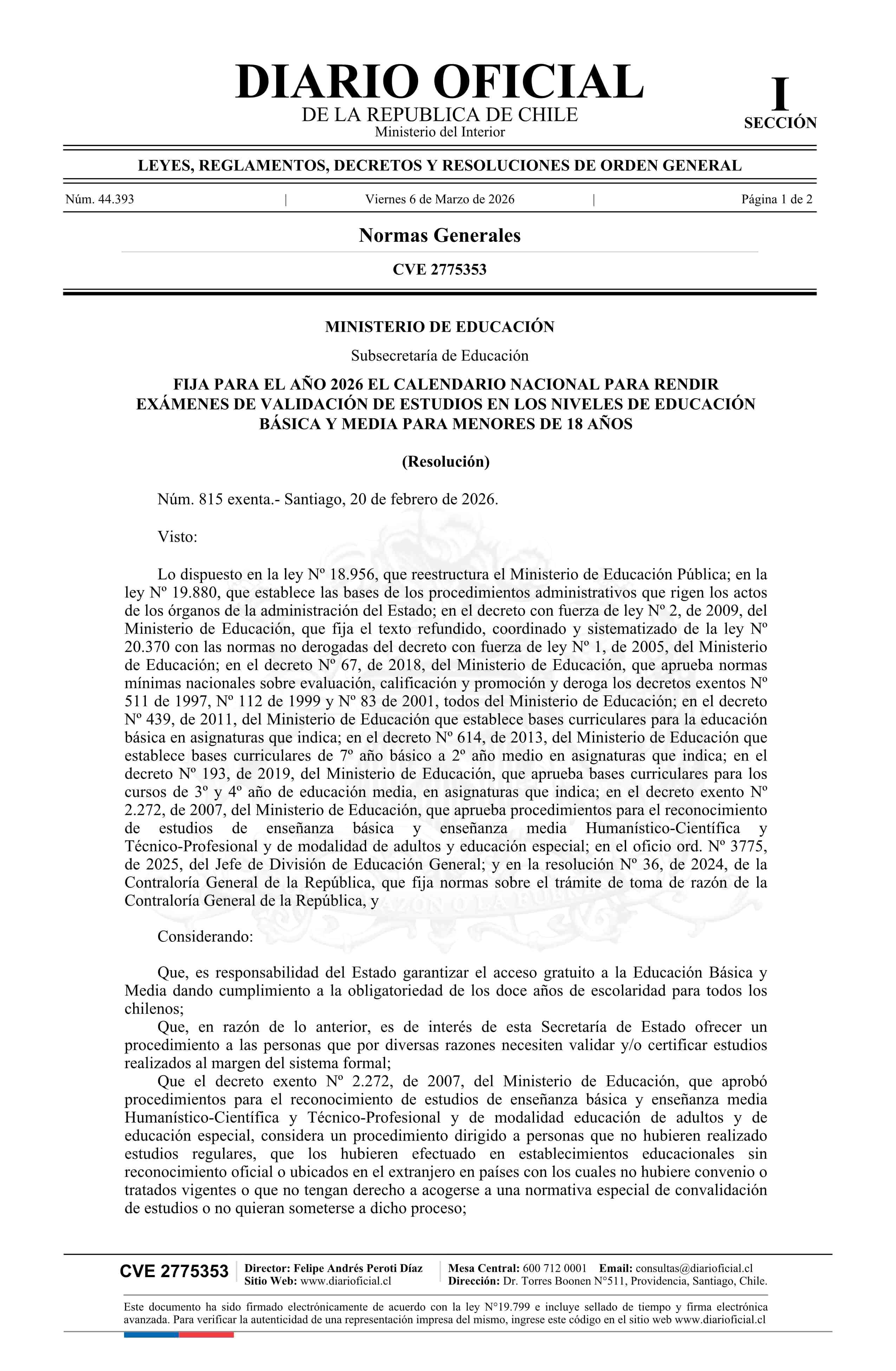 Título: Resolución exenta número 815, de 2026.- Fija para el año 2026 el calendario nacional para rendir exámenes de validación de estudios en los niveles de educación básica y media para menores de 18 años