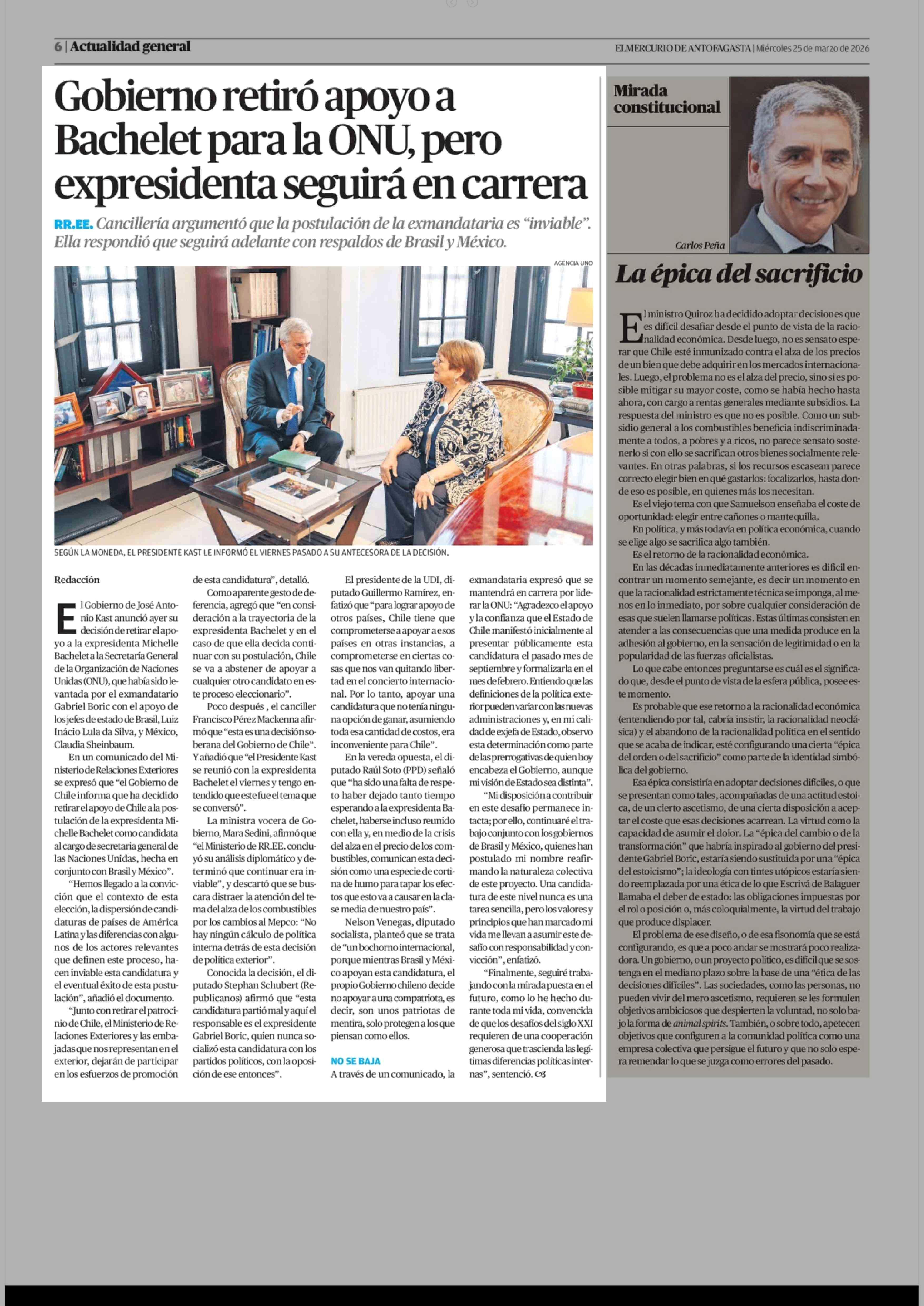 Gobierno retiró apoyo a Bachelet para la ONU, pero expresidenta seguirá en carrera 25-03-2026 El Mercurio de Antofagasta |