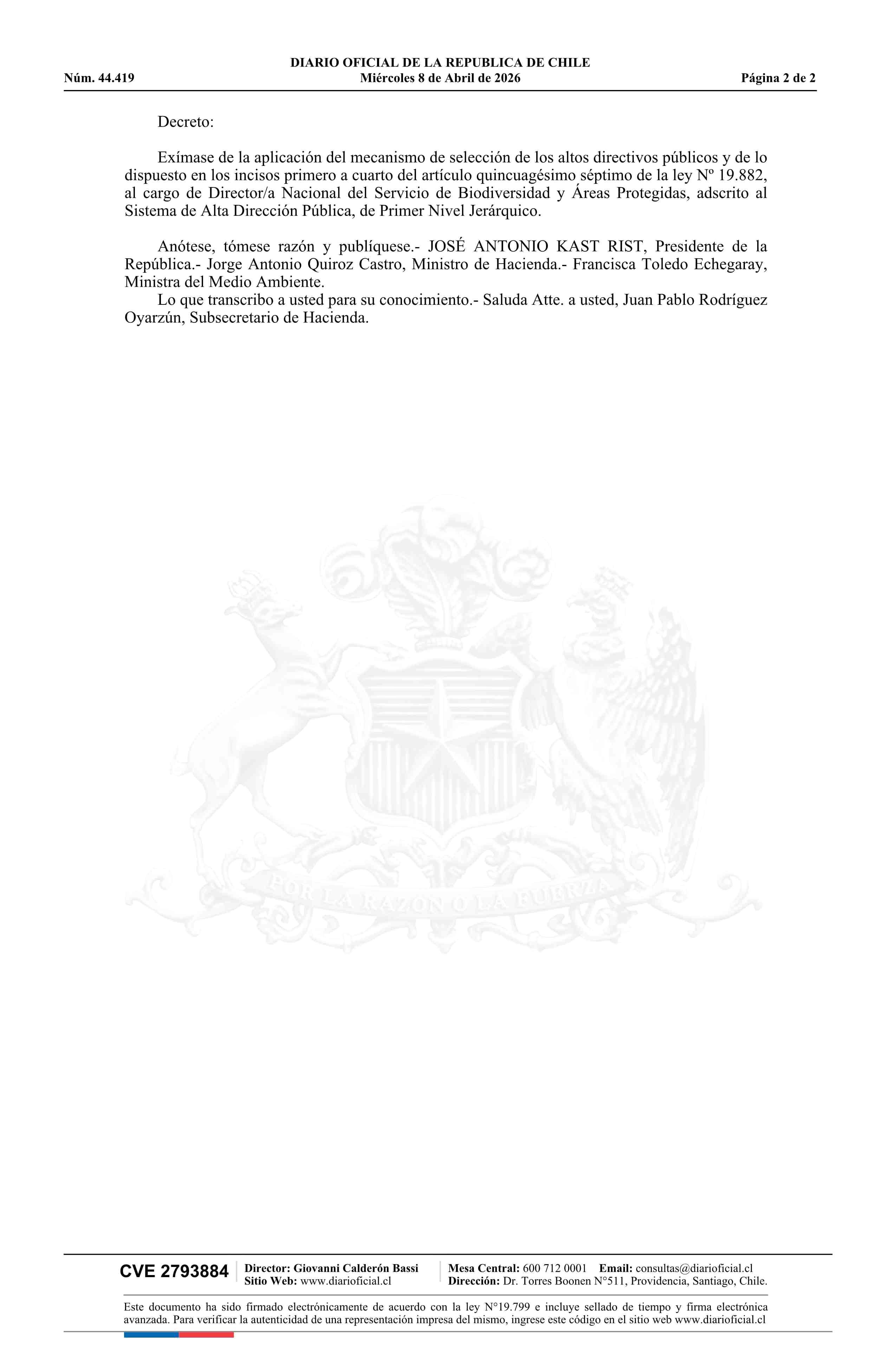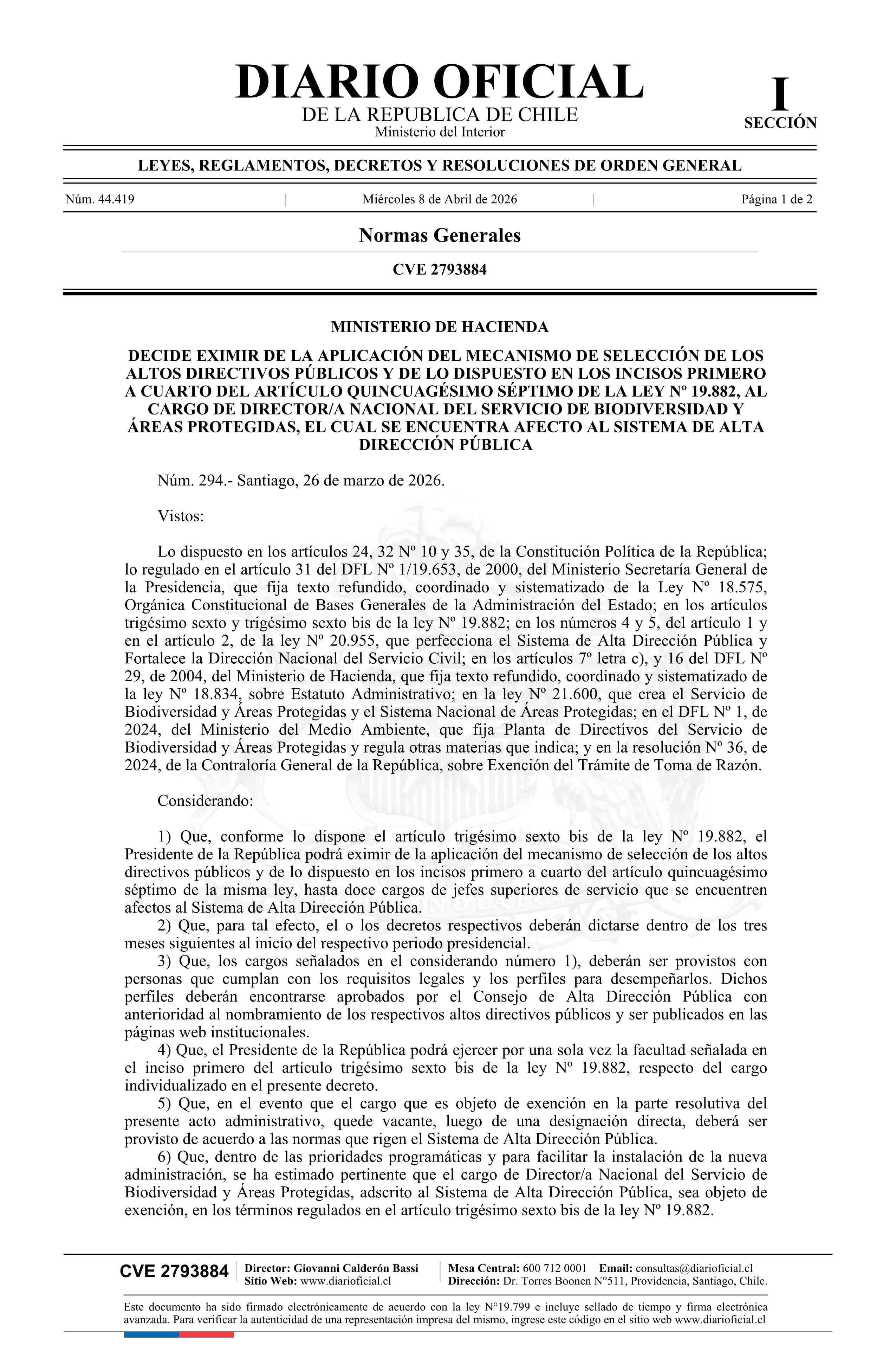 | Título: | Decreto número 294, de 2026.- Decide eximir de la aplicación del mecanismo de selección de los altos directivos públicos y de lo dispuesto en los incisos primero a cuarto del artículo quincuagésimo séptimo de la ley Nº 19.882, al cargo de Director/a Nacional del Servicio de Biodiversidad y Áreas Pro |