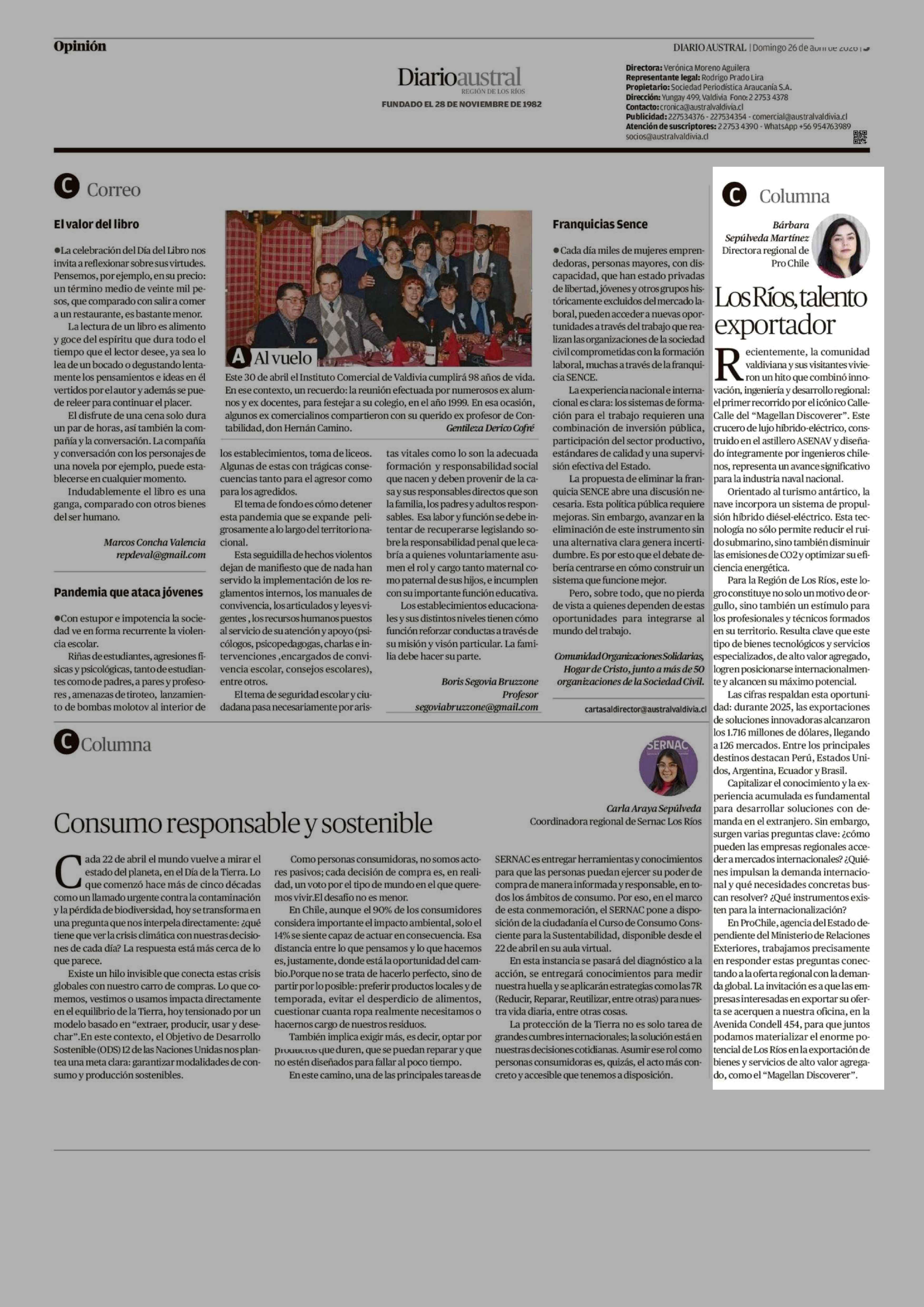COLUMNAS DE OPINIÓN: Los Ríos talento exportador 26-04-2026 Diario Austral Región de Los Ríos |