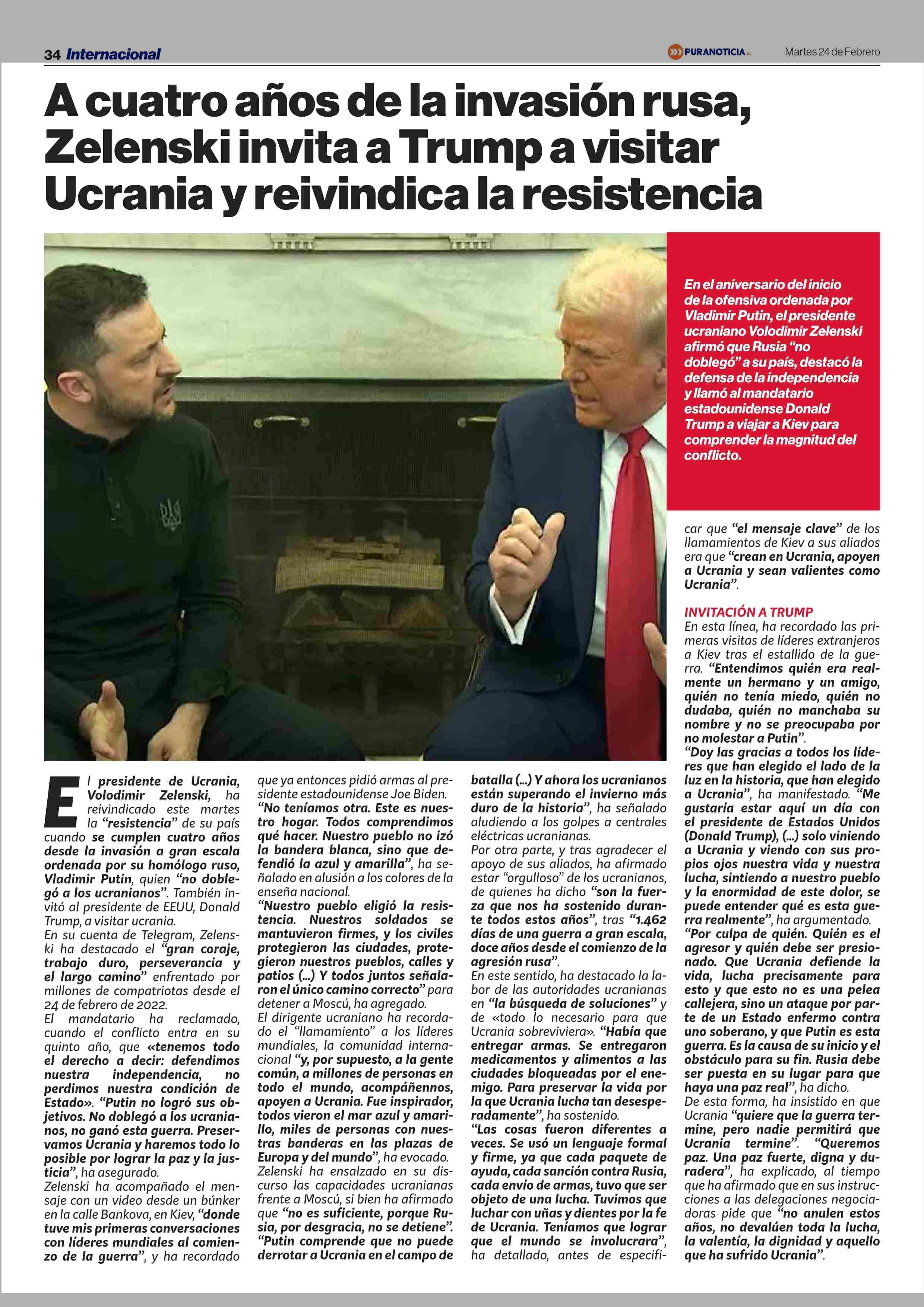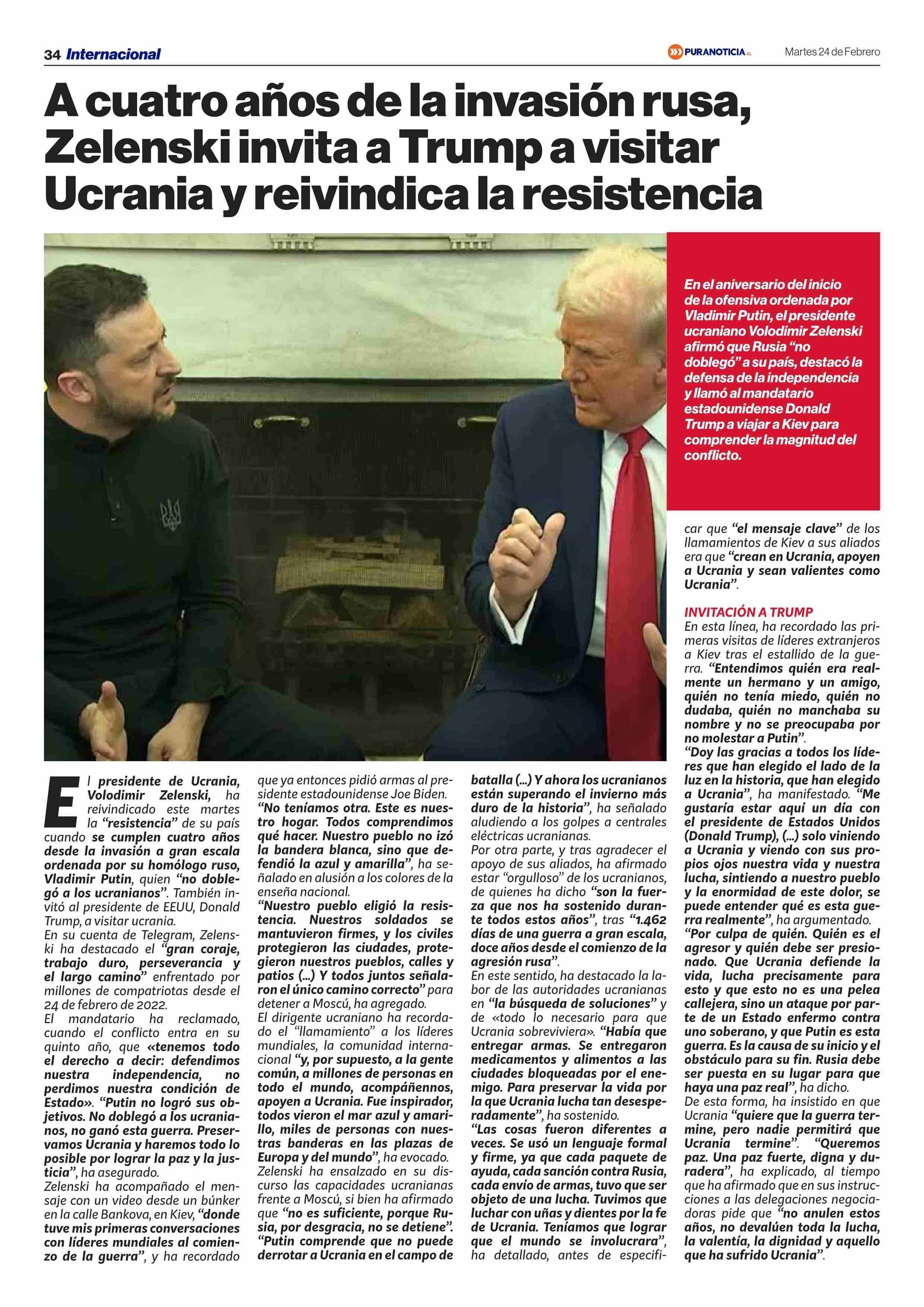 Título: A cuatro años de la invasión rusa, Zelenski invita a Trump a visitar Ucrania y reivindica la resistencia