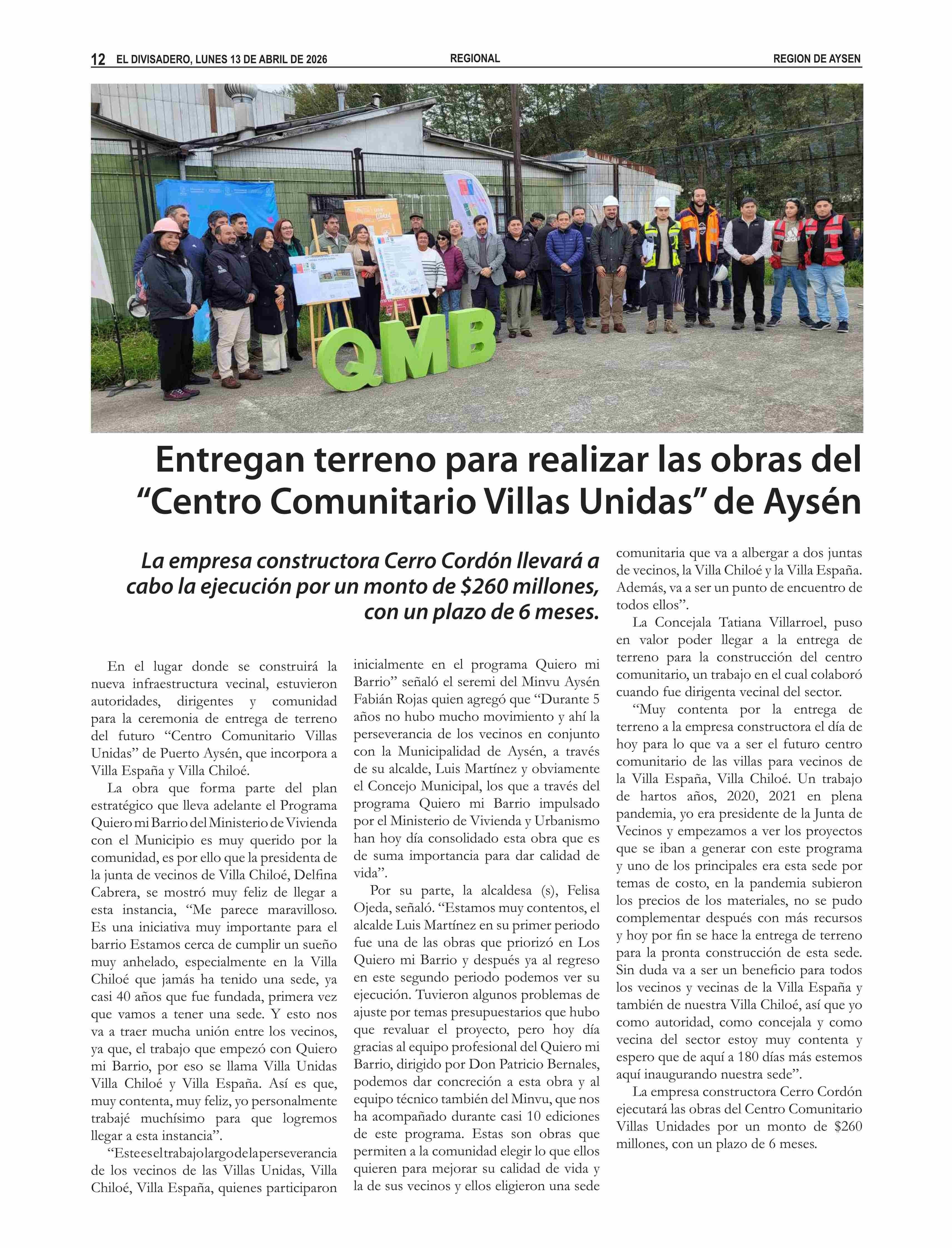 Entregan terreno para realizar las obras del “Centro Comunitario Villas Unidas” de Aysén 13-04-2026 El Divisadero |