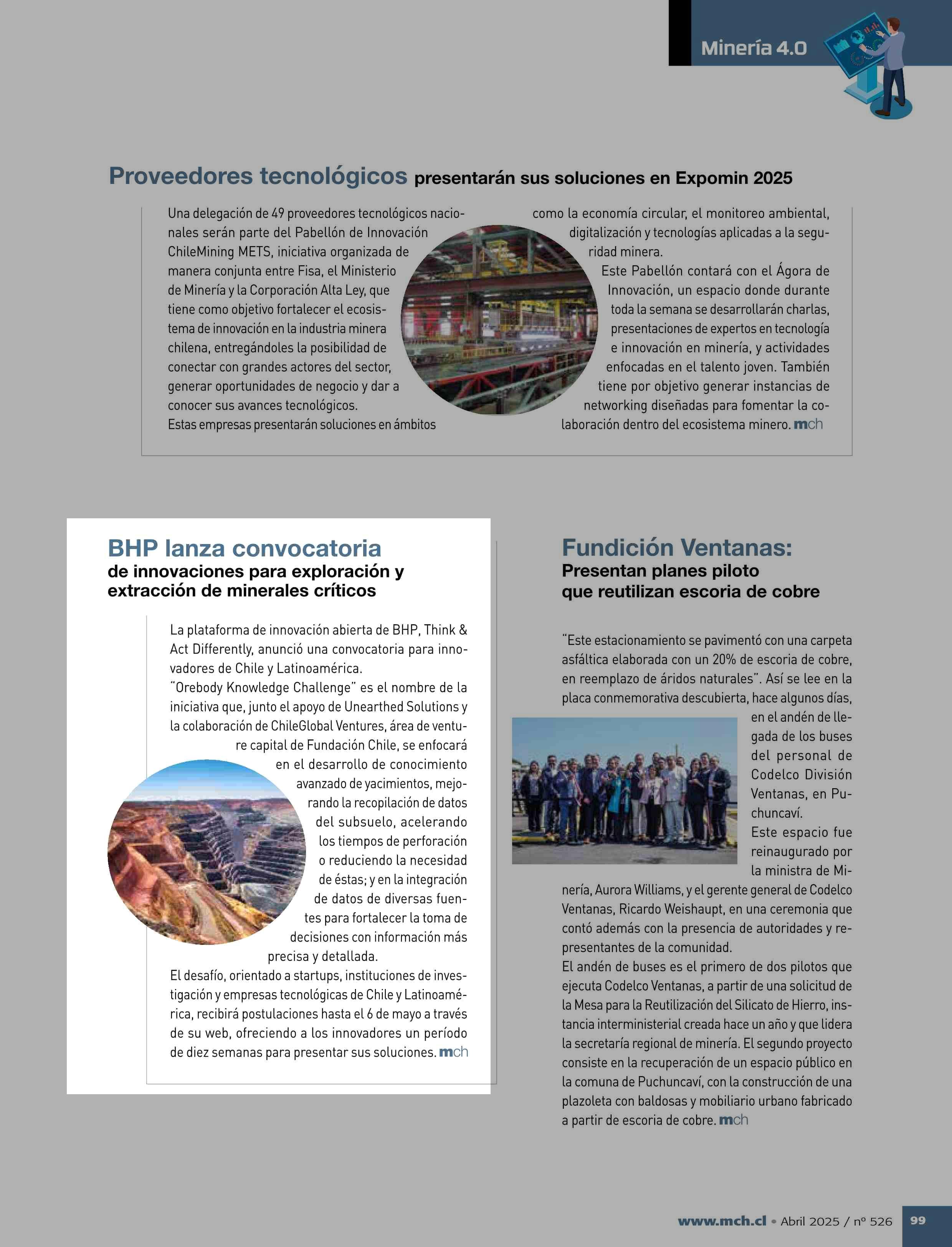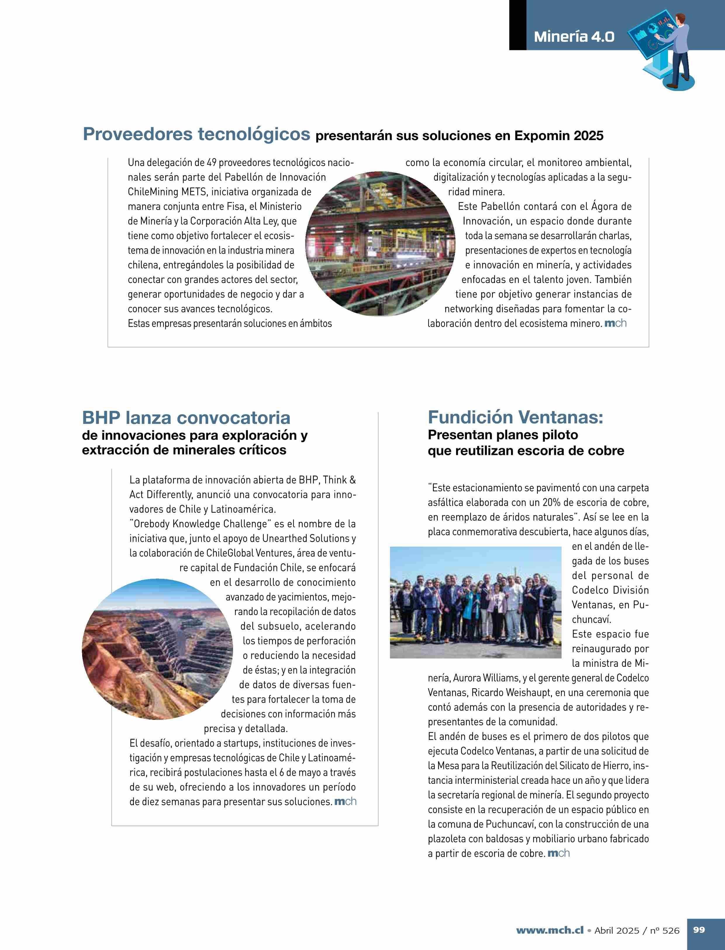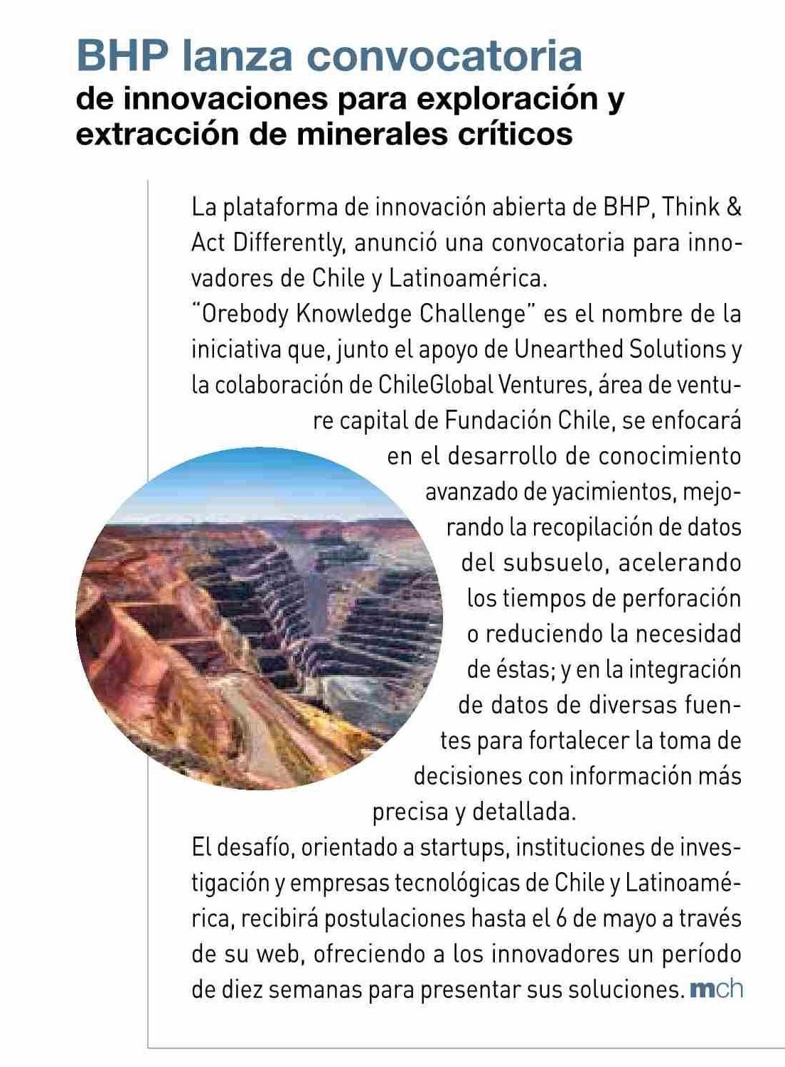BHP lanza convocatoria de innovaciones para exploración y extracción de minerales críticos 15-04-2025 Revista Minería Chilena |
