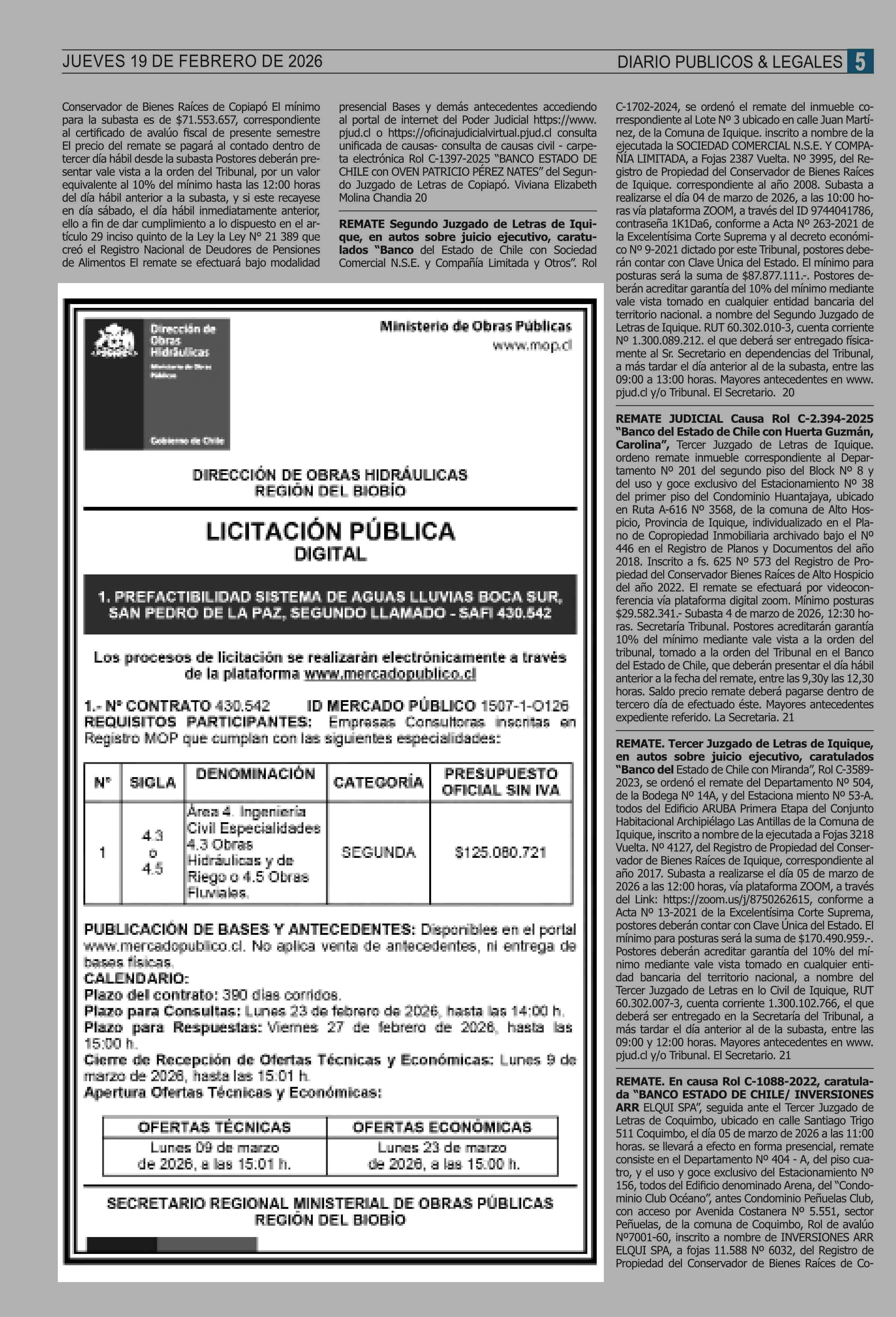 AVISO LICITACIONES: PREFACTIBILIIJhD SISTEMA DE AGUAS LLUVIAS BOCA SUP., SAN PEDRO DE LA PAZ. SEGUNDO LLAMADO-SAFI 430.642 - MOP 19-02-2026 P&L Públicos y Legales |
