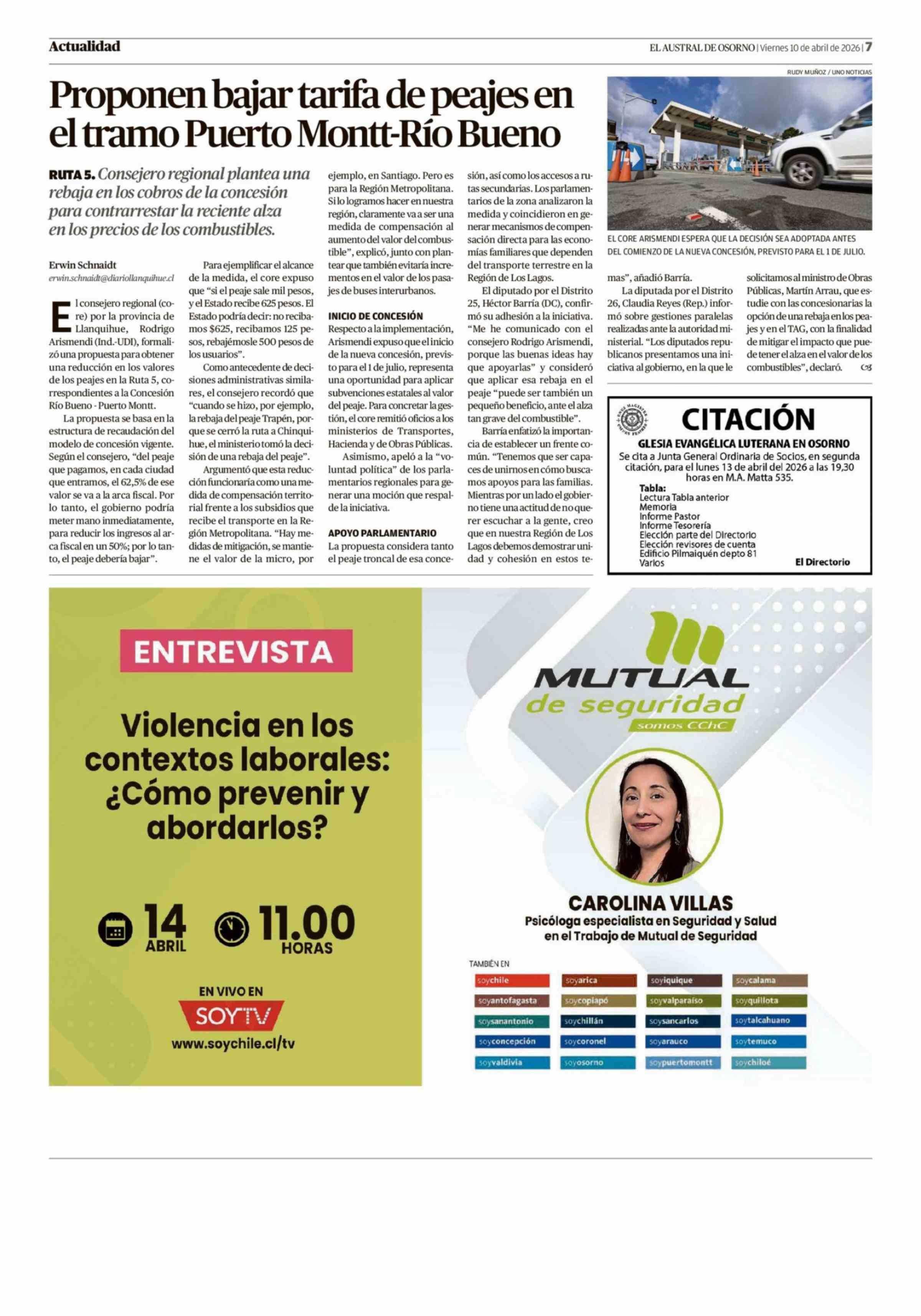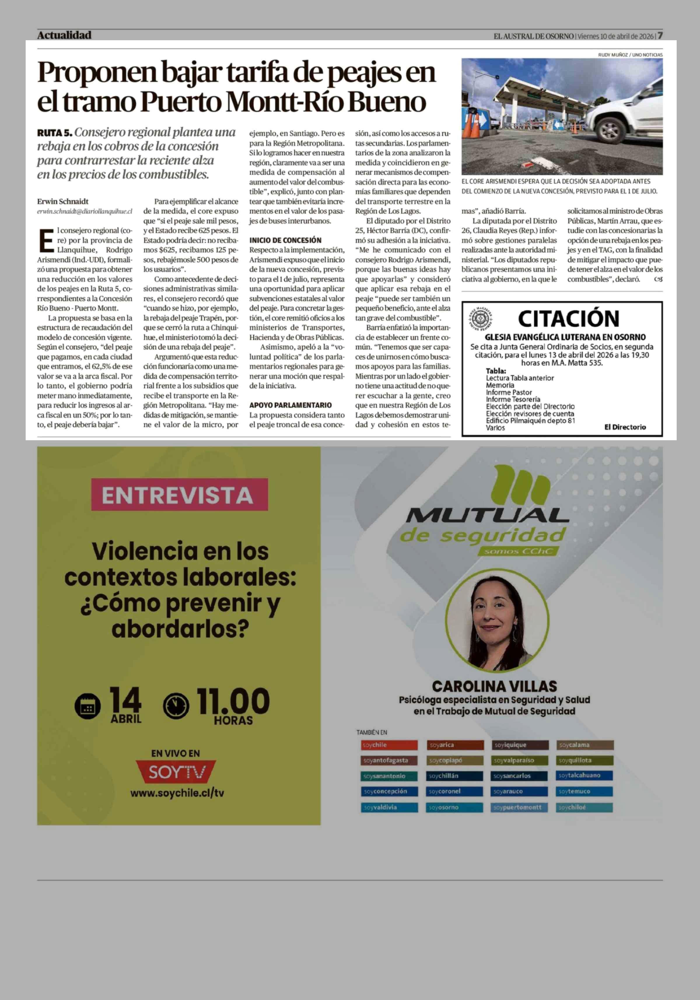 Proponen bajar tarifa de peajes en el tramo Puerto Montt-Río Bueno 10-04-2026 El Austral de Osorno |