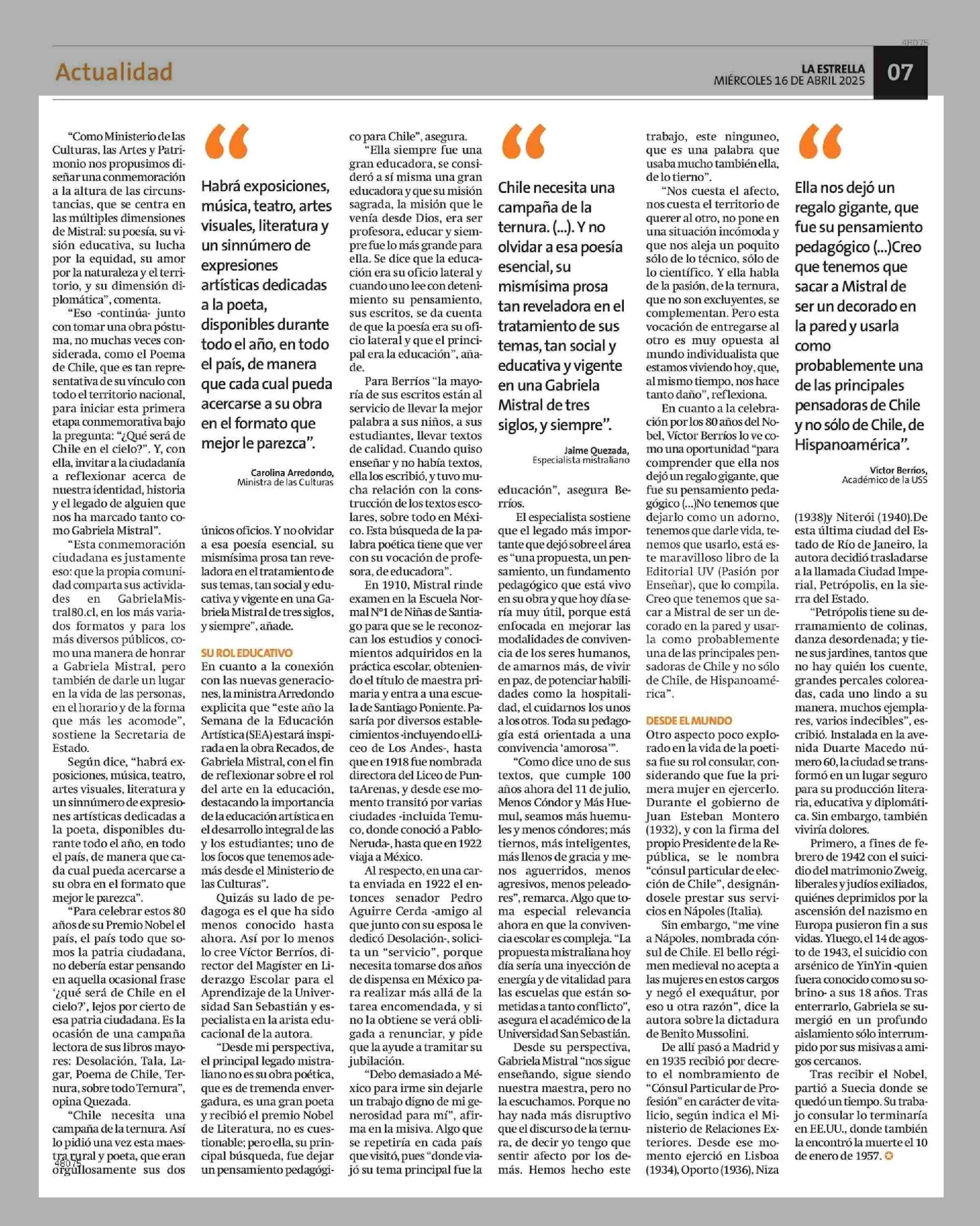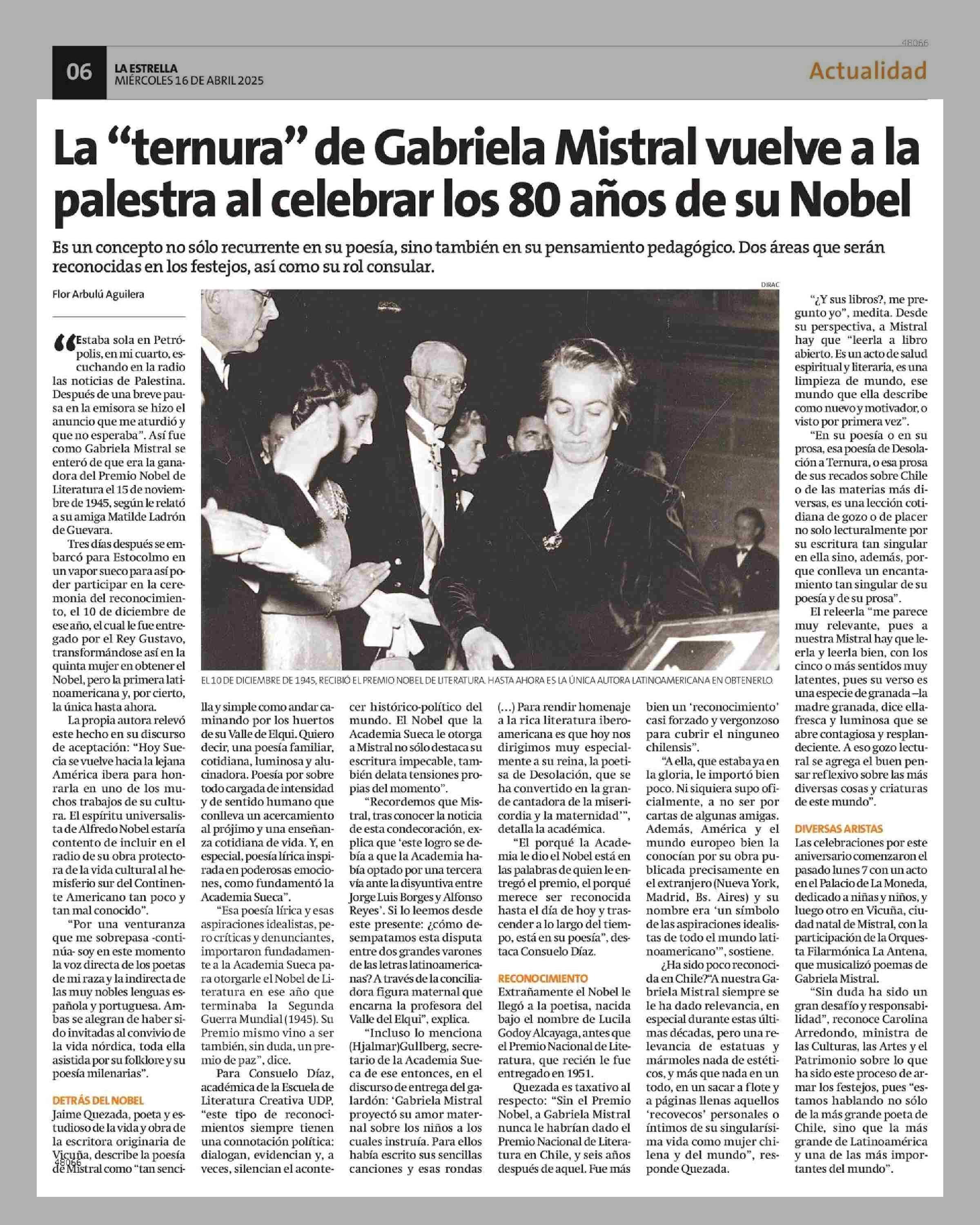 La La “ternura” de Gabriela Mistral vuelve a palestra al celebrar los 80 años de su Nobel 16-04-2025 La Estrella de Antofagasta |