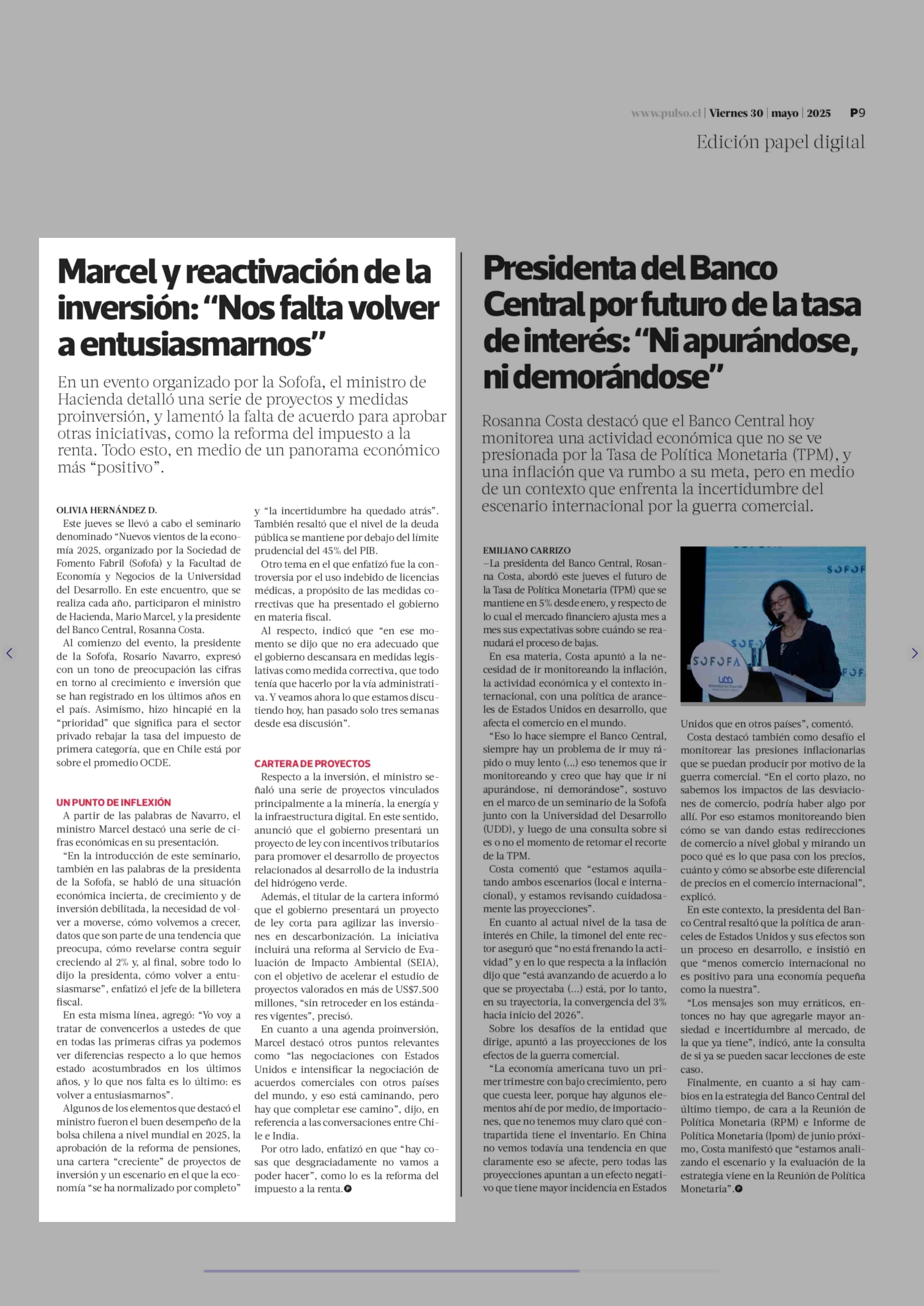 Marcel y reactivación de la inversión: “Nos falta volver a entusiasmarnos” 30-05-2025 La Tercera |