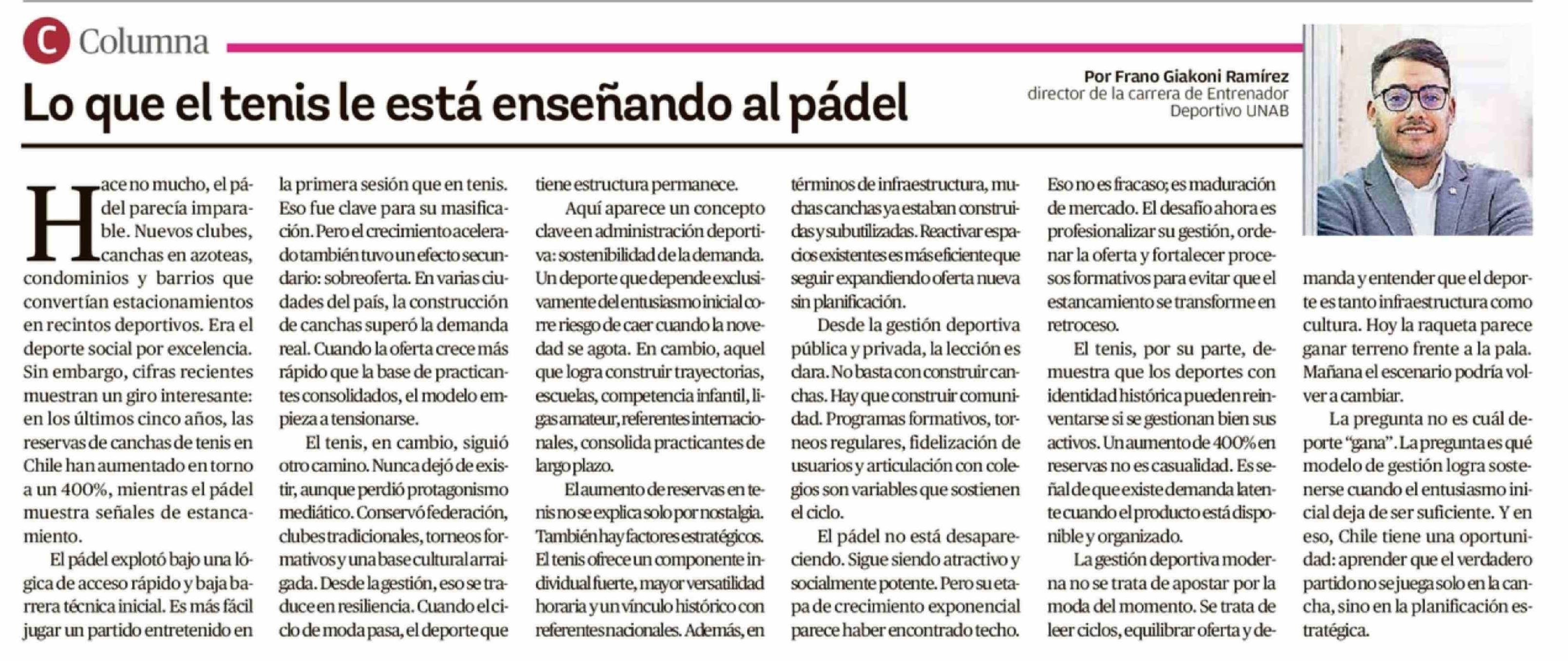 Columnas de Opinión: Lo que el tenis le está enseñando al pádel 18-03-2026 Crónica de Chillán |