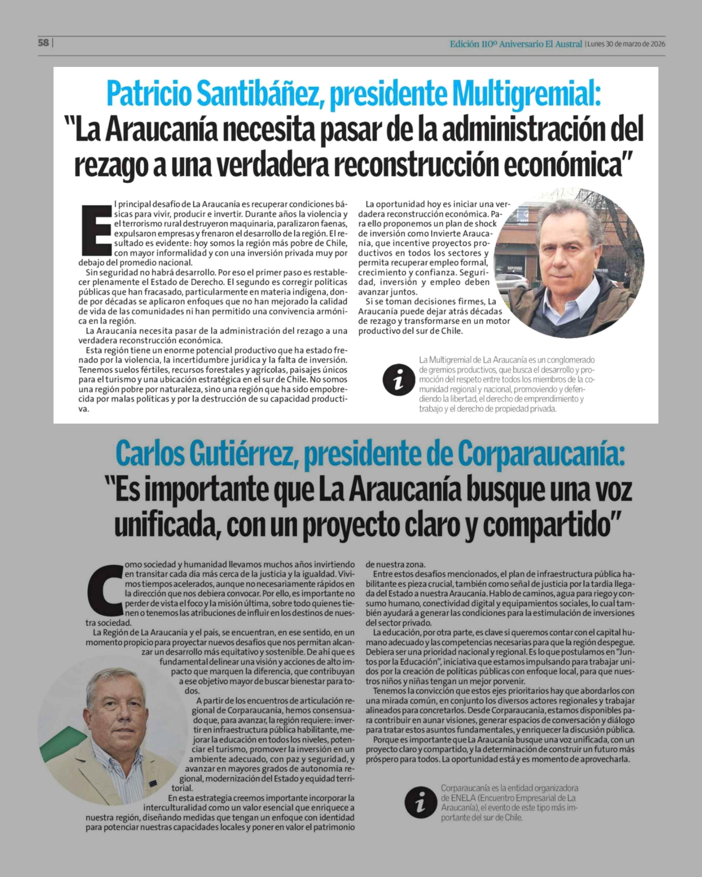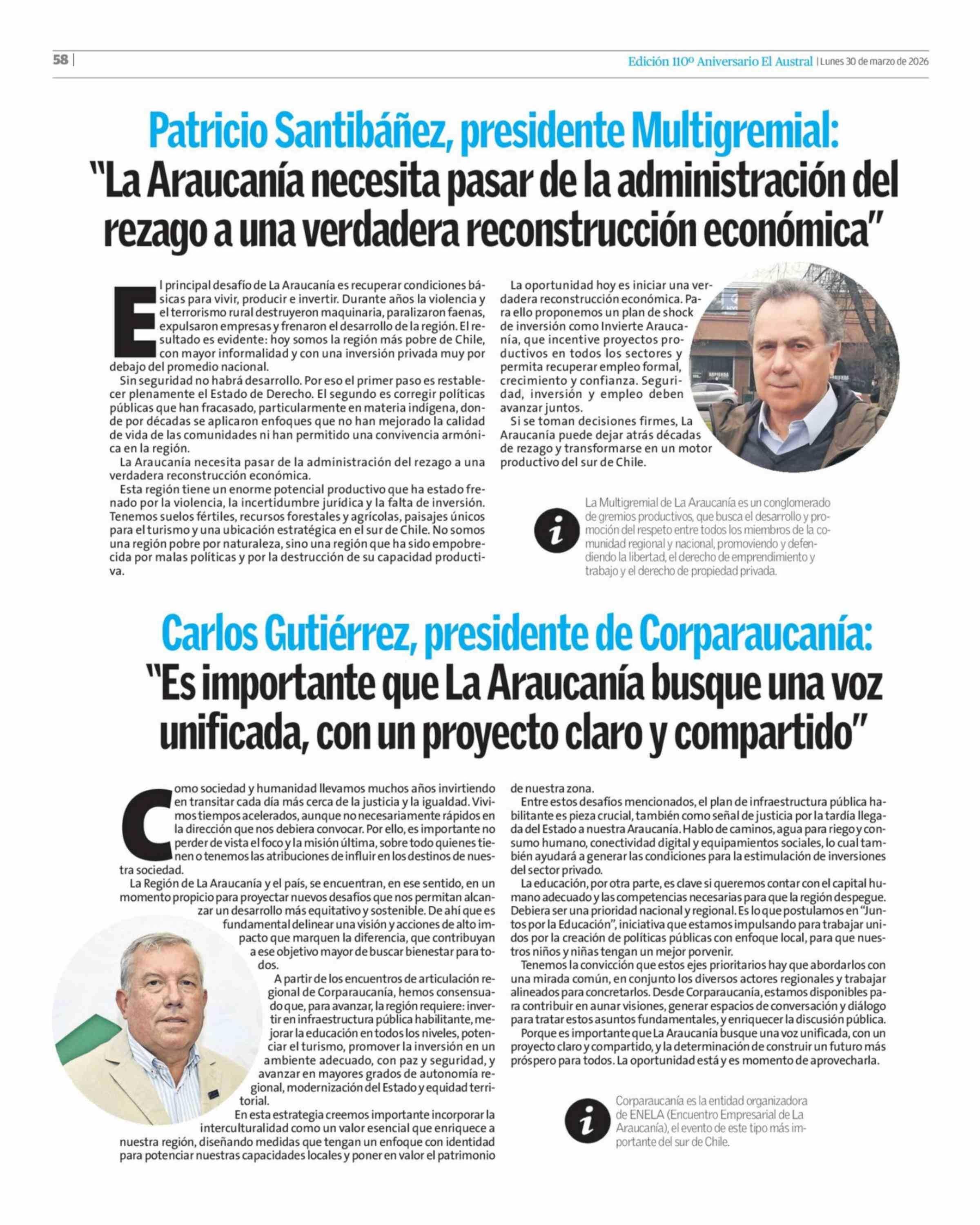 | Título: | Columnas de Opinión: Patricio Santibáñez, presidente Multigremial: "La Araucanía necesita pasar de la administración del rezago a una verdadera reconstrucción económica" |