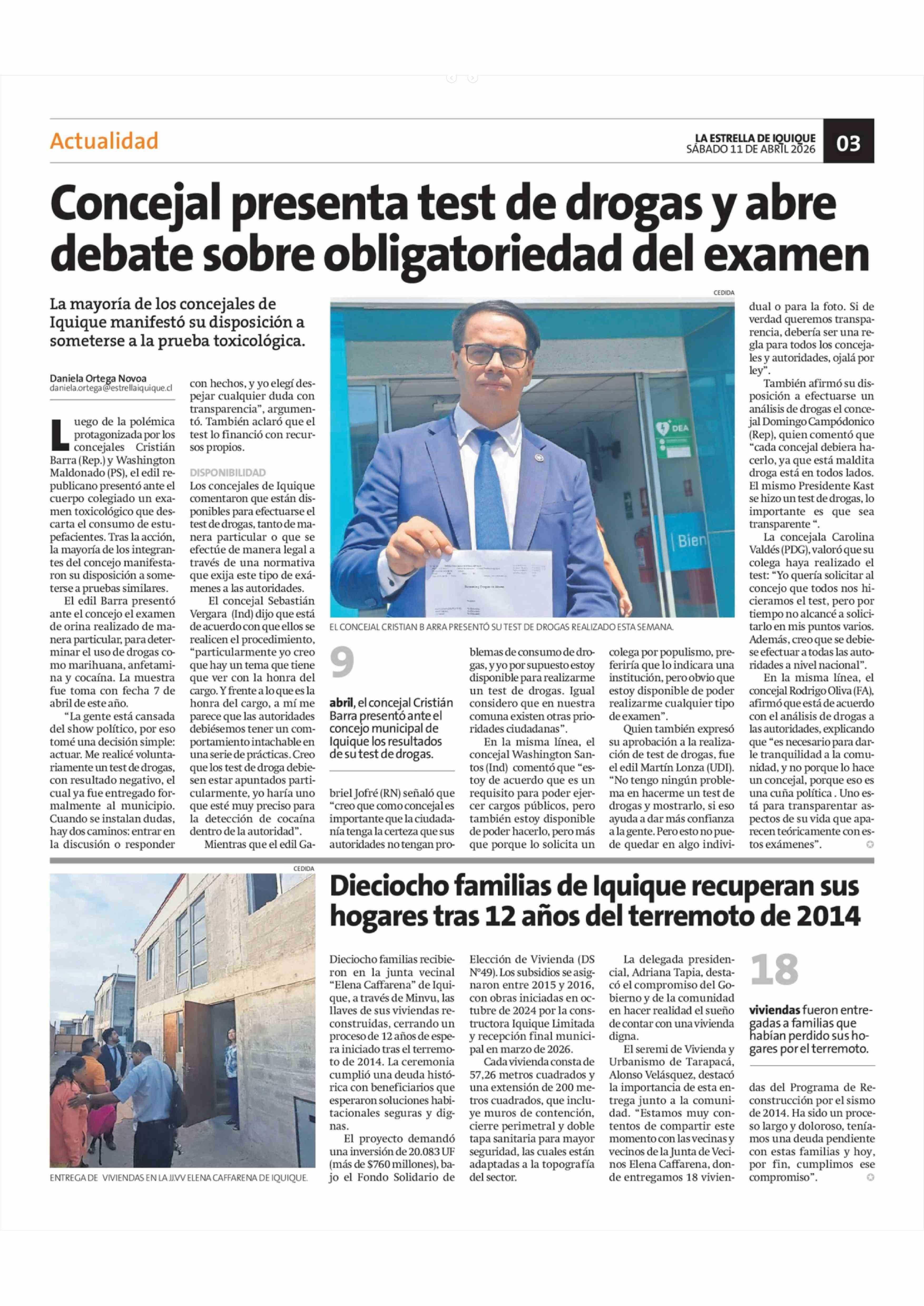 Dieciocho familias de Iquique recuperan sus hogares tras 12 años del terremoto de 2014 11-04-2026 La Estrella de Iquique |