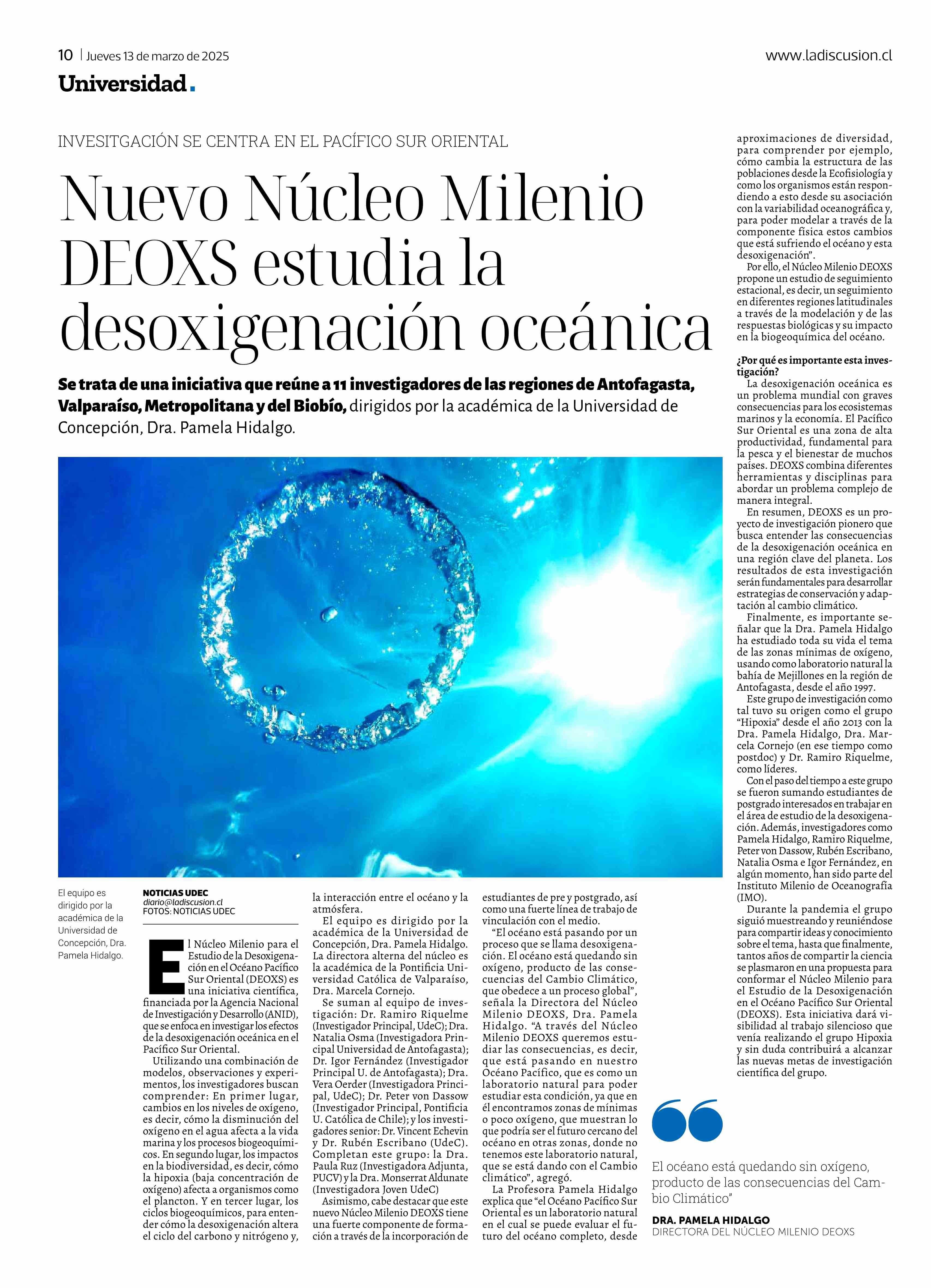 Nuevo Núcleo Milenio DEOXS estudia la desoxigenación oceánica 13-03-2025 La Discusión |