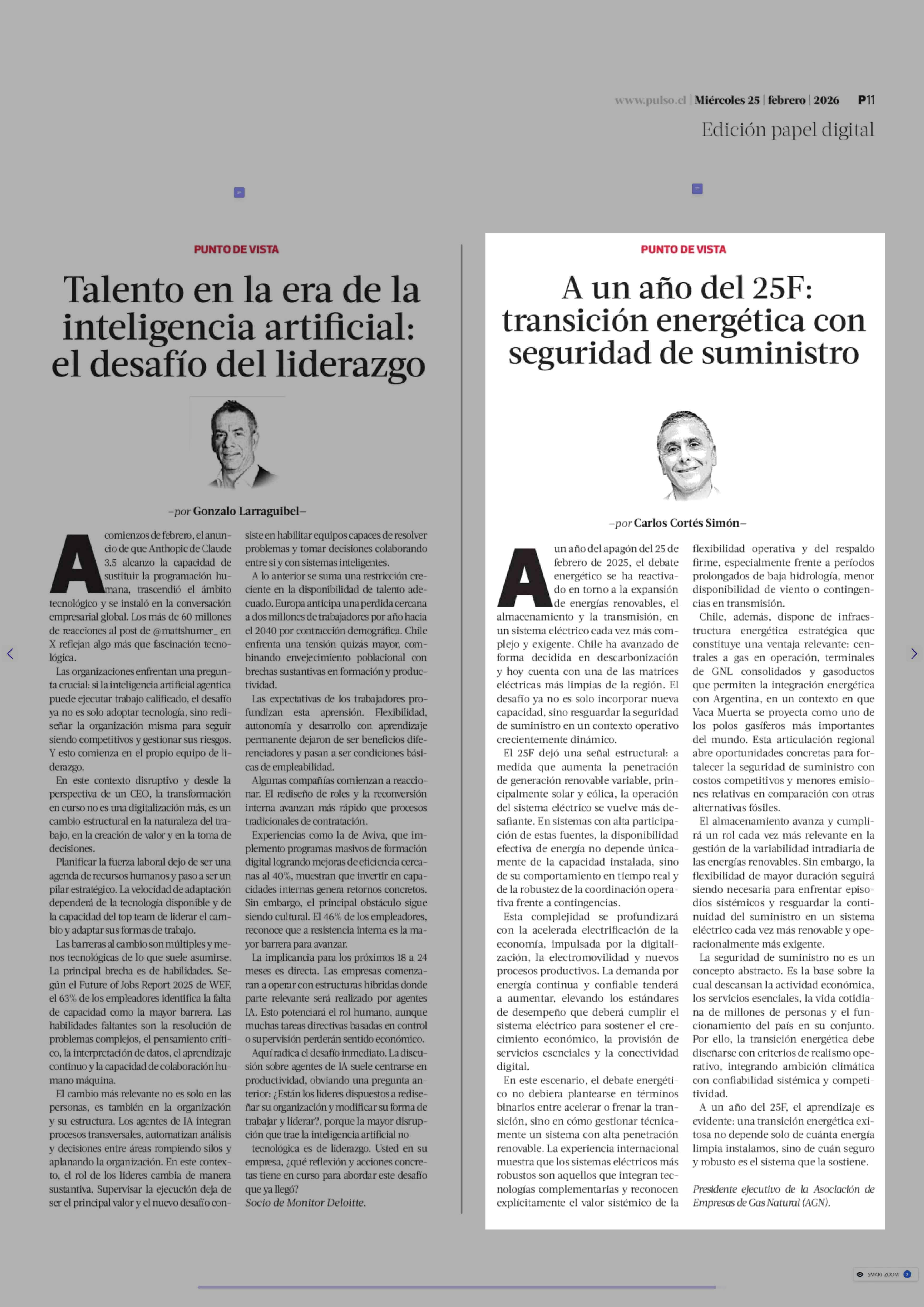 Columnas de Opinión: A un año del 25F: transición energética con seguridad de suministro 25-02-2026 La Tercera |