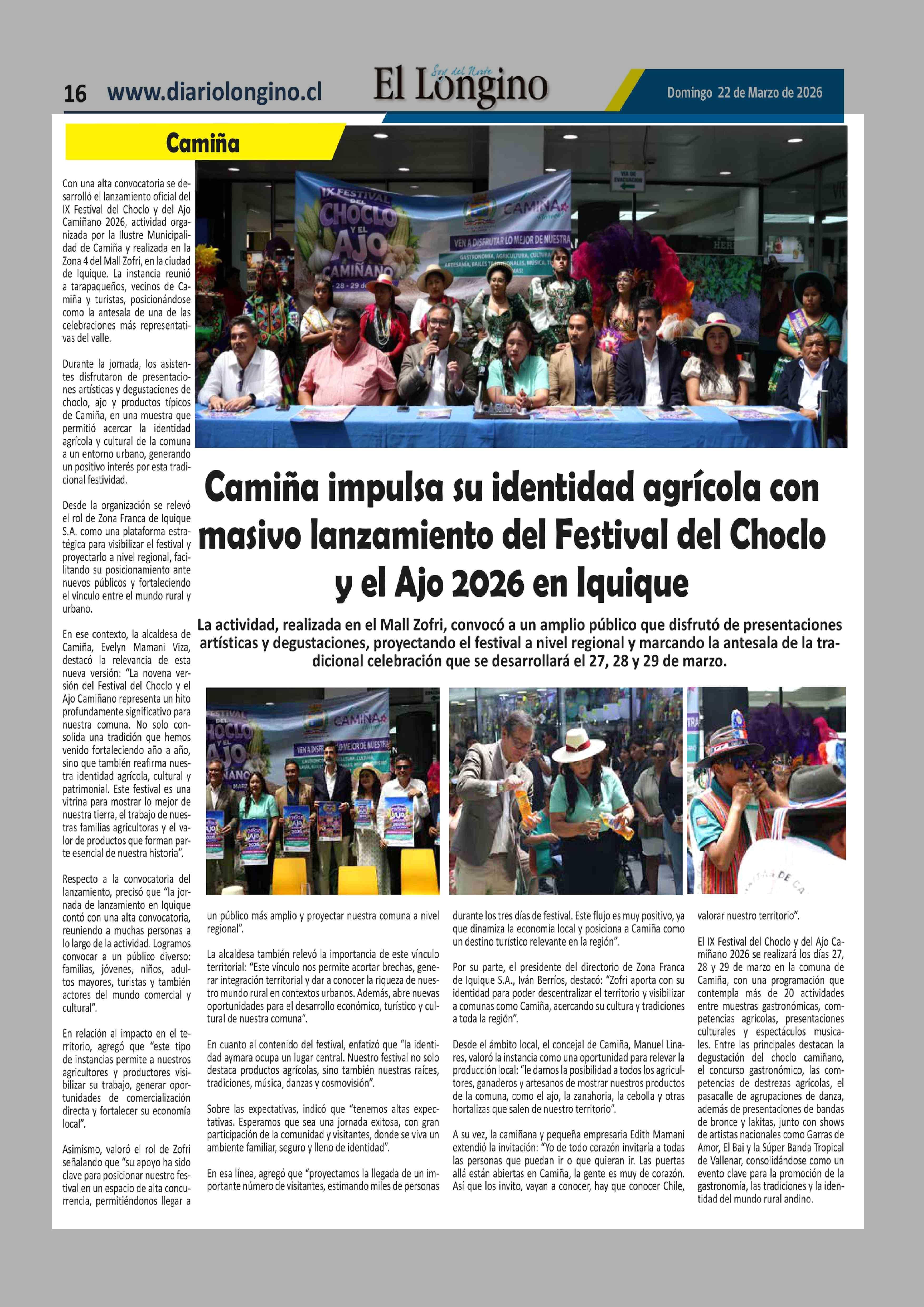 | Título: | Camiña impulsa su identidad agrícola con masivo lanzamiento del Festival del Choclo y el Ajo 2026 en Iquique |