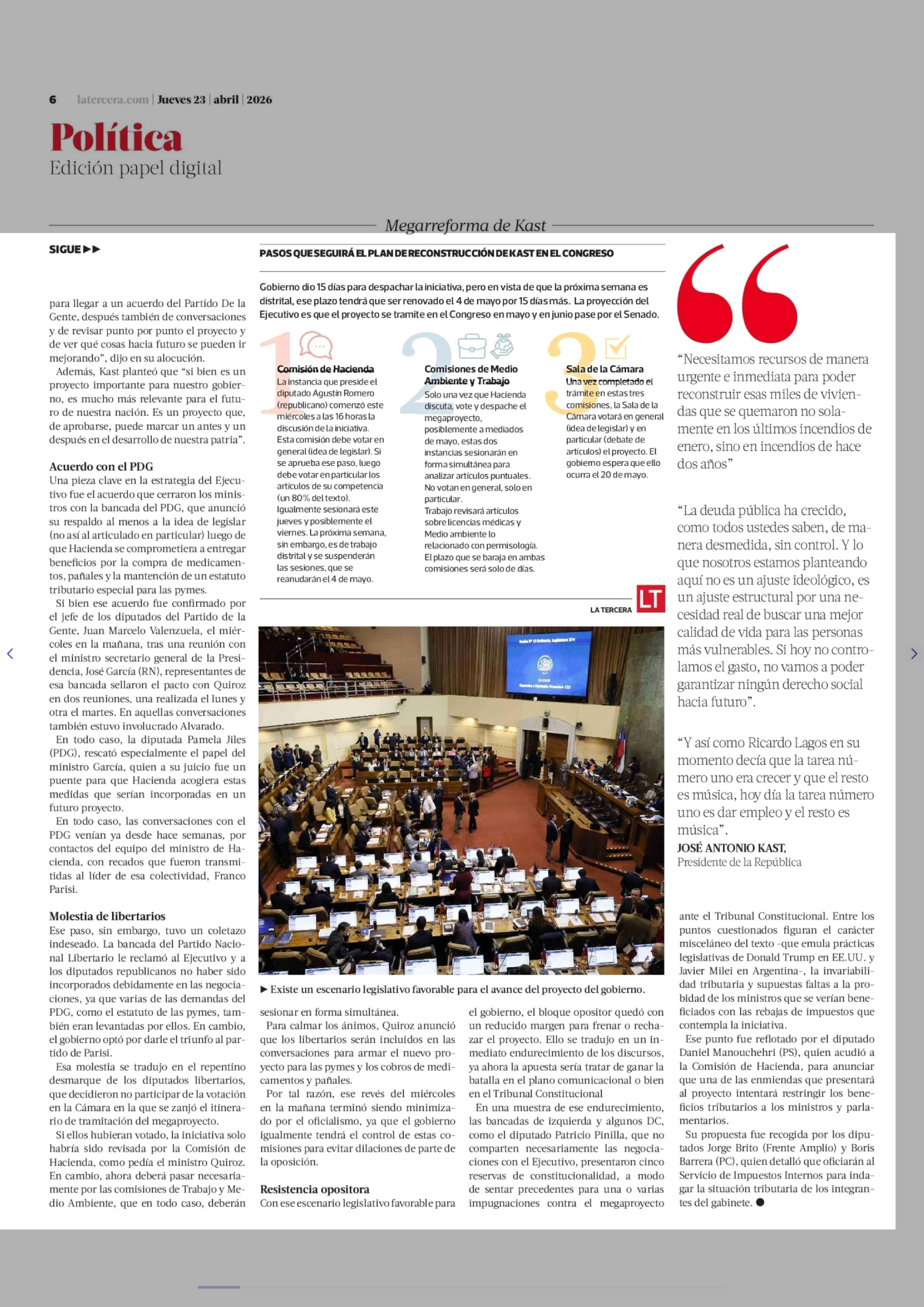 Kast ingresa megaproyecto con piso asegurado de votos a pesar de fuerte resistencia en la izquierda 23-04-2026 La Tercera |