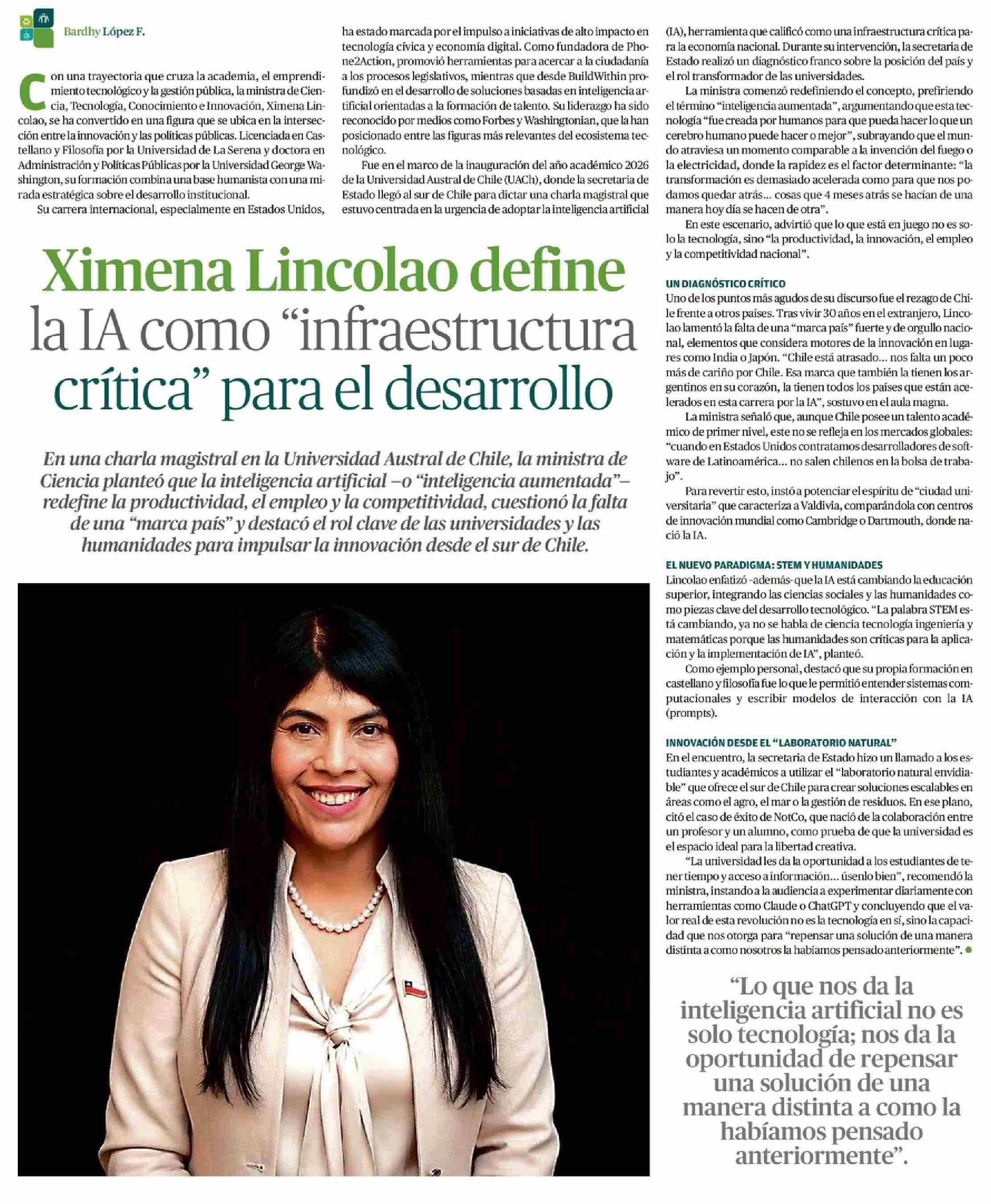 Ximena Lincolao define la IA como “infraestructura crítica” para el desarrollo 19-04-2026 El Austral de Osorno |