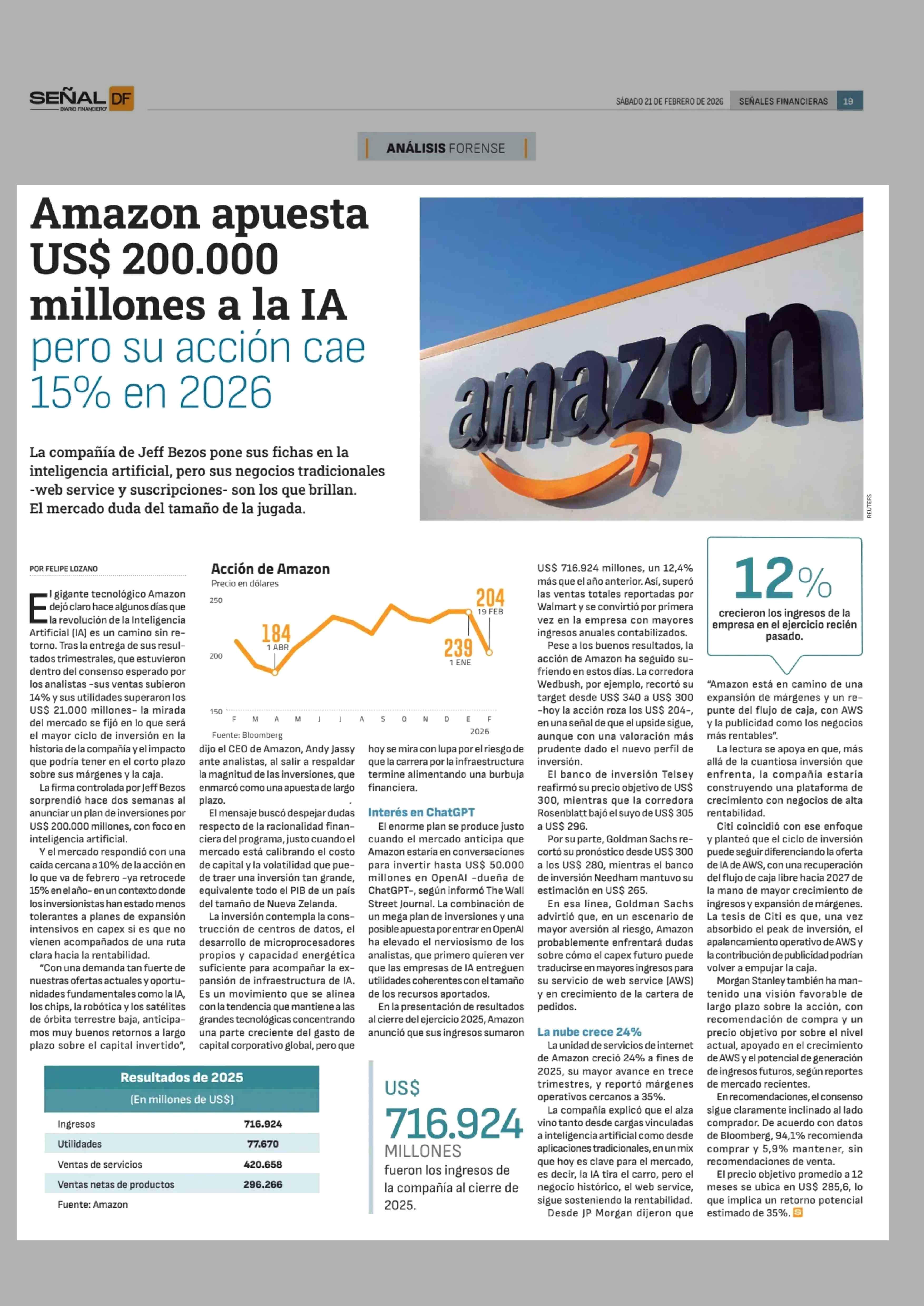 Título: Amazon apuesta US$ 200.000 millones a la IA pero su acción cae 15% en 2026
