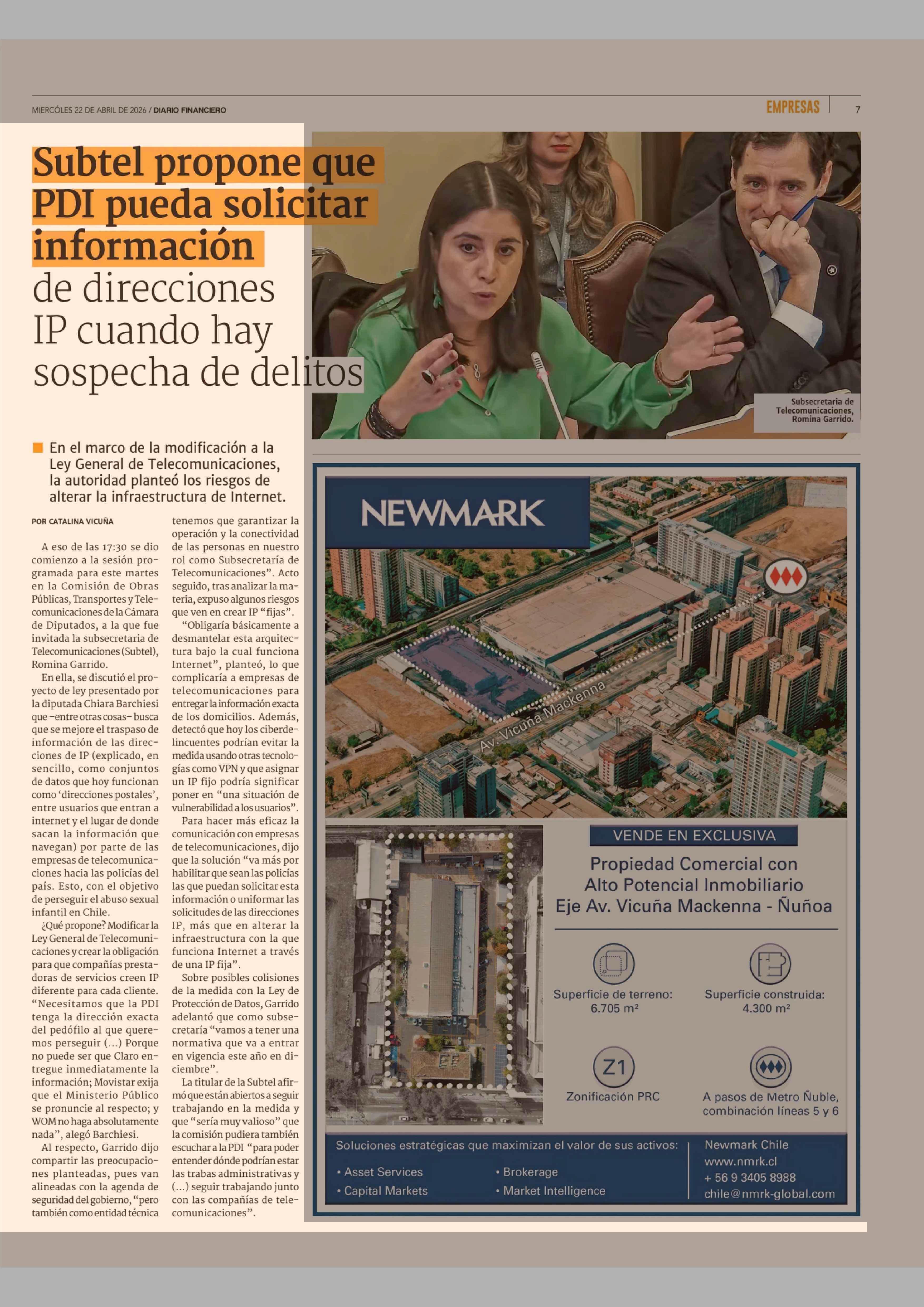 Subtel propone que PDI pueda solicitar información de direcciones IP cuando hay sospecha de delitos 22-04-2026 Diario Financiero |