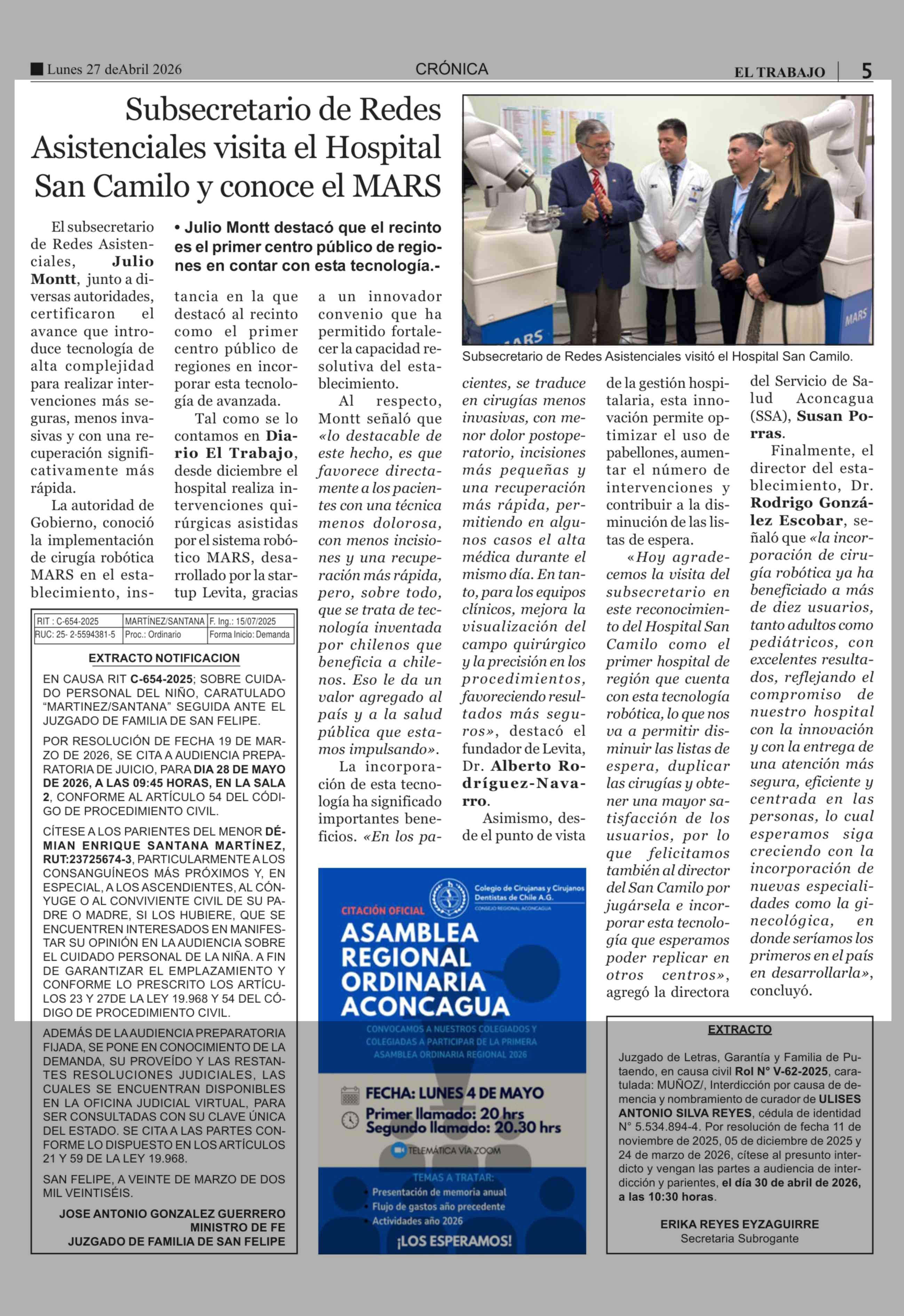 Subsecretario de Redes Asistenciales visita el Hospital San Camilo y conoce el MARS 27-04-2026 El Trabajo |