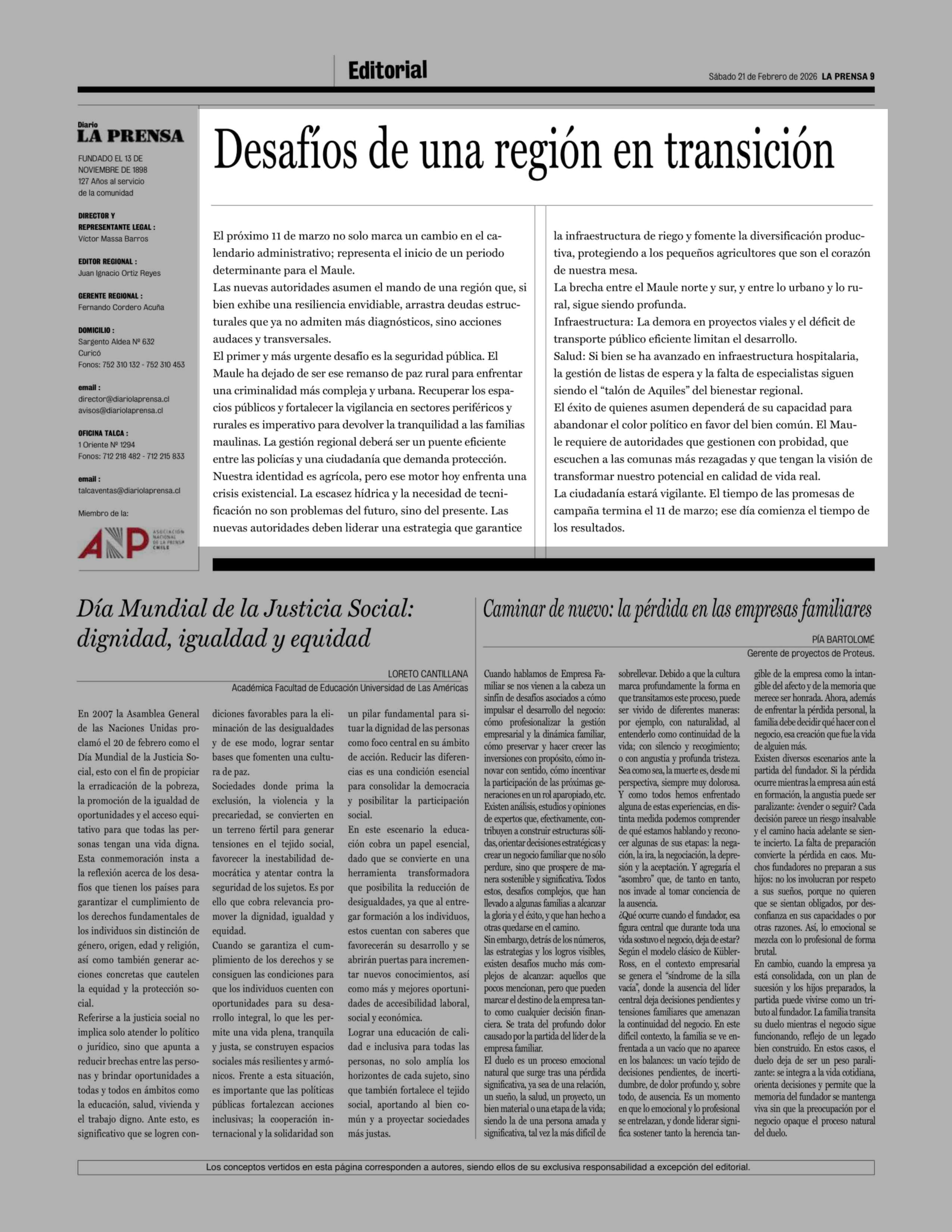 Editorial: Desafíos de una región en transición 21-02-2026 La Prensa de Curicó |