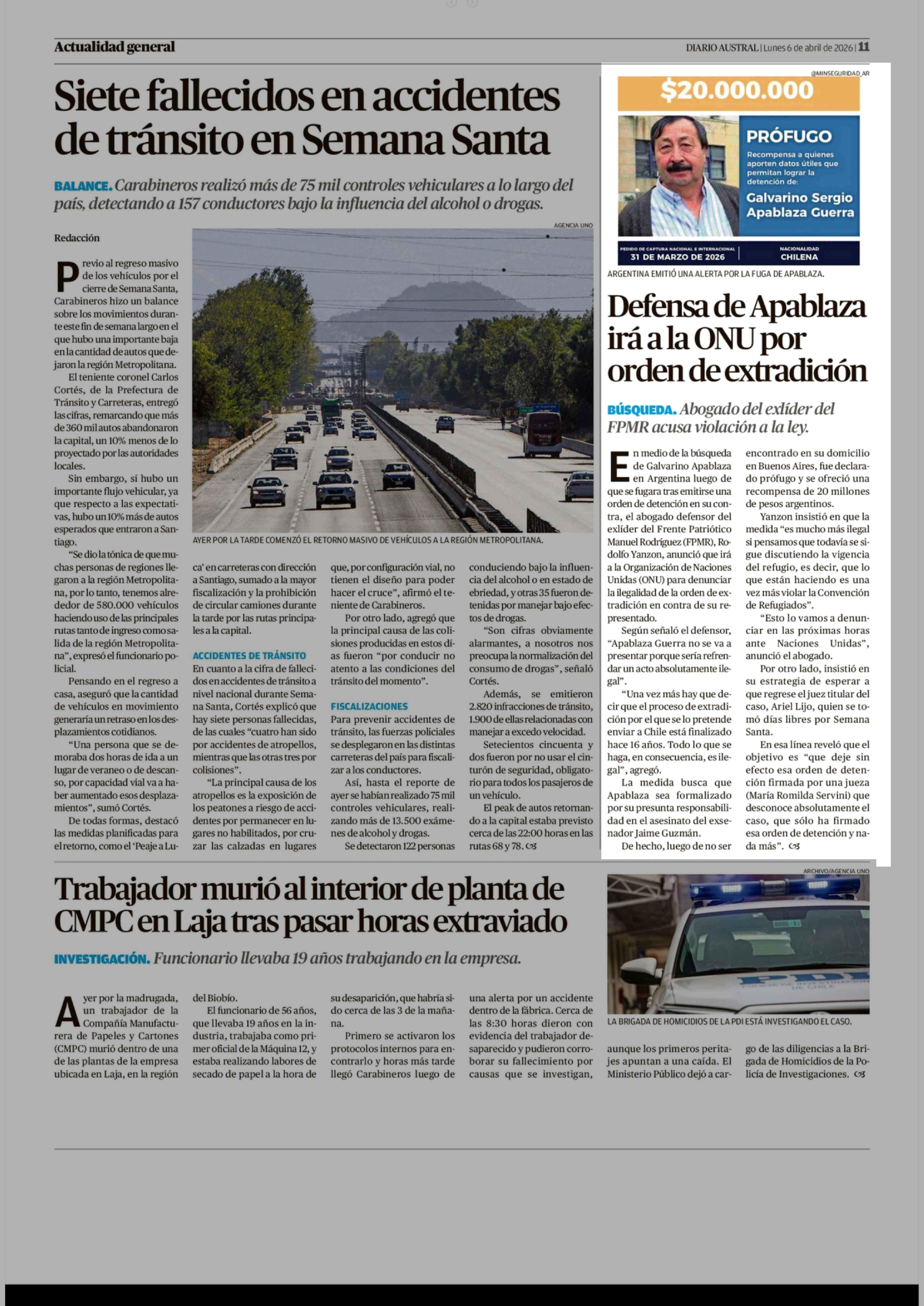 Defensa de Apablaza irá a la ONU por orden de extradición 06-04-2026 Diario Austral Región de Los Ríos |