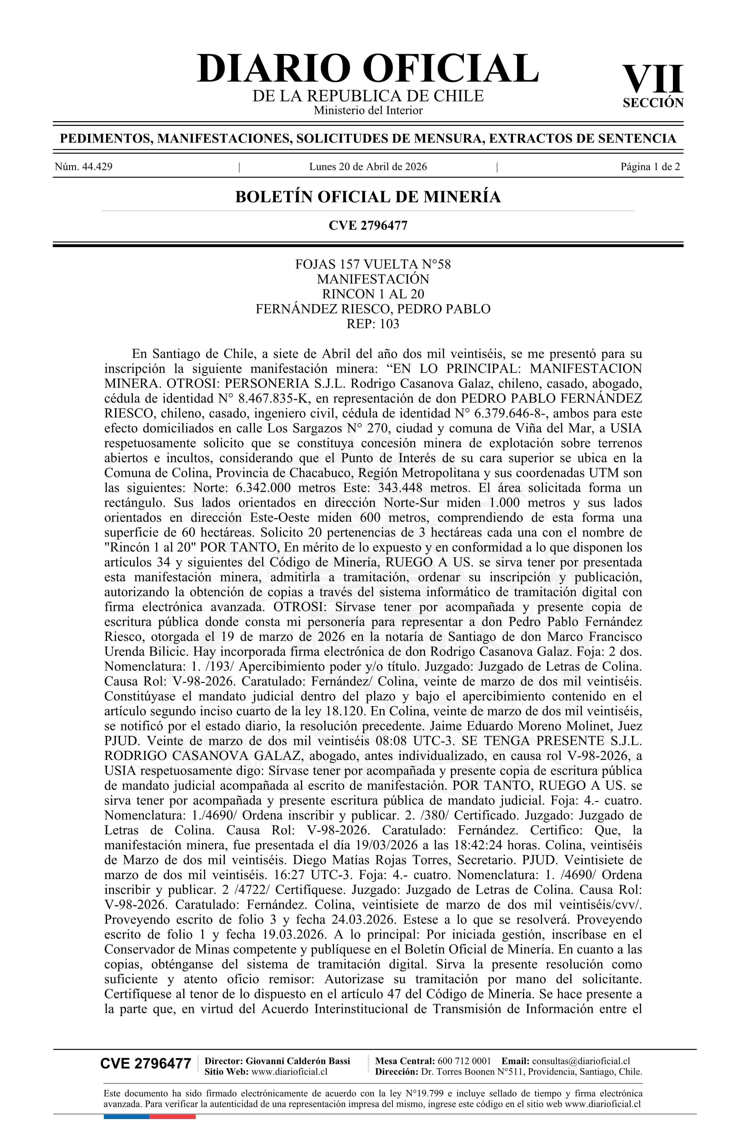 RINCON 1 AL 20 / Fernández Riesco Pedro Pablo 20-04-2026 DIARIO OFICIAL CHILE - BOLETÍN OFICIAL DE MINERÍA |