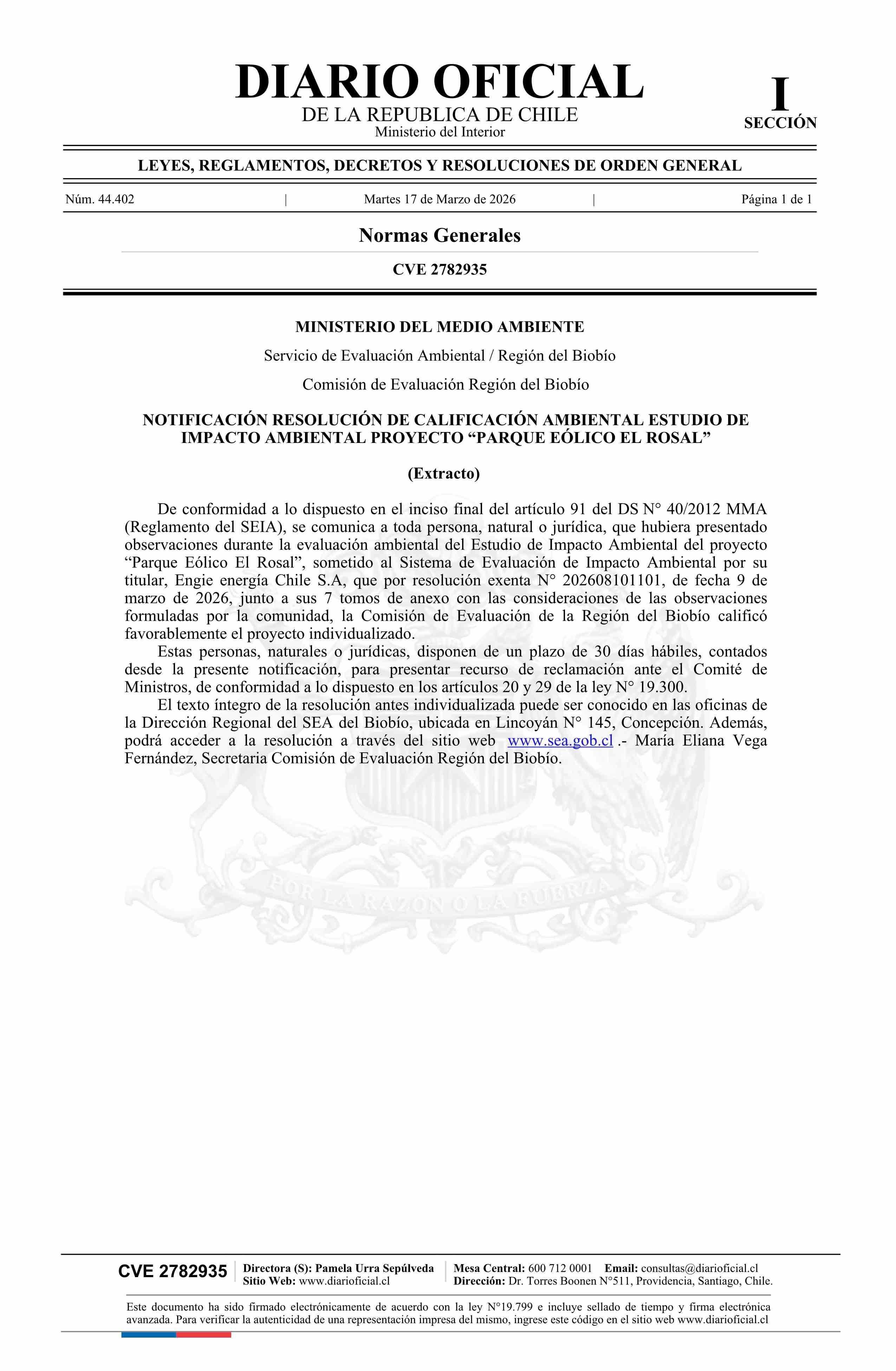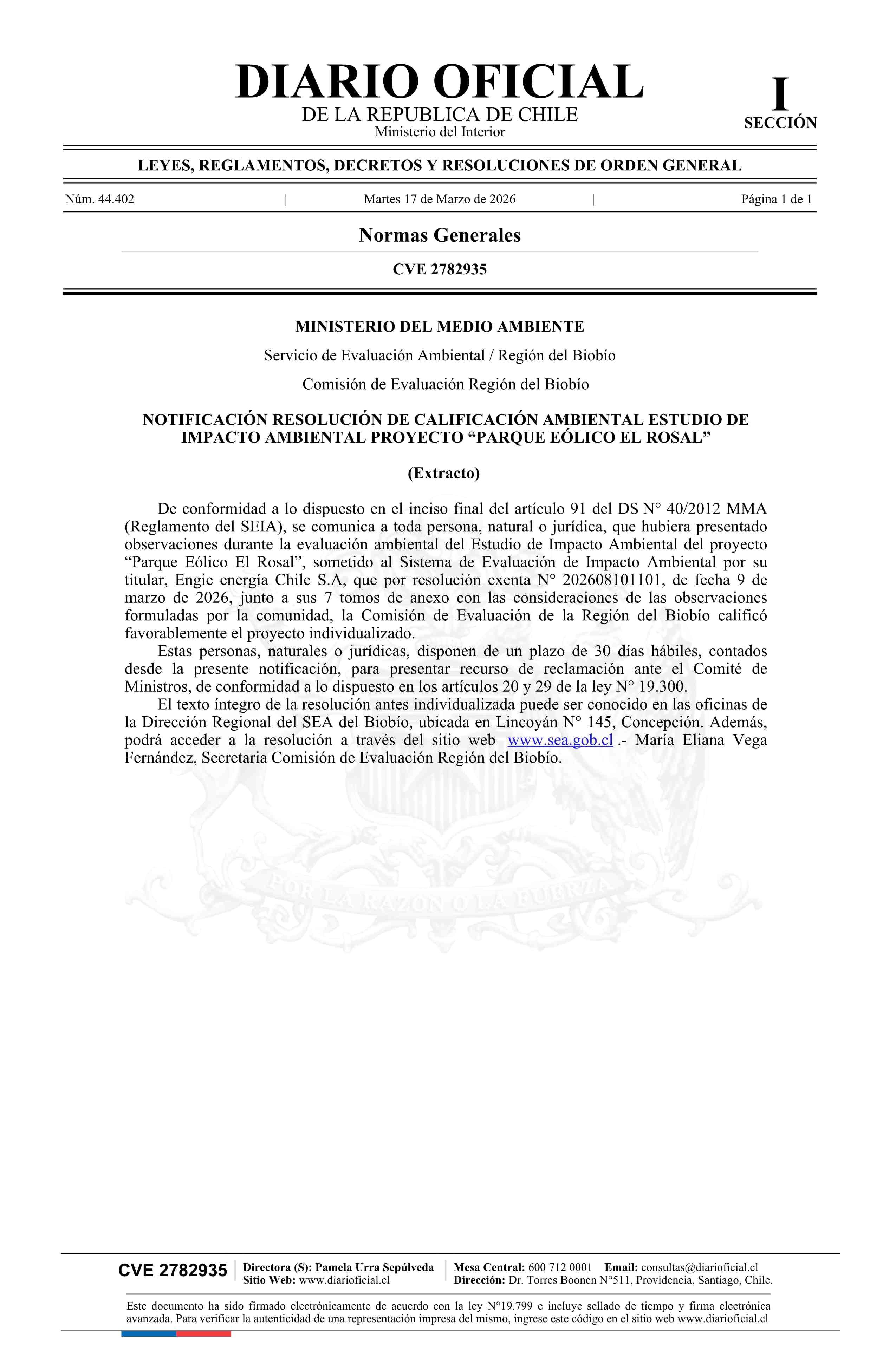 Extracto de resolución exenta número 202608101101, de 2026.- Notifica Resolución de Calificación Ambiental del Estudio de Impacto Ambiental del proyecto Parque Eólico El Rosal 17-03-2026 Diario Oficial Edición Electrónica |