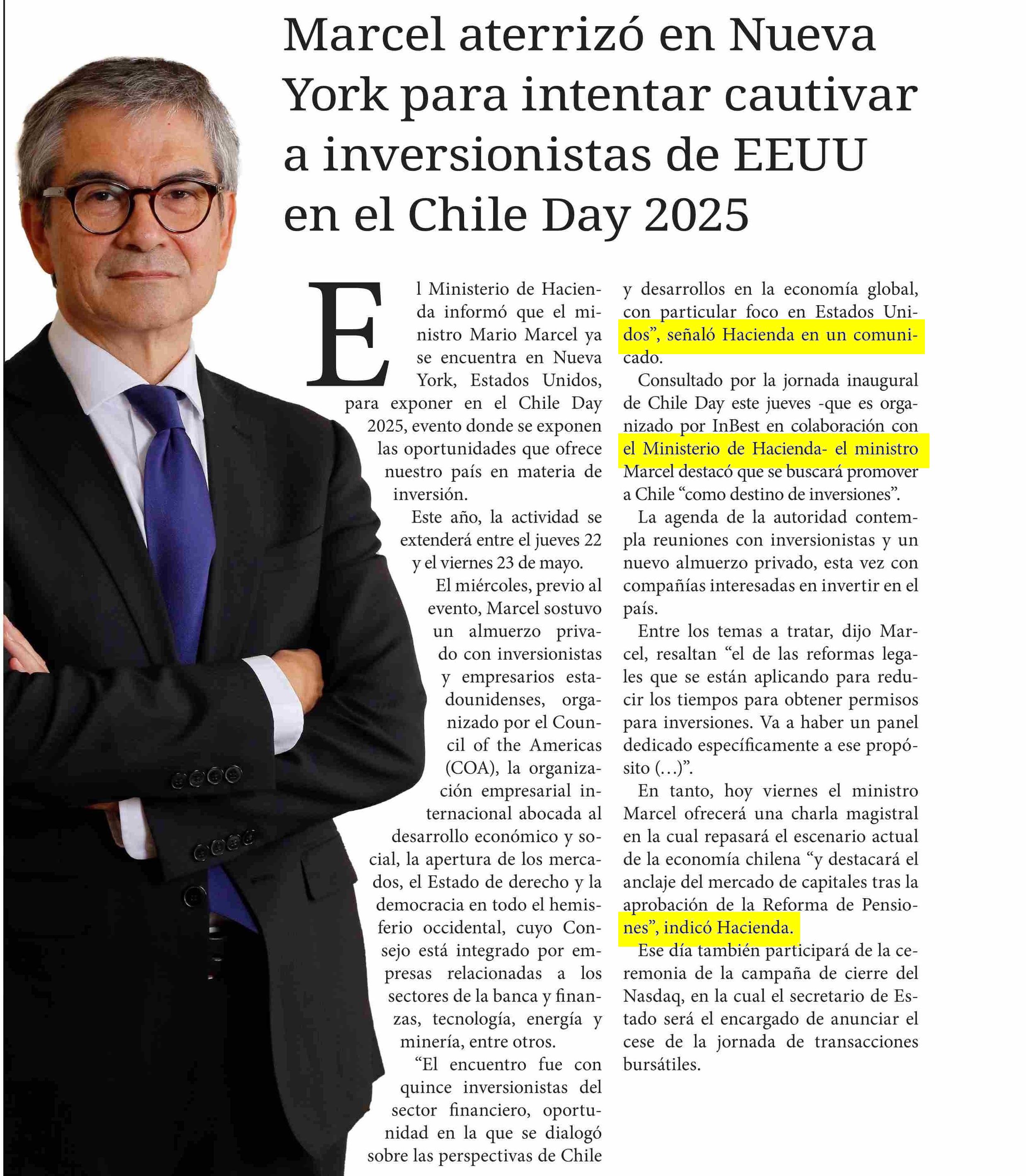 Marcel aterrizó en Nueva York para intentar cautivar a inversionistas de EEUU en el Chile Day 2025 23-05-2025 Diario Chañarcillo |